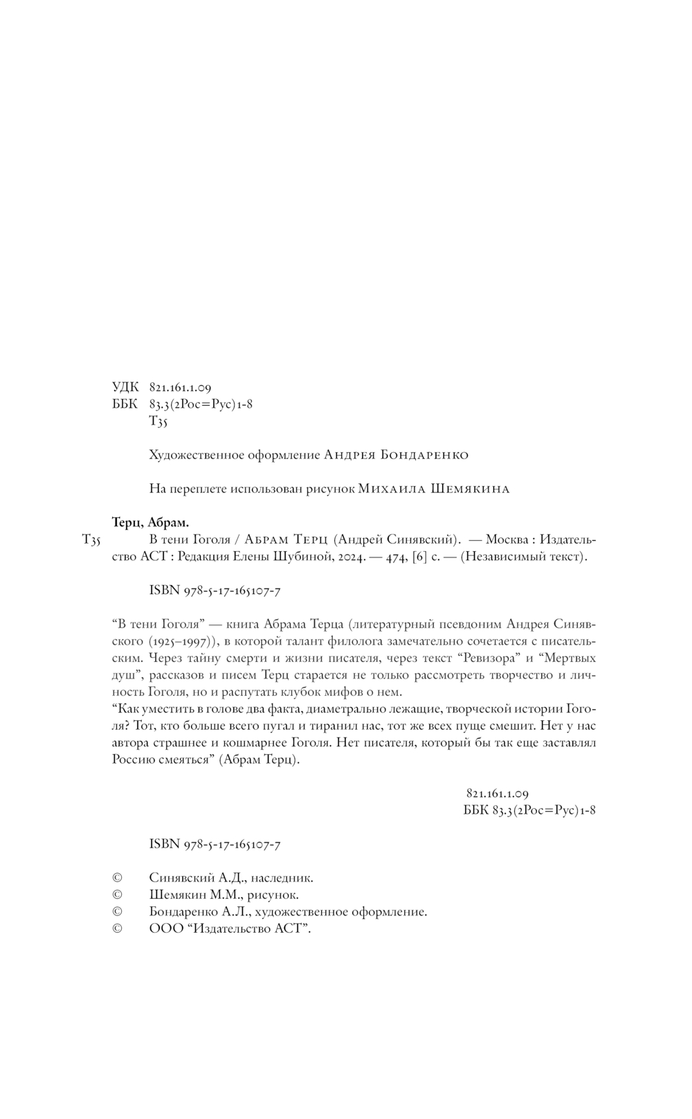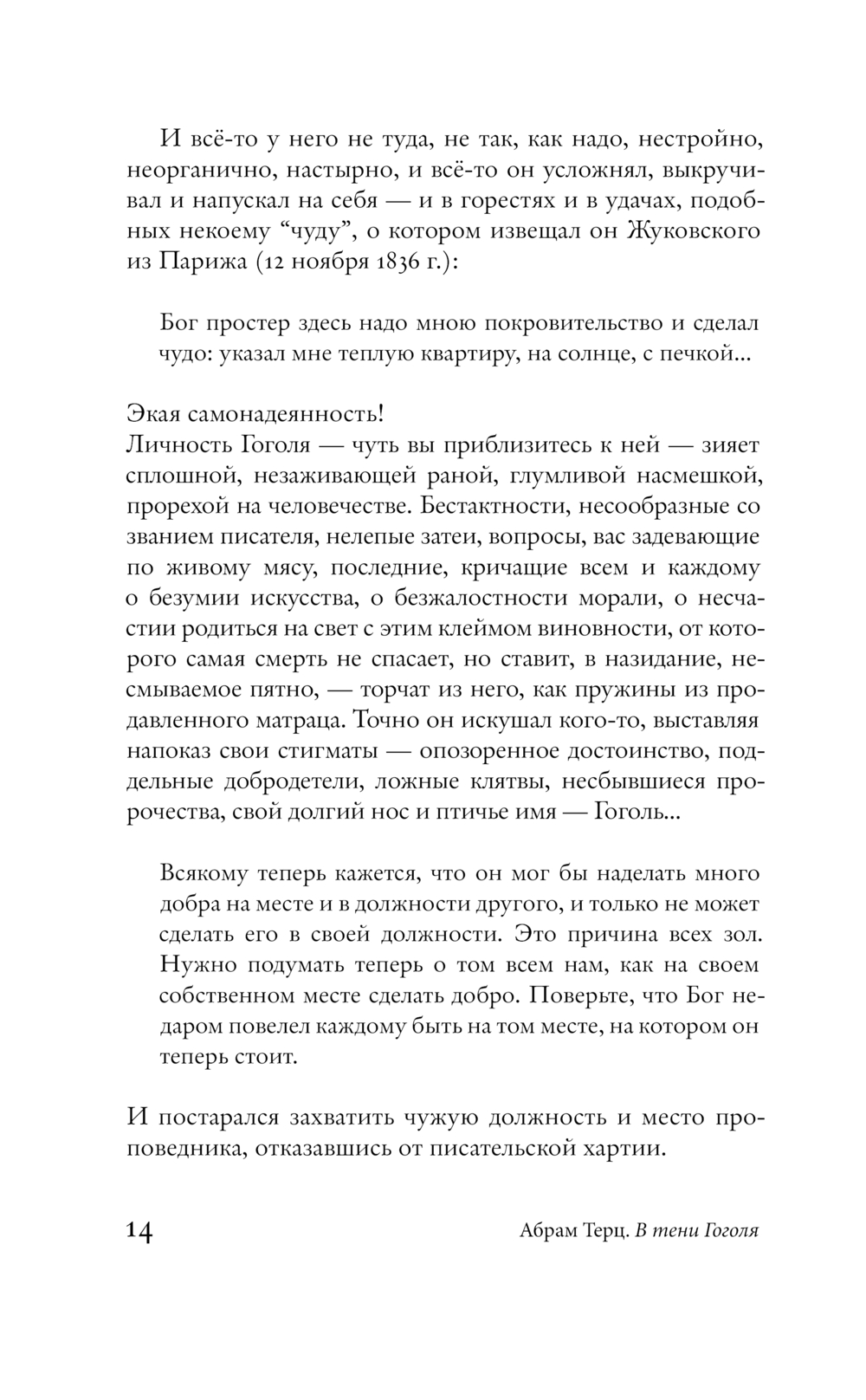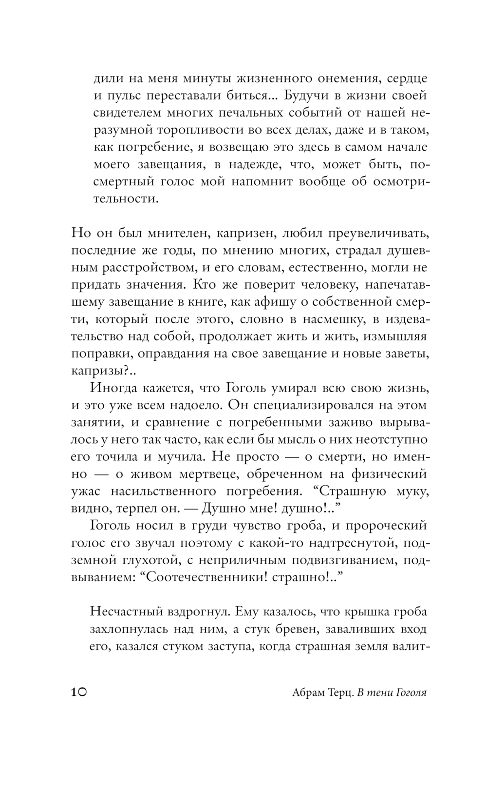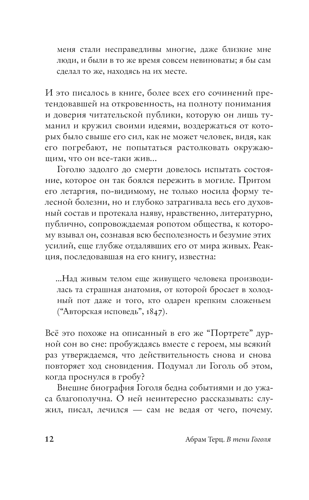 "В тени Гоголя" – книга, в которой талант филолога замечательно сочетается с писательским. Через тайну смерти и жизни писателя, через текст "Ревизора" и "Мертвых душ", рассказов и писем Терц старается не только рассмотреть творчество и личность Гоголя, но и распутать клубок мифов о нем.