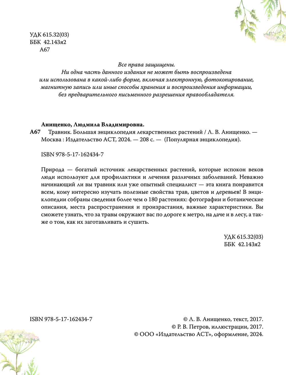Природа – богатый источник лекарственных растений, которые испокон веков люди используют для профилактики и лечения различных заболеваний. Неважно начинающий ли вы травник или уже опытный специалист – эта книга понравится всем, кому интересно изучать полезные свойства трав, цветов и деревьев! В энциклопедии собраны сведения более чем о 180 растениях: фотографии и ботанические описания, места распространения и произрастания, важные характеристики. Вы сможете узнать, что за травы окружают вас по дороге к метро, на даче и в лесу, а также о том, как их заготавливать и сушить.