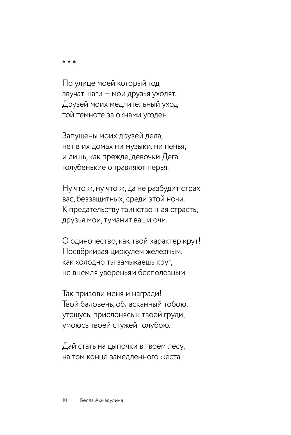 Она писала с детства – трогательные, нежные строки привлекли внимание друзей, а позже подарили всенародное признание. Её стихотворения переведены на десятки языков, что открыло миру таинственно-прекрасную лирику, полную возвышенных метафор и изысканной музыкальности. "Я вас люблю, красавицы столетий...", "Из глубины моих невзгод...", "По улице моей который год...", "А напоследок я скажу..." – голос Б. Ахмадулиной невозможно перепут ать с чьим-то другим.
