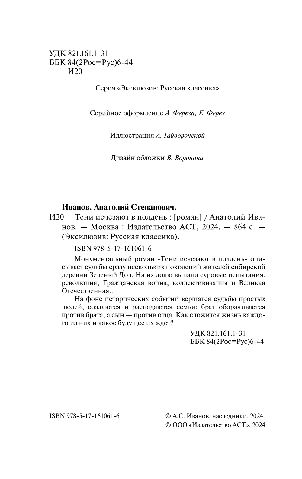 Монументальный роман "Тени исчезают в полдень" описывает судьбы сразу нескольких поколений жителей сибирской деревни Зеленый Дол. На их долю выпали суровые испытания: революция, Гражданская война, коллективизация и Великая Отечественная...