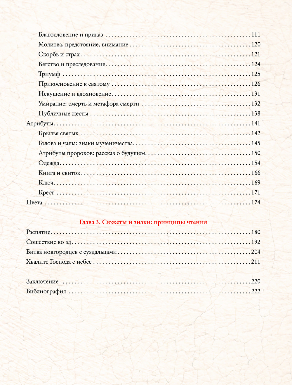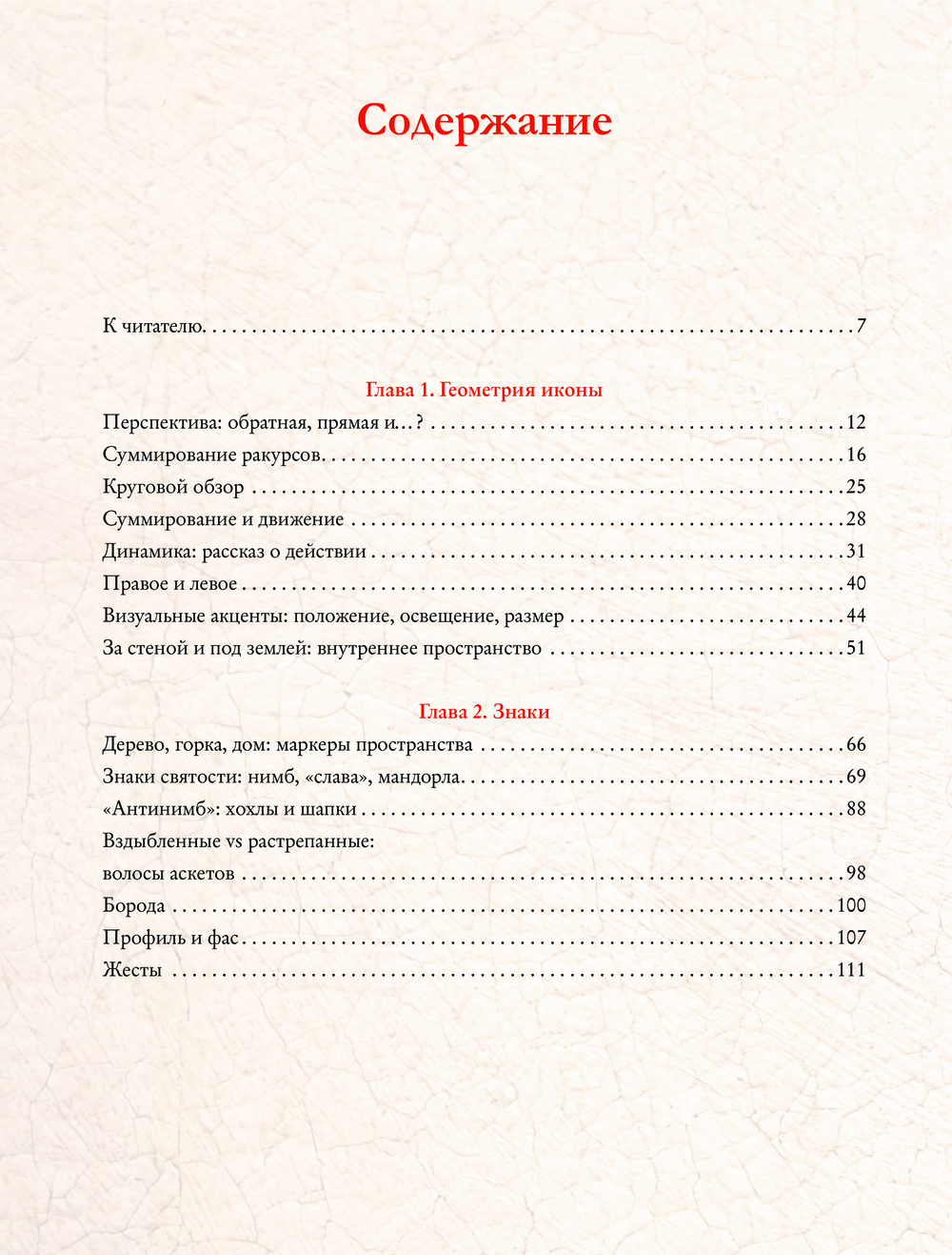 В первой главе описаны геометрические принципы, которые позволяют иконописцам рассказывать о пространстве и об изображаемых предметах. В следующих главах речь идет о знаках – малозаметных элементах, из которых строится любой визуальный рассказ, и о мотивах, повторяющихся в разных композициях. Наконец, в последней главе автор рассматривает необычные вариации некоторых сюжетов.