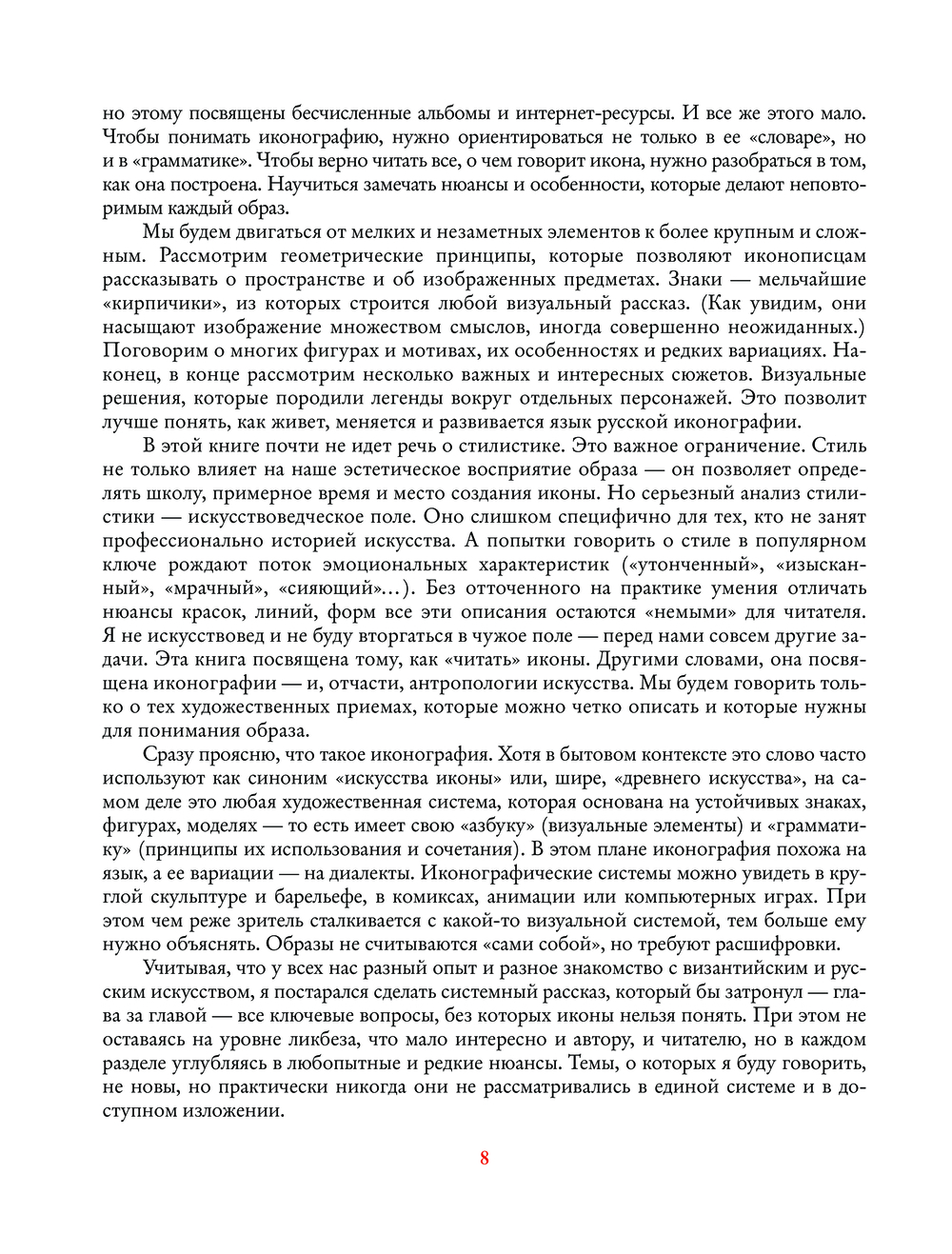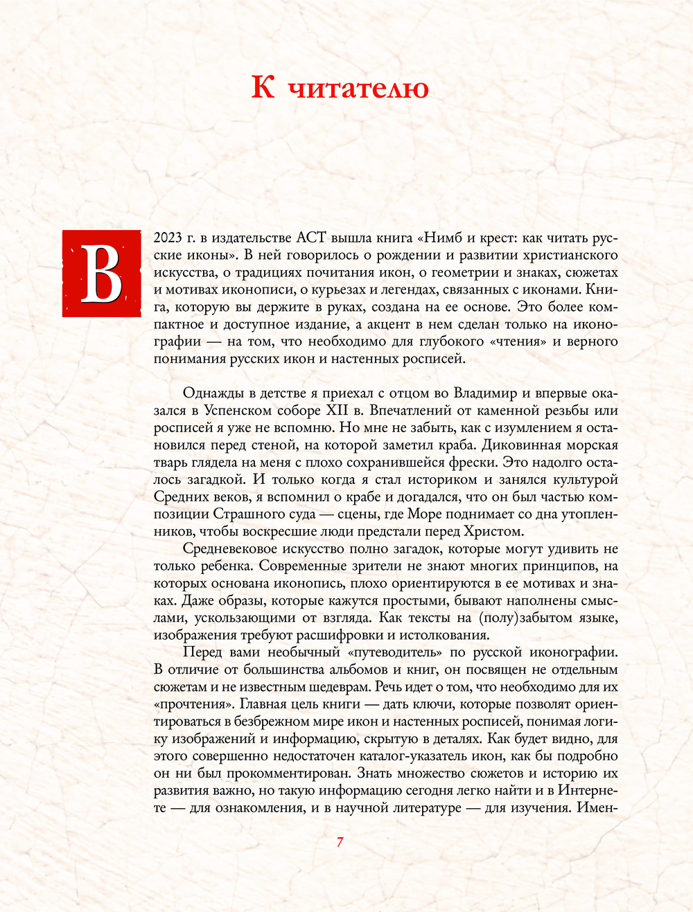 Перед вами не обычная энциклопедия по русской иконописи. Главная цель этой книги – дать читателям ключи, которые позволят ориентироваться в мире икон и настенных росписей. Понимать логику изображений и видеть информацию, скрытую в деталях. Автор шаг за шагом показывает, как можно "читать" иконы и как разбираться в интересных нюансах, скрывающихся в каждом сюжете.