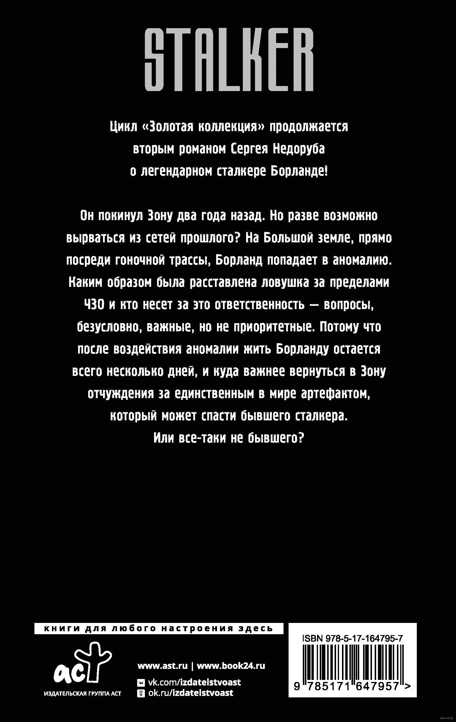Он покинул Зону два года назад. Но разве возможно вырваться из сетей прошлого? На Большой земле, прямо посреди гоночной трассы, Борланд попадает в аномалию. Каким образом была расставлена ловушка за пределами ЧЗО и кто несет за это ответственность – вопросы, безусловно, важные, но не приоритетные. Потому что после воздействия аномалии жить Борланду остается всего несколько дней, и куда важнее вернуться в Зону отчуждения за единственным в мире артефактом, который может спасти бывшего сталкера.