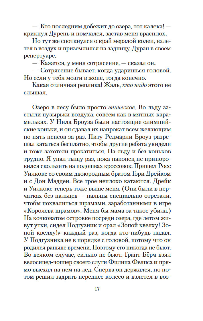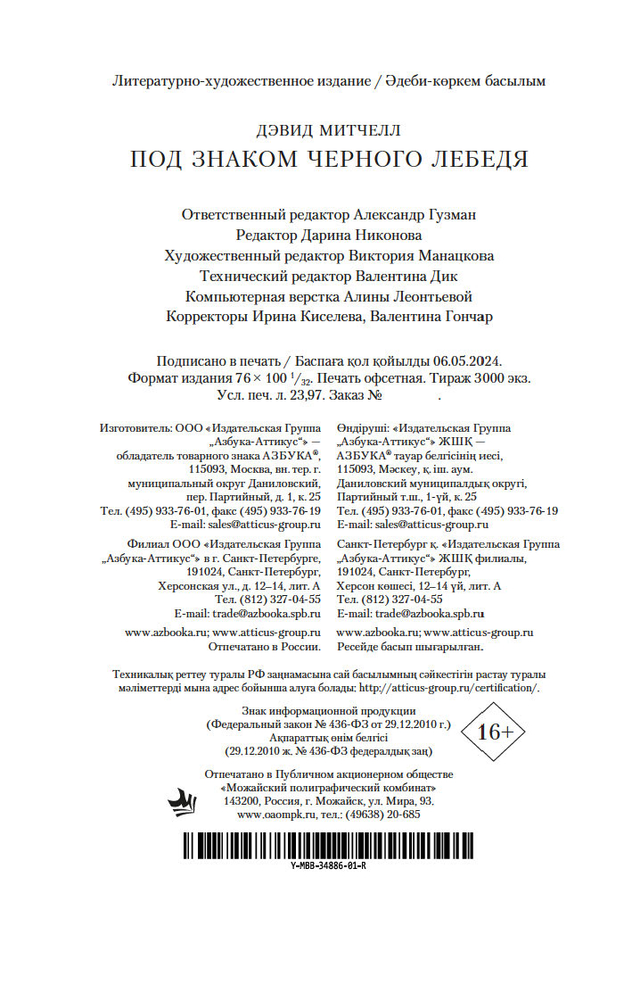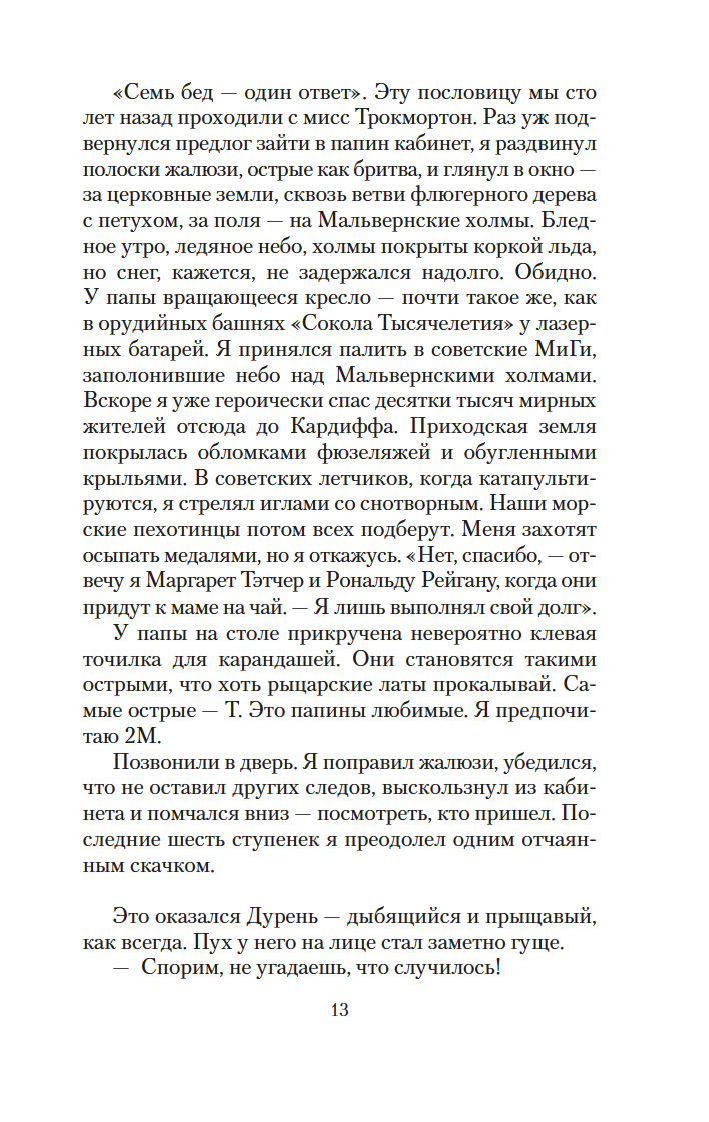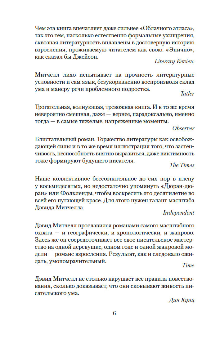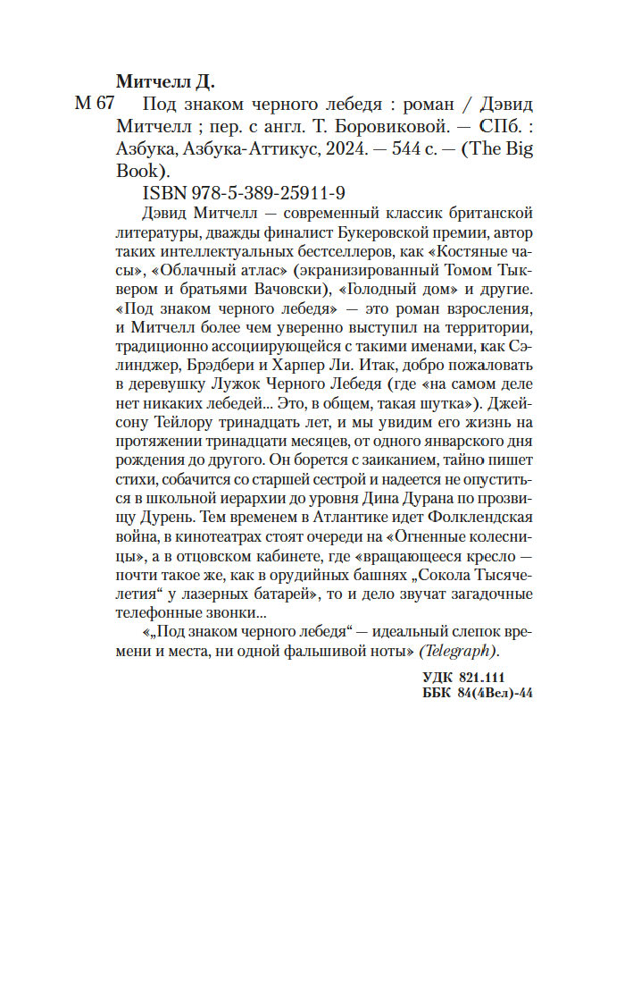 Дэвид Митчелл – современный классик британской литературы, дважды финалист Букеровской премии, автор таких интеллектуальных бестселлеров, как "Костяные часы", "Облачный атлас" (экранизированный Томом Тыквером и братьями Вачовски), "Голодный дом" и другие. "Под знаком черного лебедя" – это роман взросления, и Митчелл более чем уверенно выступил на территории, традиционно ассоциирующейся с такими именами, как Сэлинджер, Брэдбери и Харпер Ли. Итак, добро пожаловать в деревушку Лужок Черного Лебедя (где "на самом деле нет никаких лебедей... Это, в общем, такая шутка"). Джейсону Тейлору тринадцать лет, и мы увидим его жизнь на протяжении тринадцати месяцев, от одного январского дня рождения до другого. Он борется с заиканием, тайно пишет стихи, собачится со старшей сестрой и надеется не опуститься в школьной иерархии до уровня Дина Дурана по прозвищу Дурень. Тем временем в Атлантике идет Фолклендская война, в кинотеатрах стоят очереди на "Огненные колесницы", а в отцовском кабинете, где "вращающееся кресло – почти такое же, как в орудийных башнях „Сокола Тысячелетия" у лазерных батарей", то и дело звучат загадочные телефонные звонки...