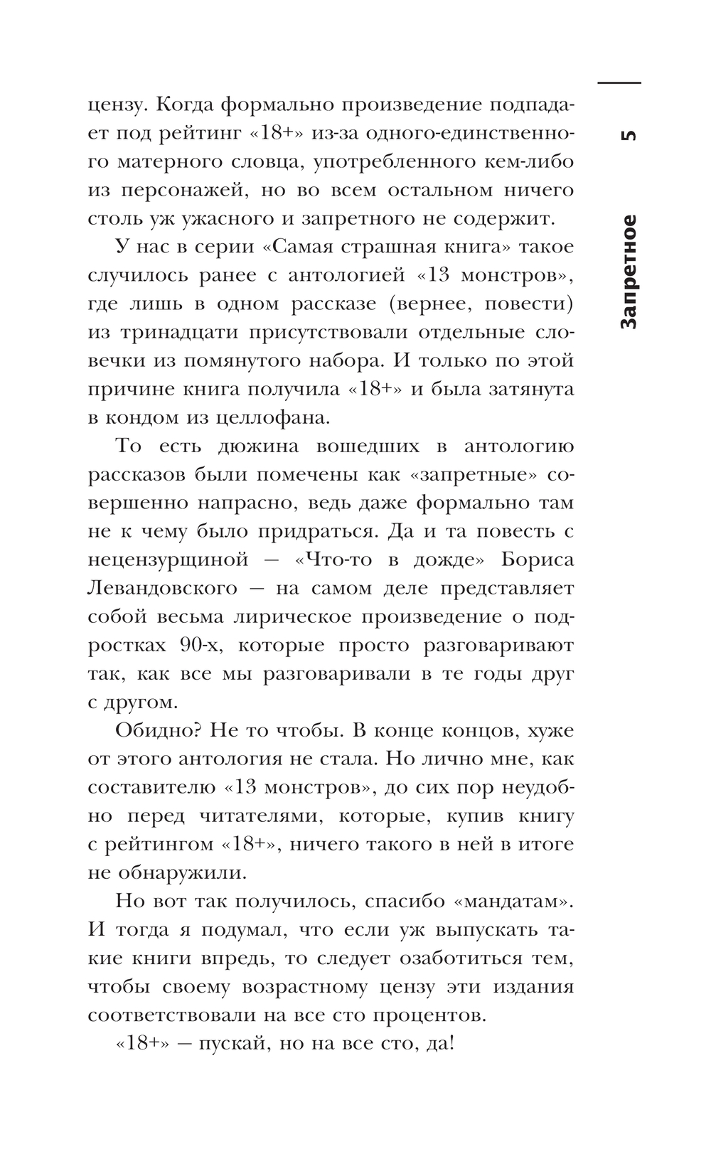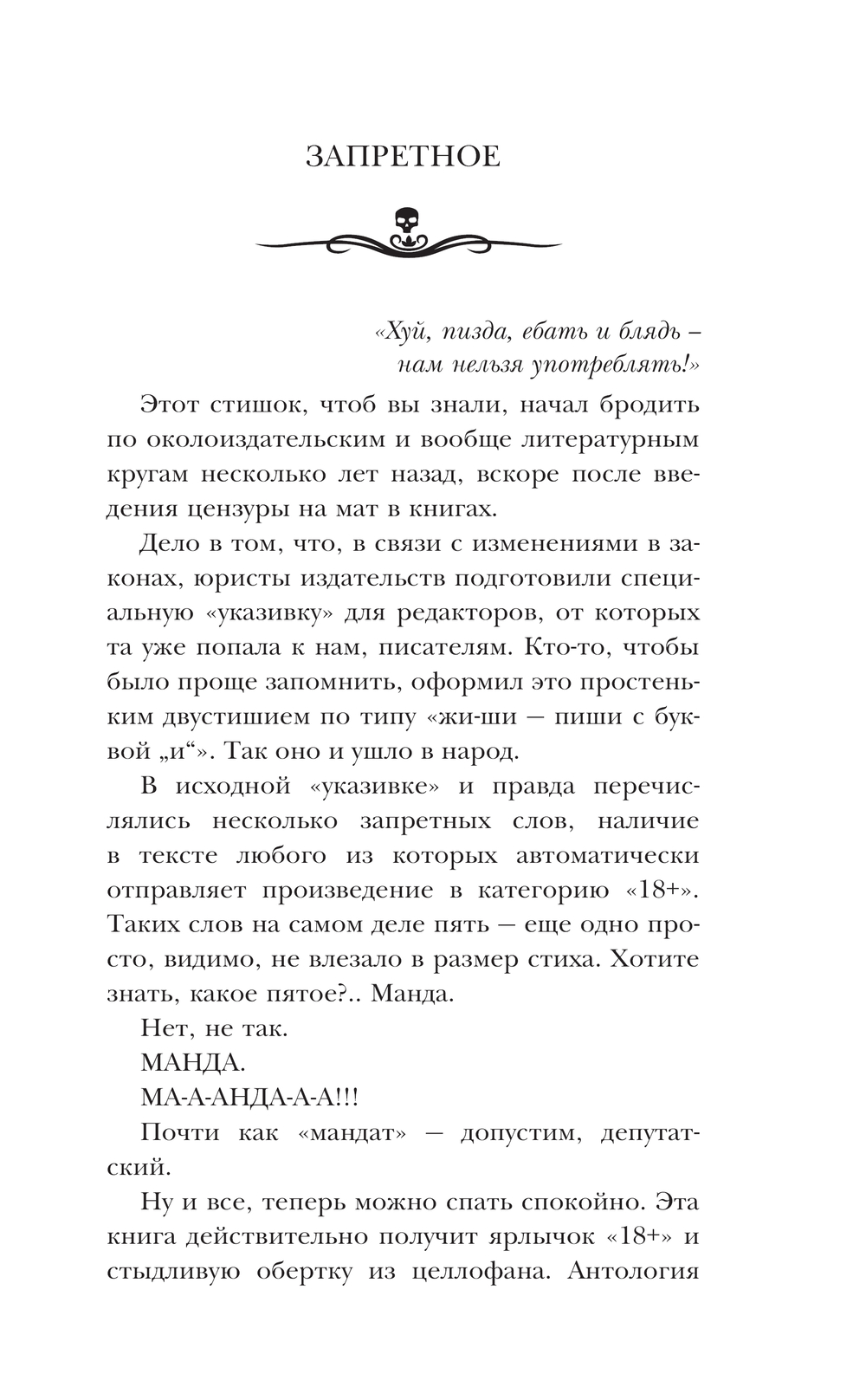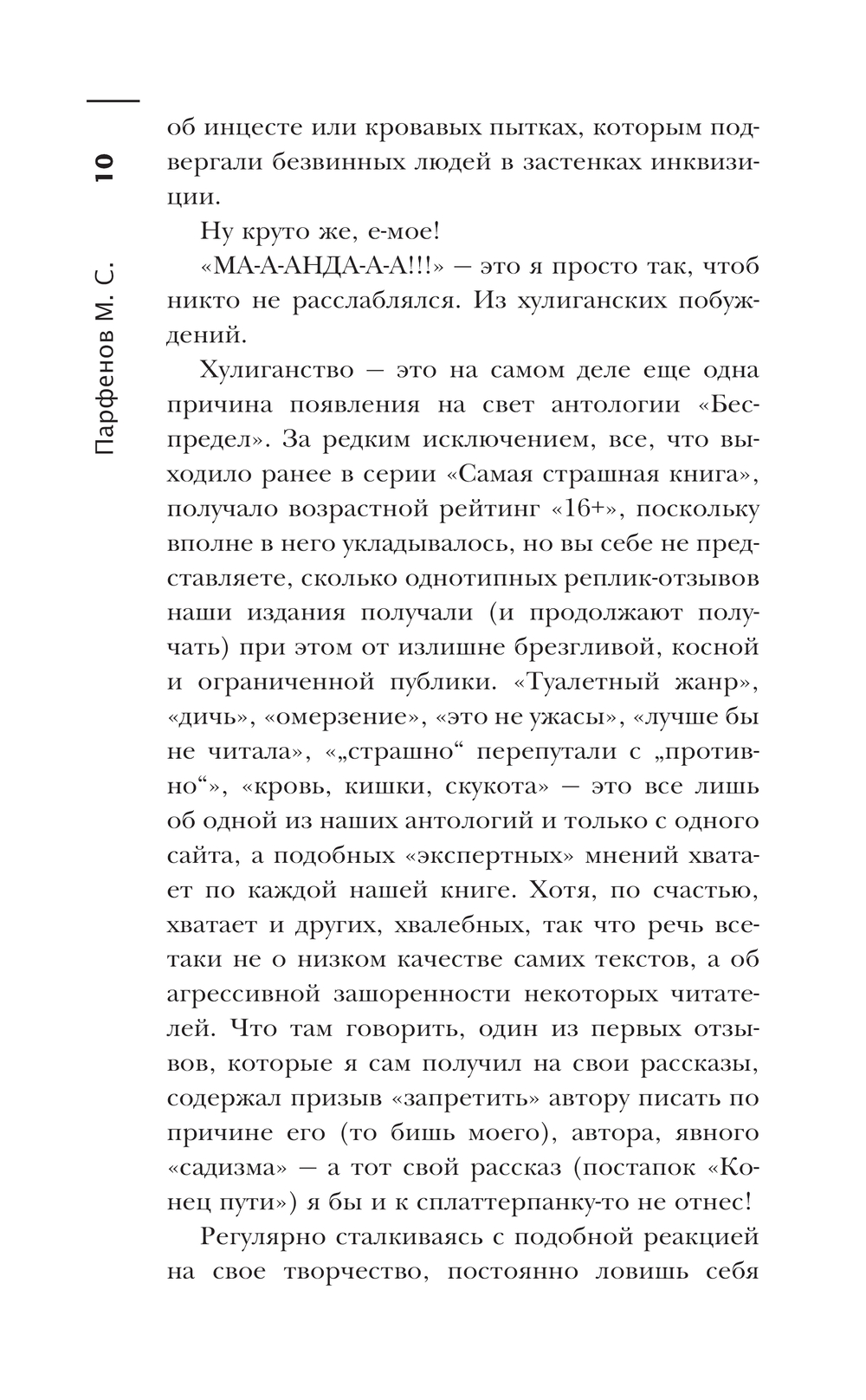 Потому что это – антология экстремального хоррора и сплаттерпанка, самого маргинального и запретного направления в литературе ужасов, а то и во всей современной литературе. Кровь, секс, насилие, мат – это точно не та книга, которую вы посоветуете вашей бабушке.