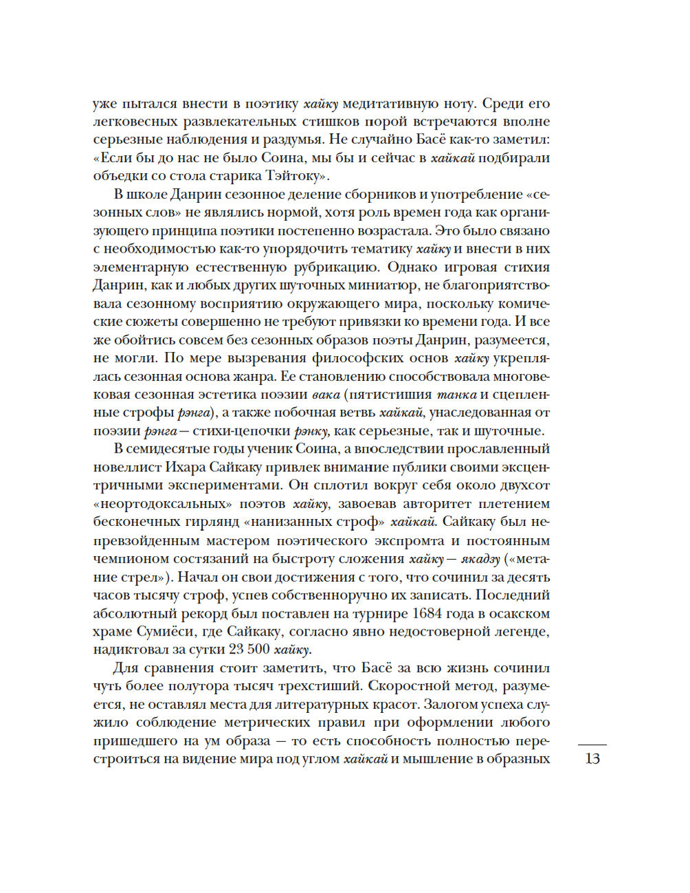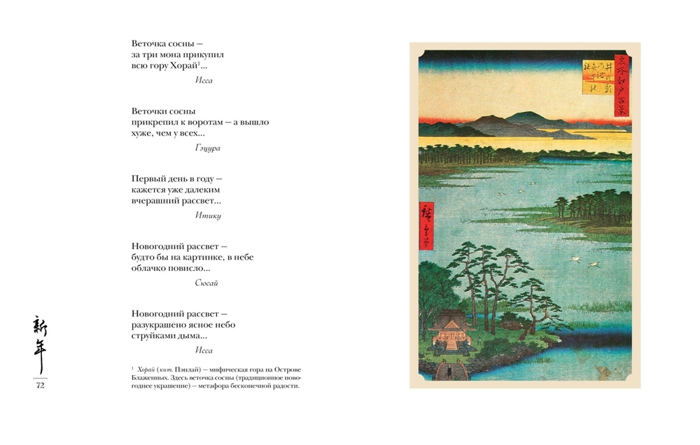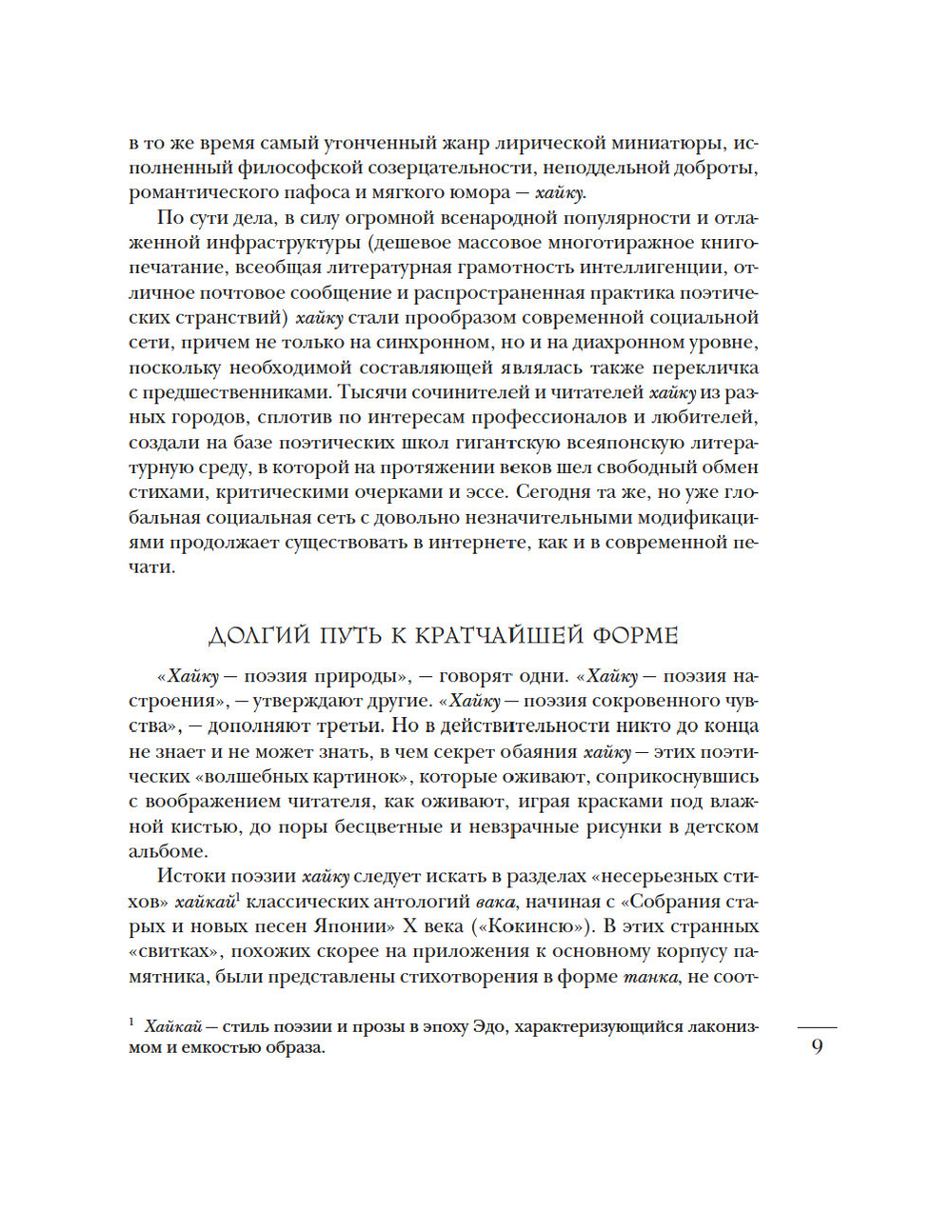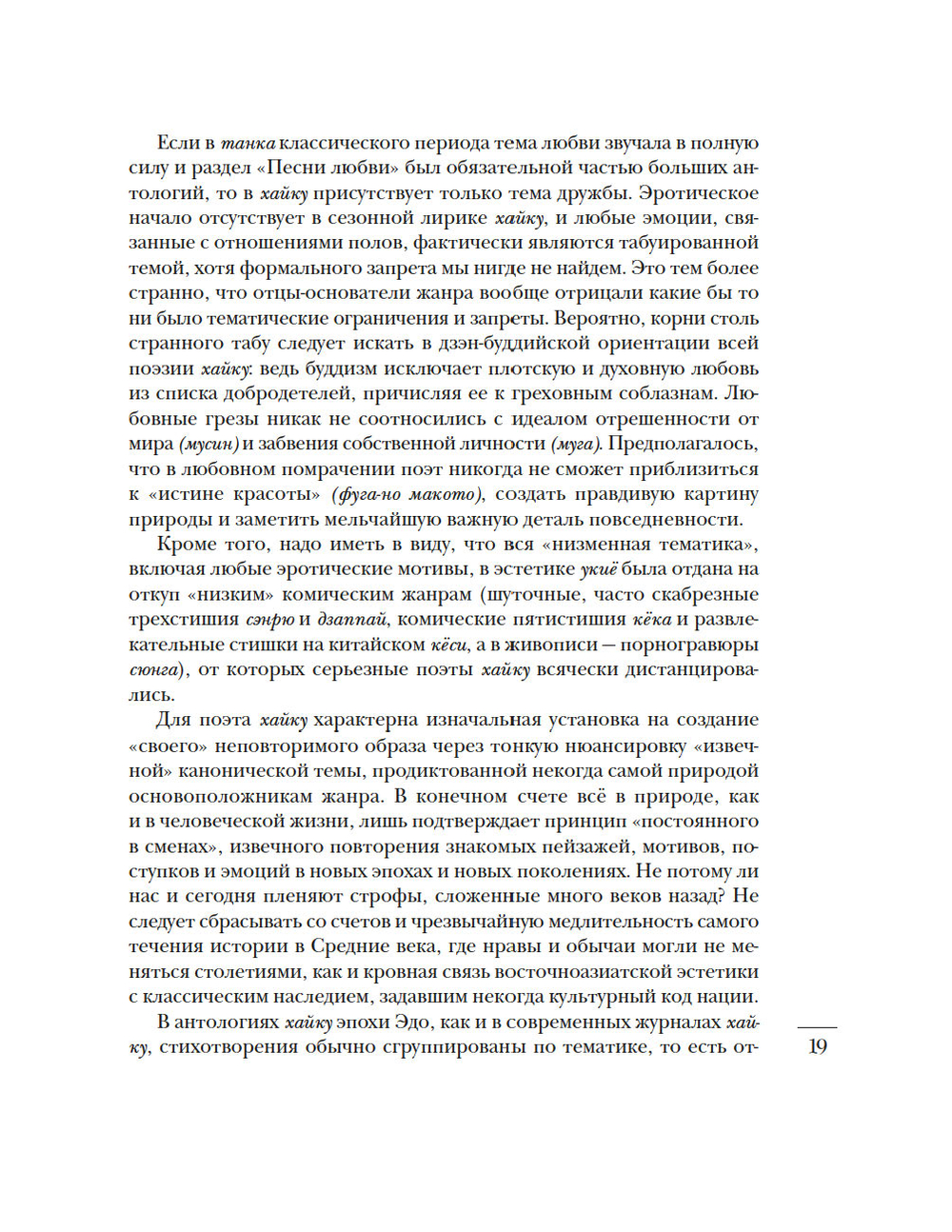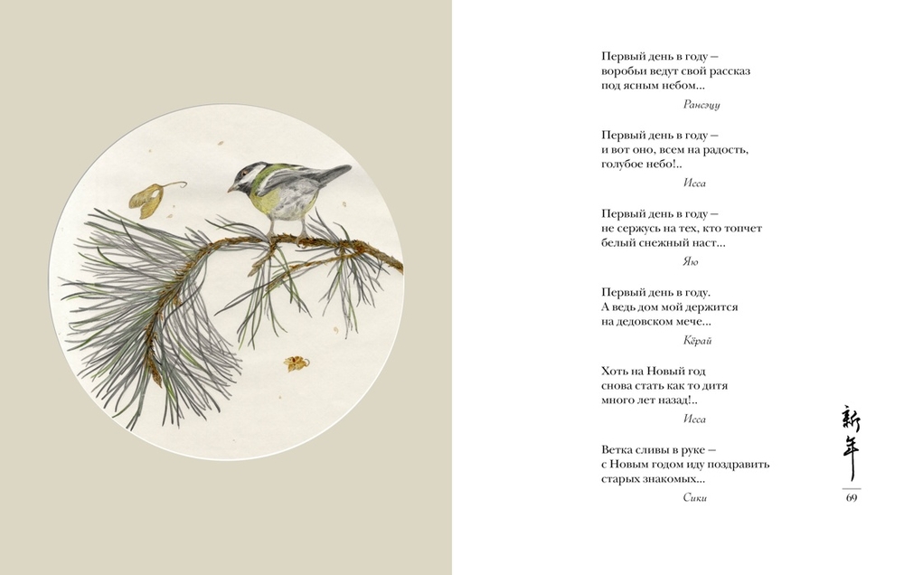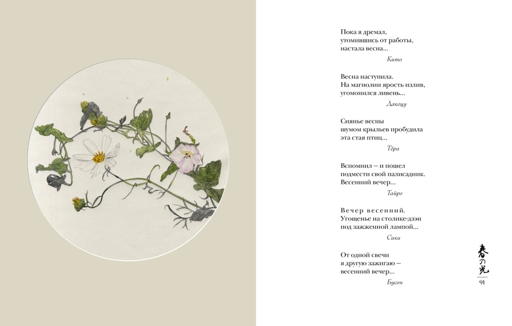Утонченная и немногословная японская поэзия хайку всегда была отражением мира природы, воплощенного в бесконечной смене времен года. Человек, живущий обыденной жизнью, чьи пять чувств настроены на постоянное восприятие красоты земли и неба, цветов и трав, песен цикад и солнечного тепла, – вот лирический герой жанра, объединяющего поэзию, живопись и каллиграфию. Авторы хайку создали своего рода поэтический календарь, в котором отводилось место для разнообразных растений и животных, насекомых, птиц и рыб, для бытовых зарисовок и праздников.