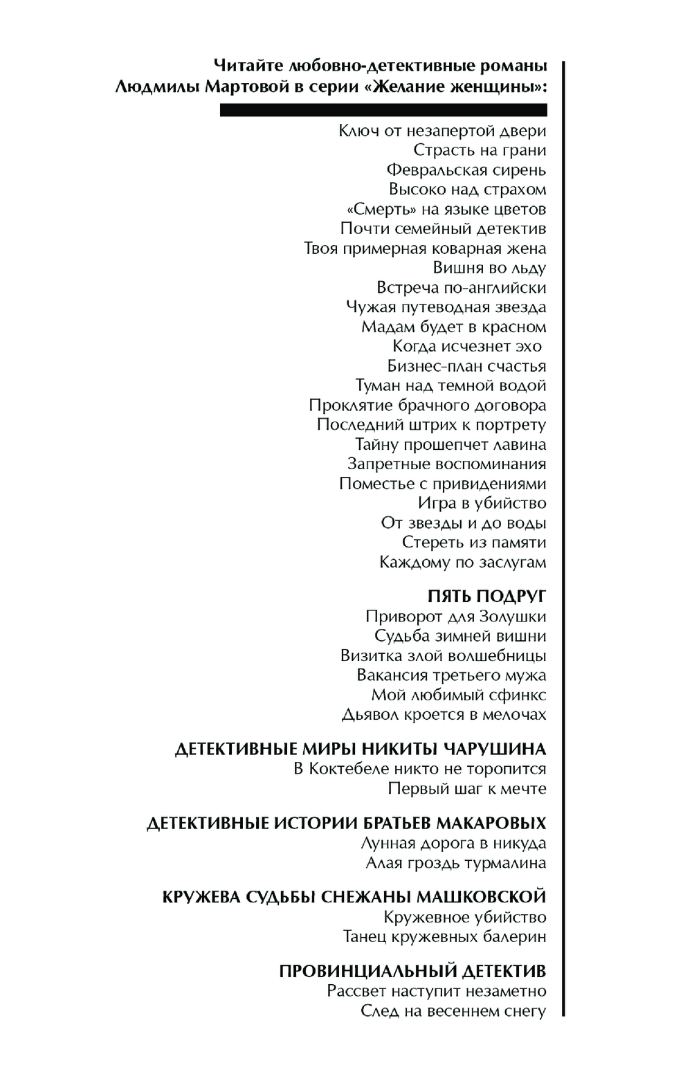 | Серия | Желание женщины. Детективные романы Л. Мартовой |