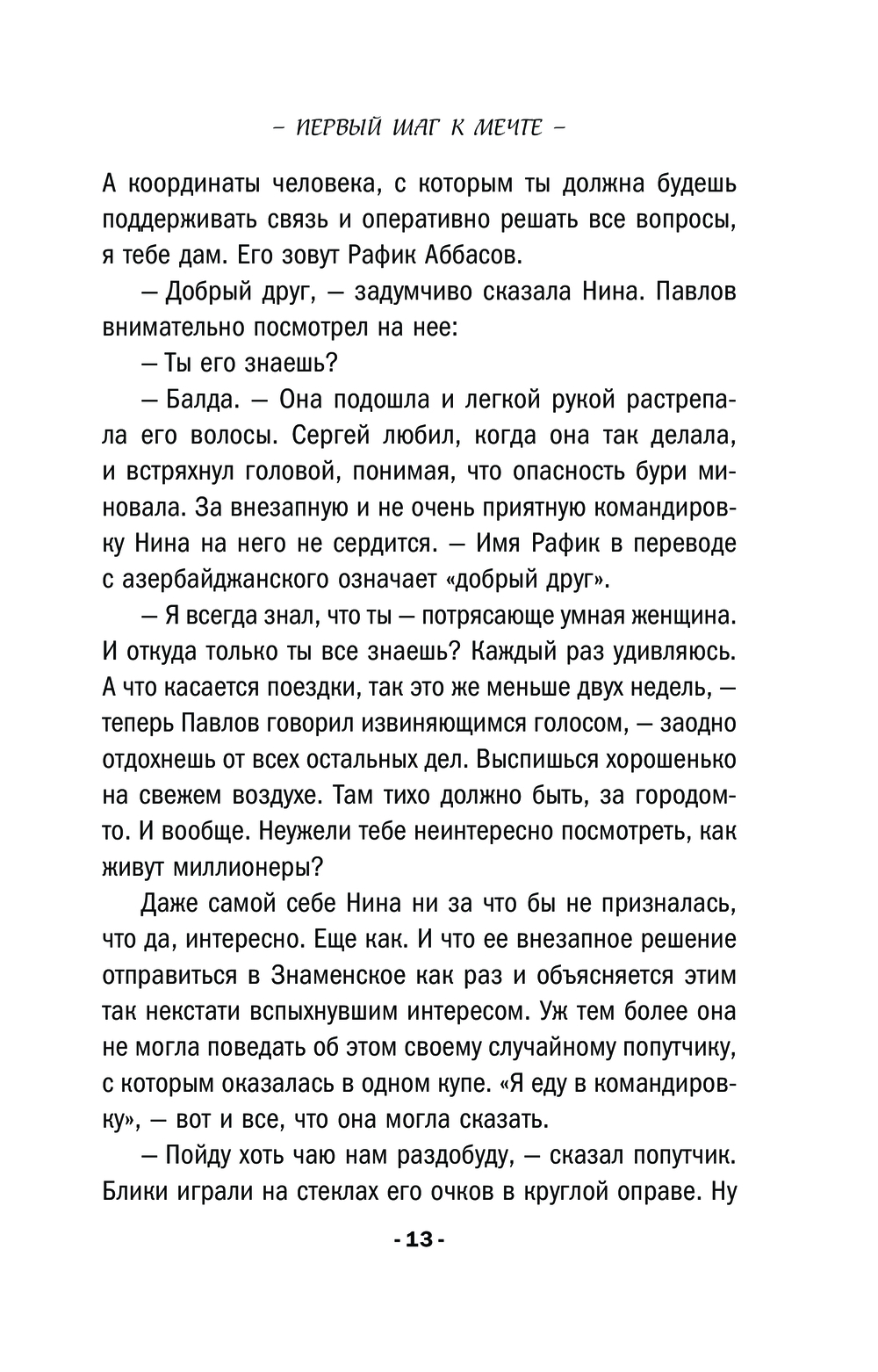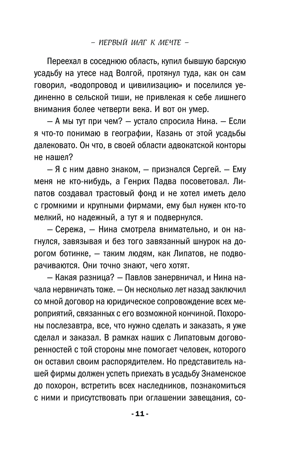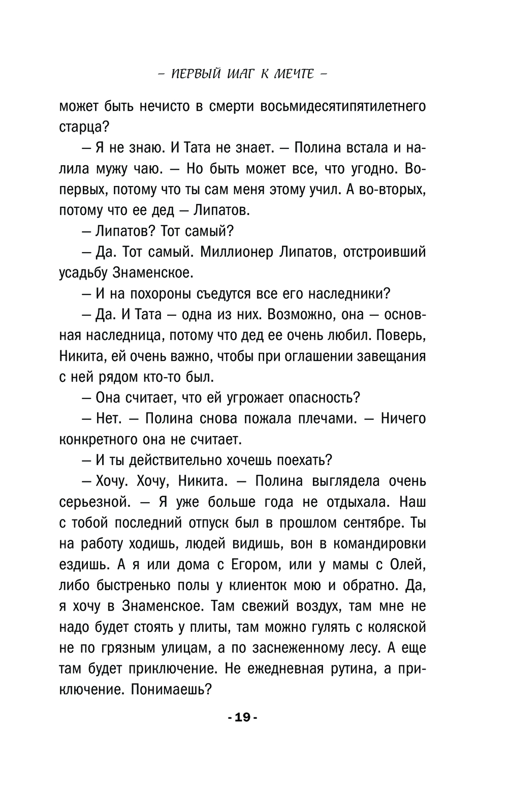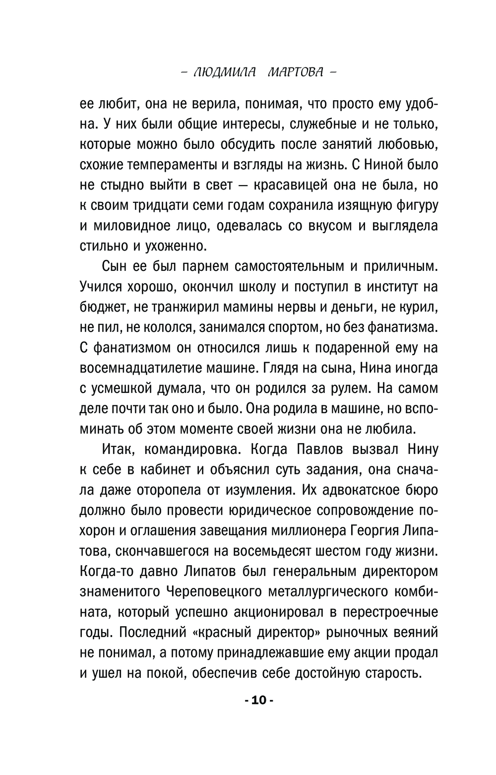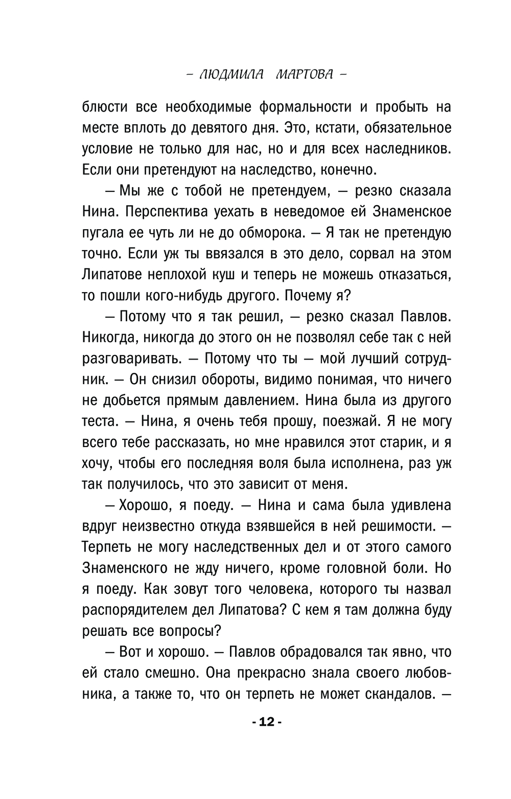 Отправляясь в эту командировку, сотрудница юридической фирмы Нина не думала, что окажется в атмосфере английского детектива. Уединенная усадьба, хозяин которой недавно покинул этот мир, его многочисленные и совсем не дружные родственники, собравшиеся, чтобы присутствовать при оглашении завещания... Не хватает только снегопада, который отрежет усадьбу от внешнего мира! Но реальная жизнь – это не роман Агаты Кристи, и задача Нины не расследовать преступление, а обеспечить соблюдение юридических формальностей. Или предчувствие ее не обманывает, и чисто английское убийство может произойти и в российской глубинке?