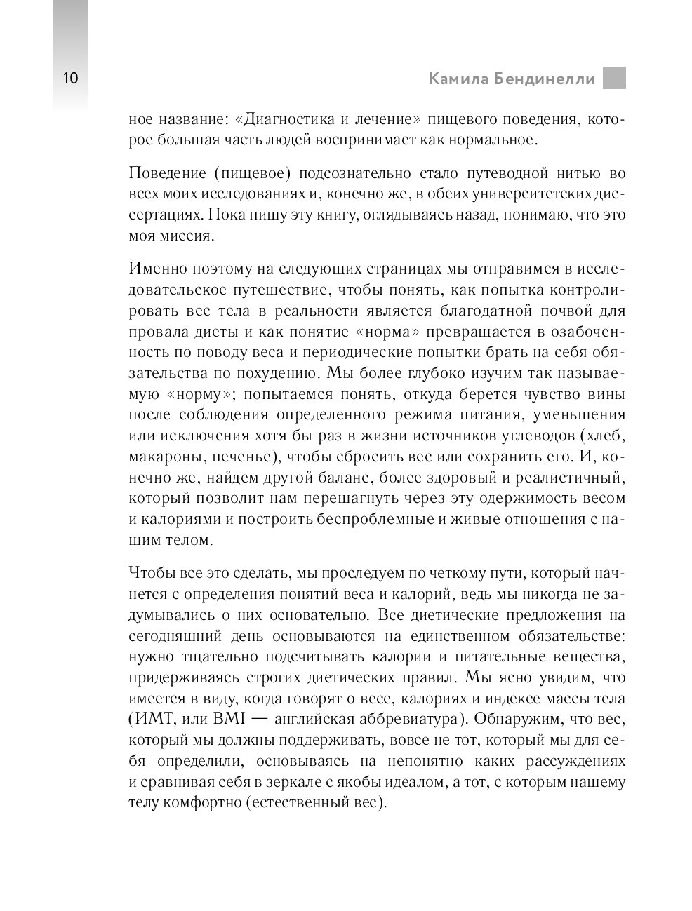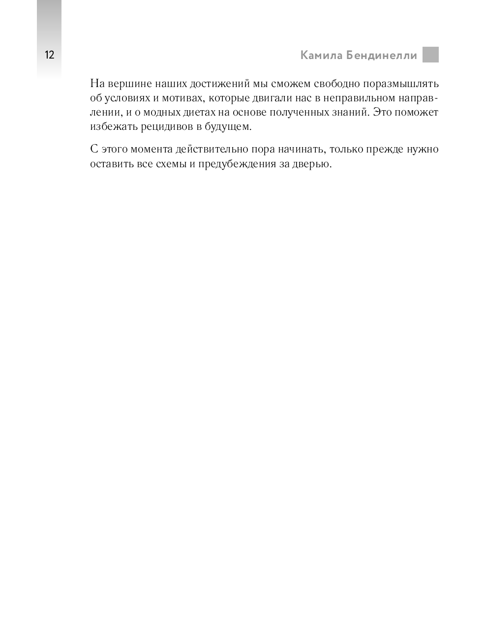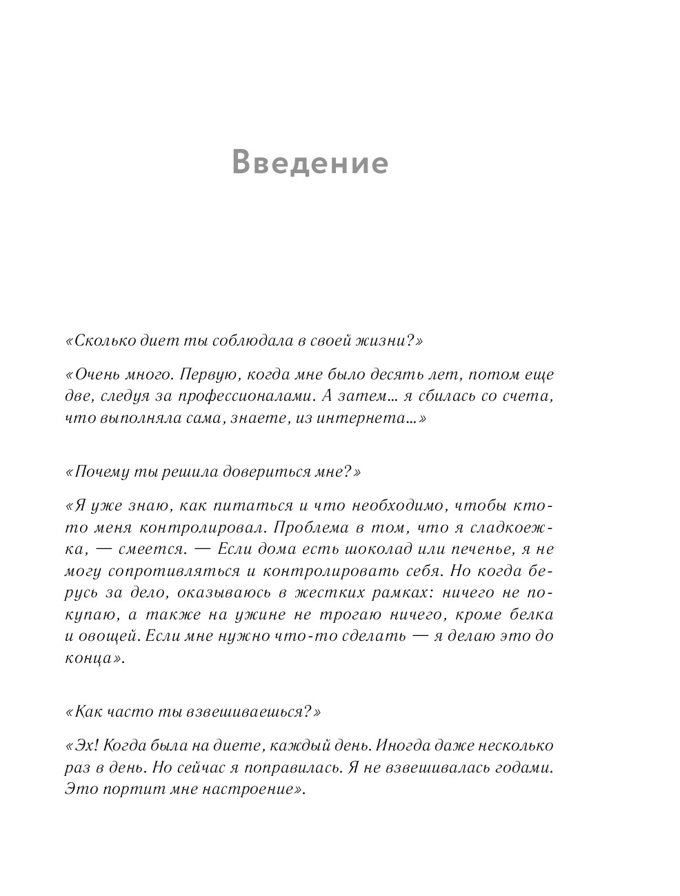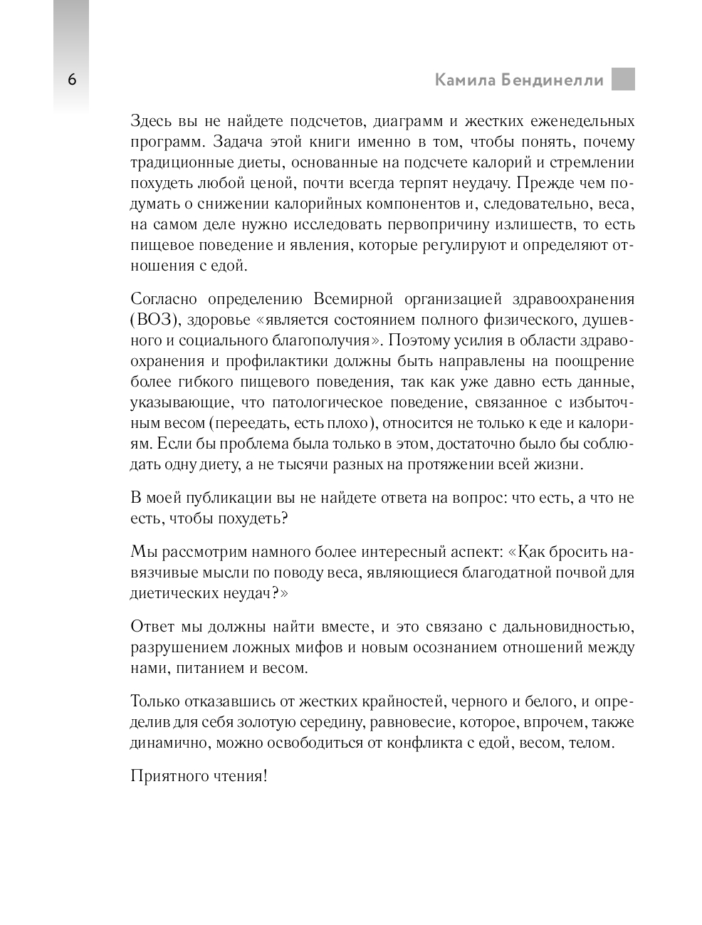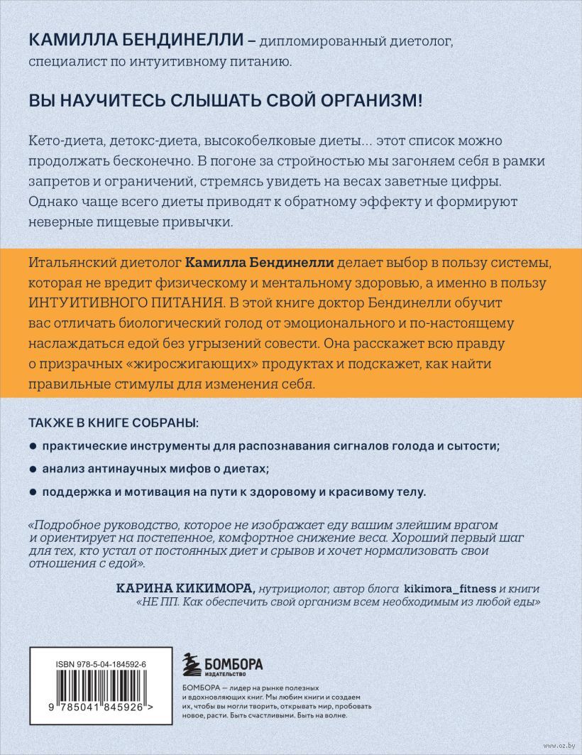 "Почему я не могу устоять перед этой шоколадкой? Она так и манит меня!", "Снова объелся на ночь! Почему я такой безвольный?", "Сегодня был такой сложный день, кажется, пора поднять себе настроение мороженым". Знакомые фразы? Часто ли вы корите себя за лишний кусочек пиццы, съеденный за ужином, и сокрушаетесь о том, что в этом году снова не успели подготовиться к лету? Итальянский диетолог Камилла Бендинелли расскажет вам о том, как разорвать порочный круг диет и перестать загонять себя в рамки. Она уверена, достаточно лишь научиться слушать и СЛЫШАТЬ свой организм, чтобы прийти в форму и, главное, удержать ее надолго. Без боязни сорваться и бесконечных запретов.