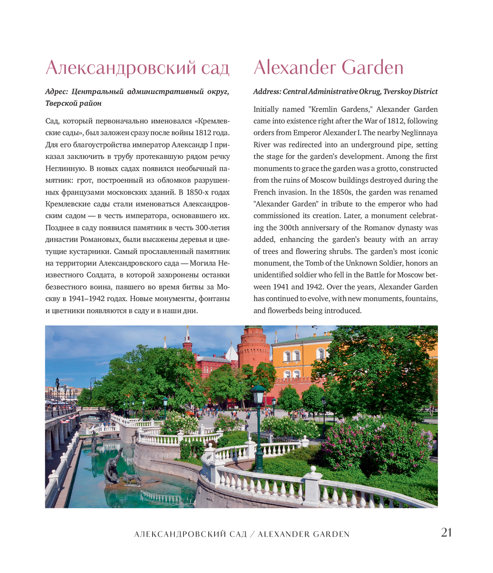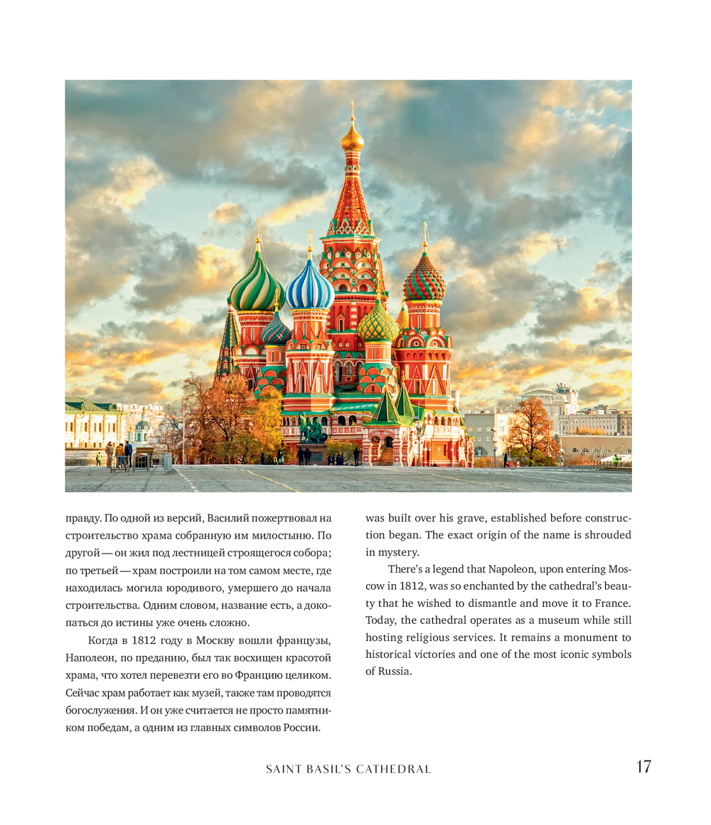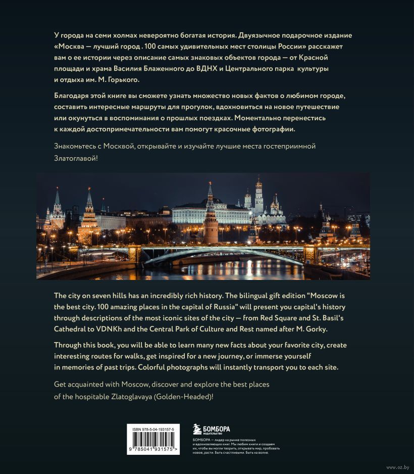 У города на семи холмах невероятно богатая история. Двуязычное подарочное издание "Москва – лучший город. 100 самых удивительных мест столицы России" расскажет вам о ее истории через описание самых знаковых объектов города – от Красной площади и храма Василия Блаженного до ВДНХ и Центрального парка культуры и отдыха им. М. Горького.