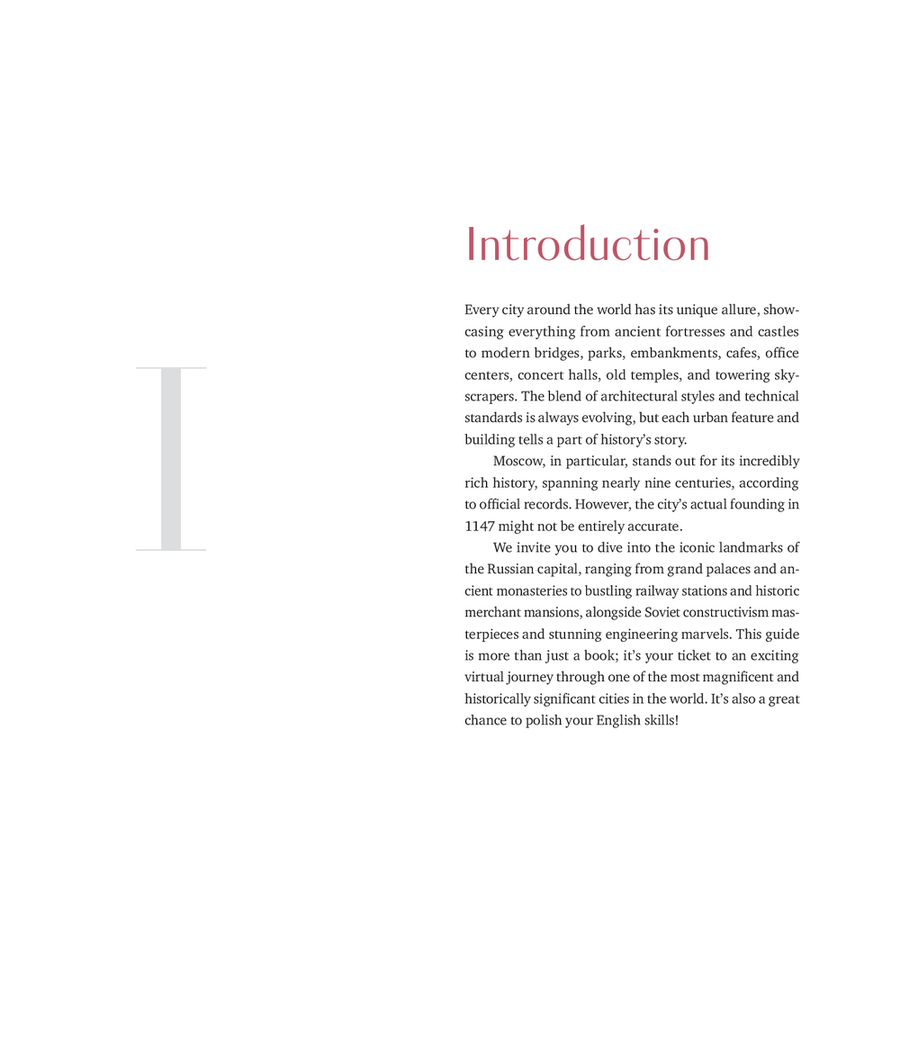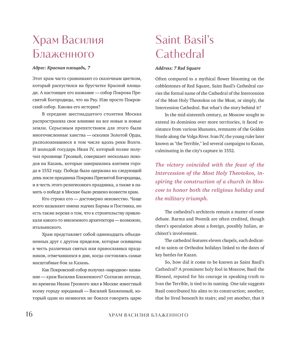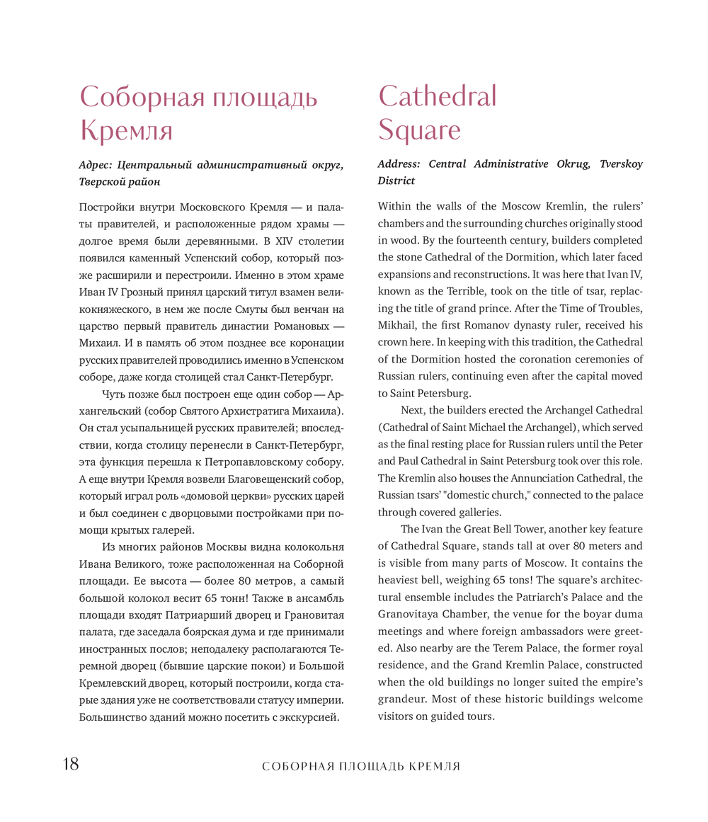 У города на семи холмах невероятно богатая история. Двуязычное подарочное издание "Москва – лучший город. 100 самых удивительных мест столицы России" расскажет вам о ее истории через описание самых знаковых объектов города – от Красной площади и храма Василия Блаженного до ВДНХ и Центрального парка культуры и отдыха им. М. Горького.