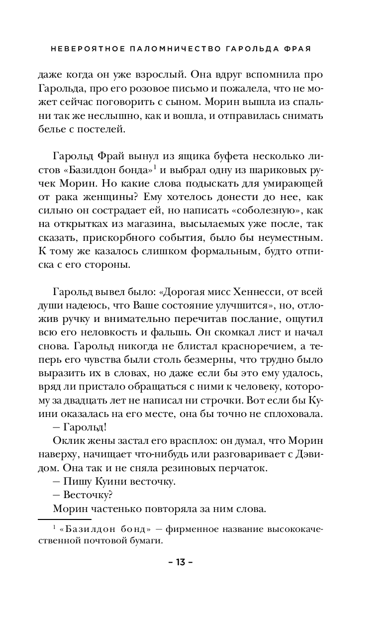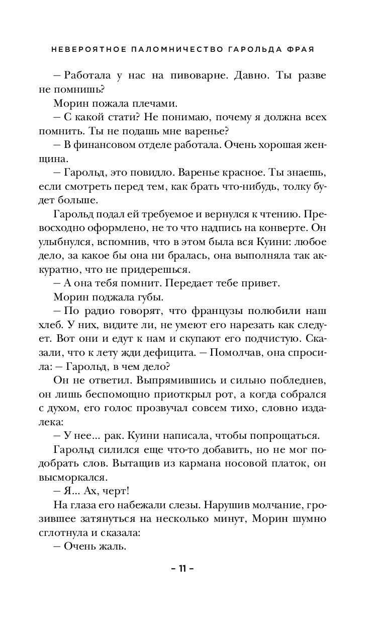 Гарольд Фрай, самый обычный человек, который всю жизнь ощущал себя ненужным, лишним, пускается в необычное путешествие. На противоположном конце страны в хосписе его ждет женщина по имени Куини Хеннесси. Мы не знаем, был ли у них роман, но она, одна из немногих, понимала и ценила его. Гарольд верит – пока он идет, преодолевая милю за милей, Куини будет жить. Эта одиссея стала для Гарольда возвращением к себе и – переосмыслением всей его жизни.