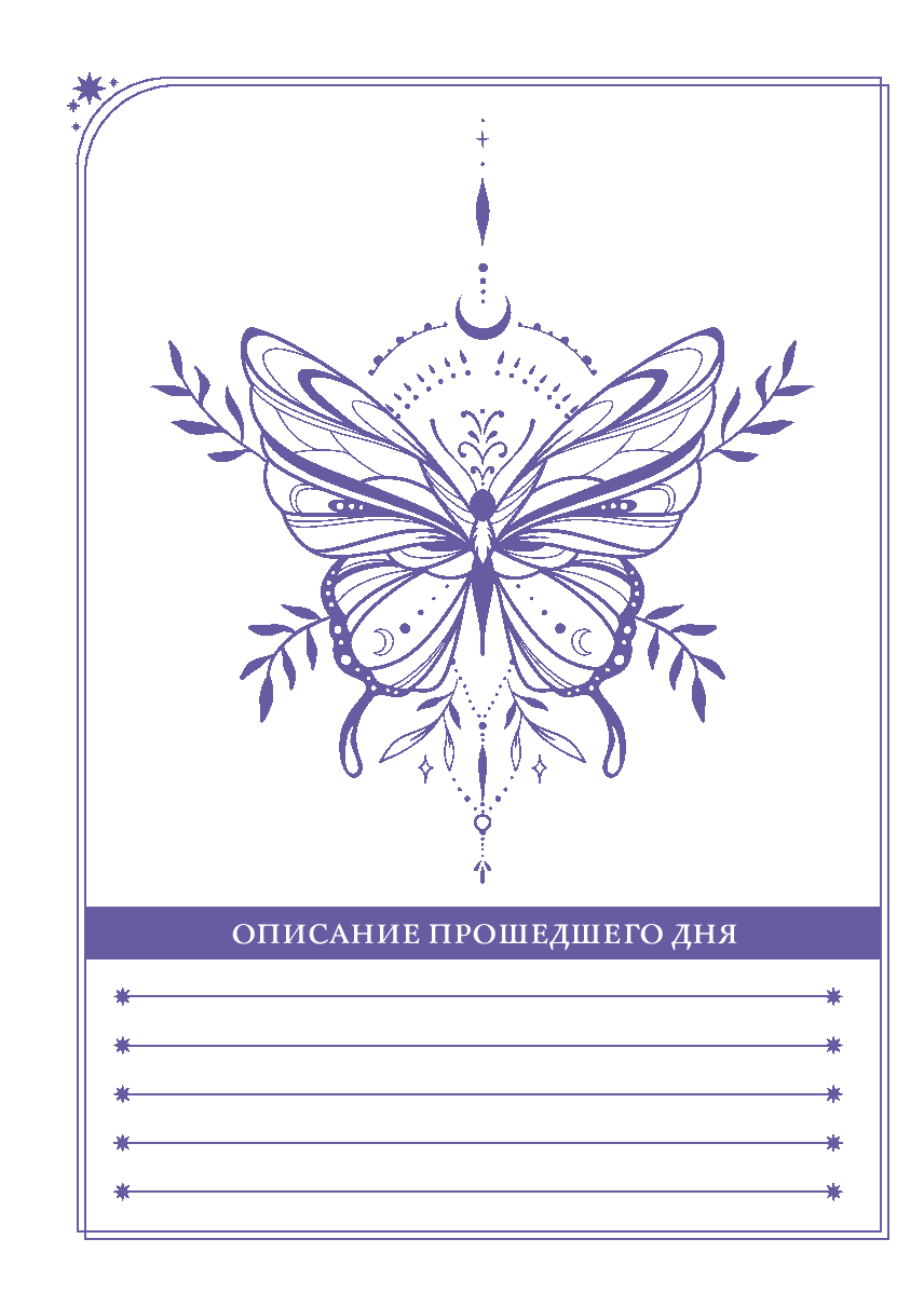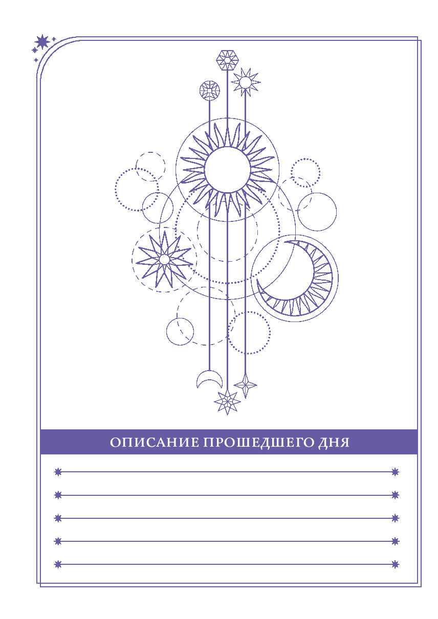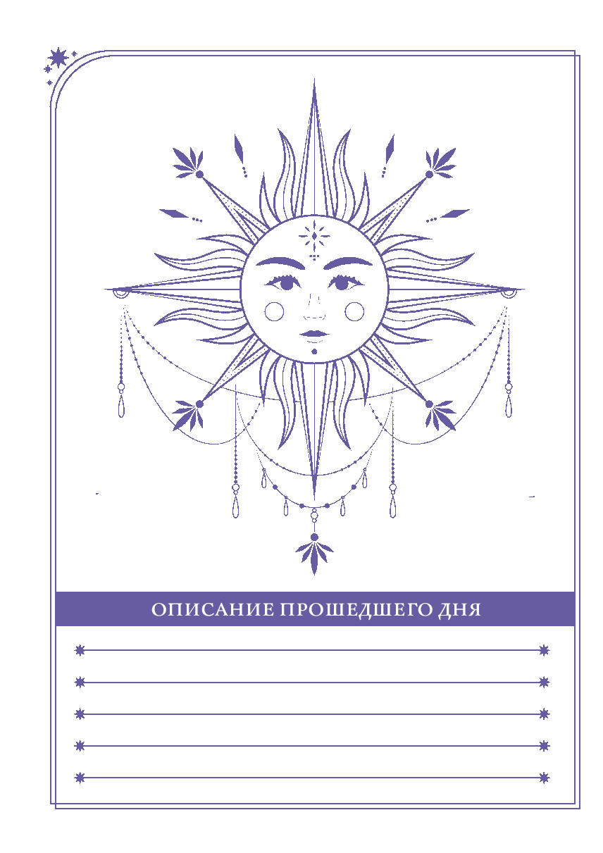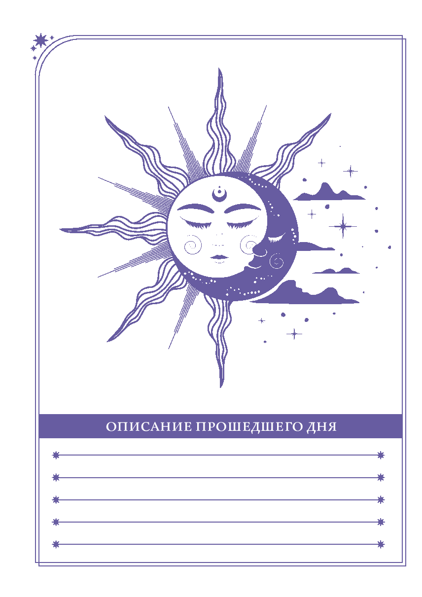 Под обложкой вас ждут типовые страницы, имеющие универсальную структуру, состоящую из небольшой анкеты и 5 пунктов: описание прошедшего дня; краткое описание сна; трактовка сна; повторяющиеся символы/детали сна; эмоции. Также внутри блока вас ждут невероятно красивые мини-раскраски, сделанные специально для того, чтобы вы могли ненадолго расслабиться и привести мысли в порядок.