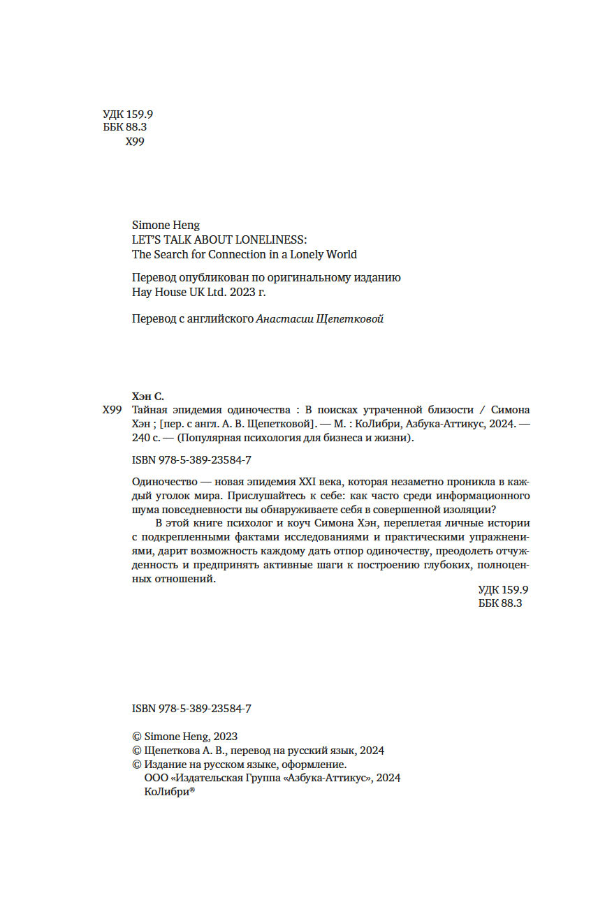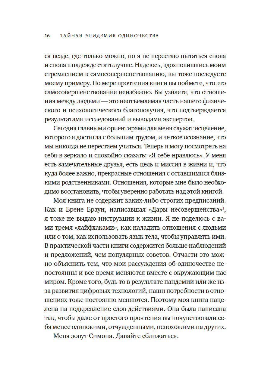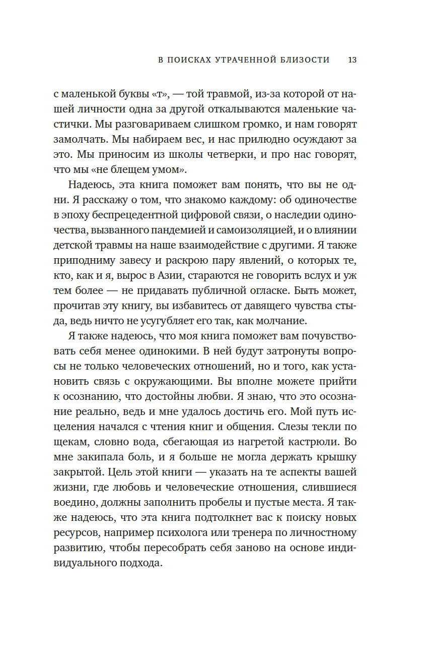 В этой книге психолог и коуч Симона Хэн, переплетая личные истории с подкрепленными фактами исследованиями и практическими упражнениями, дарит возможность каждому дать отпор одиночеству, преодолеть отчужденность и предпринять активные шаги к построению глубоких, полноценных отношений.