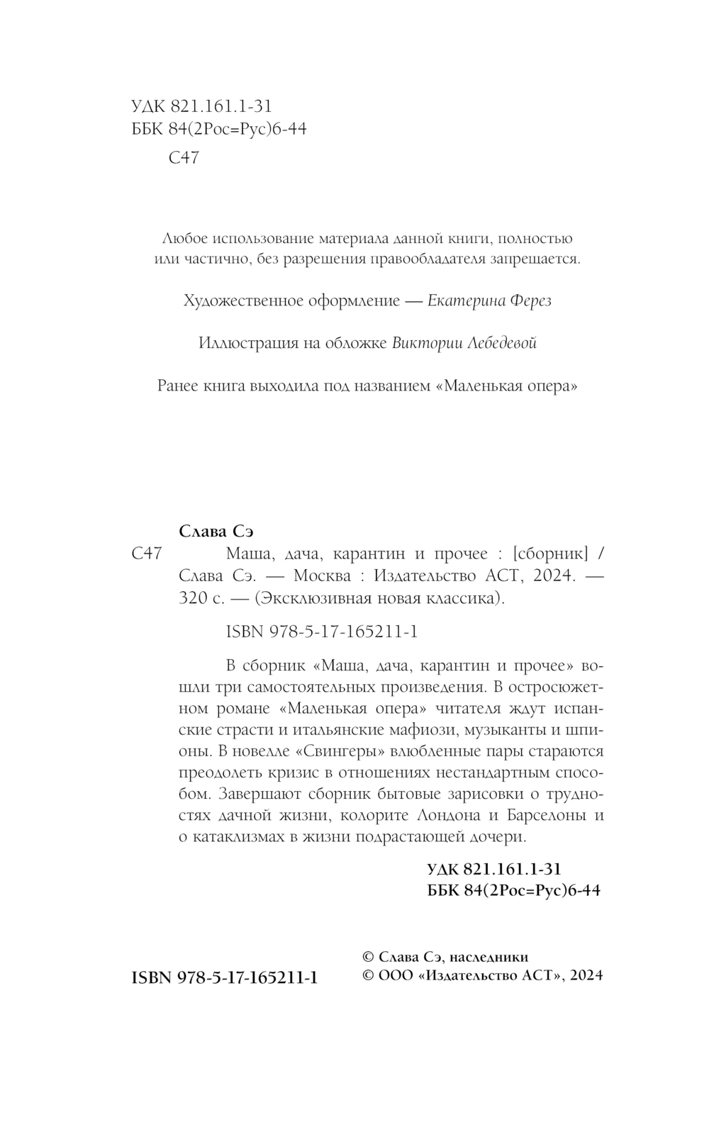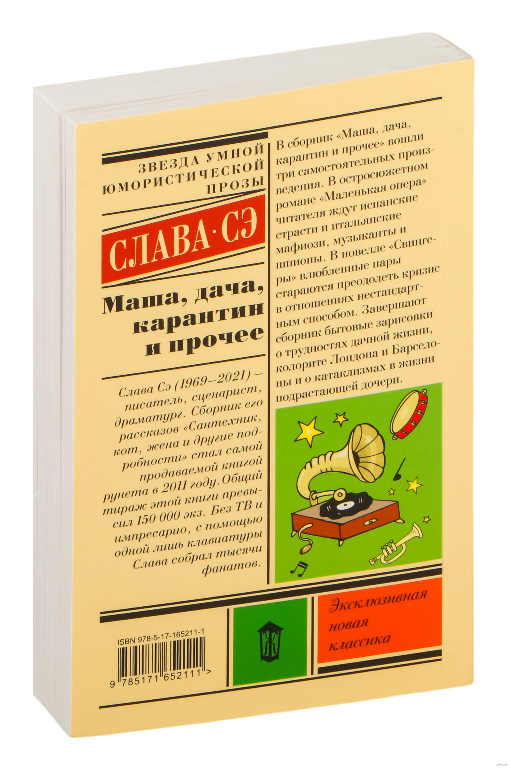 В сборник "Маша, дача, карантин и прочее" вошли три самостоятельных произведения. В остросюжетном романе "Маленькая опера" читателя ждут испанские страсти и итальянские мафиози, музыканты и шпионы. В новелле "Свингеры" влюбленные пары стараются преодолеть кризис в отношениях нестандартным способом. Завершают сборник бытовые зарисовки о трудностях дачной жизни, колорите Лондона и Барселоны и о катаклизмах в жизни подрастающей дочери.