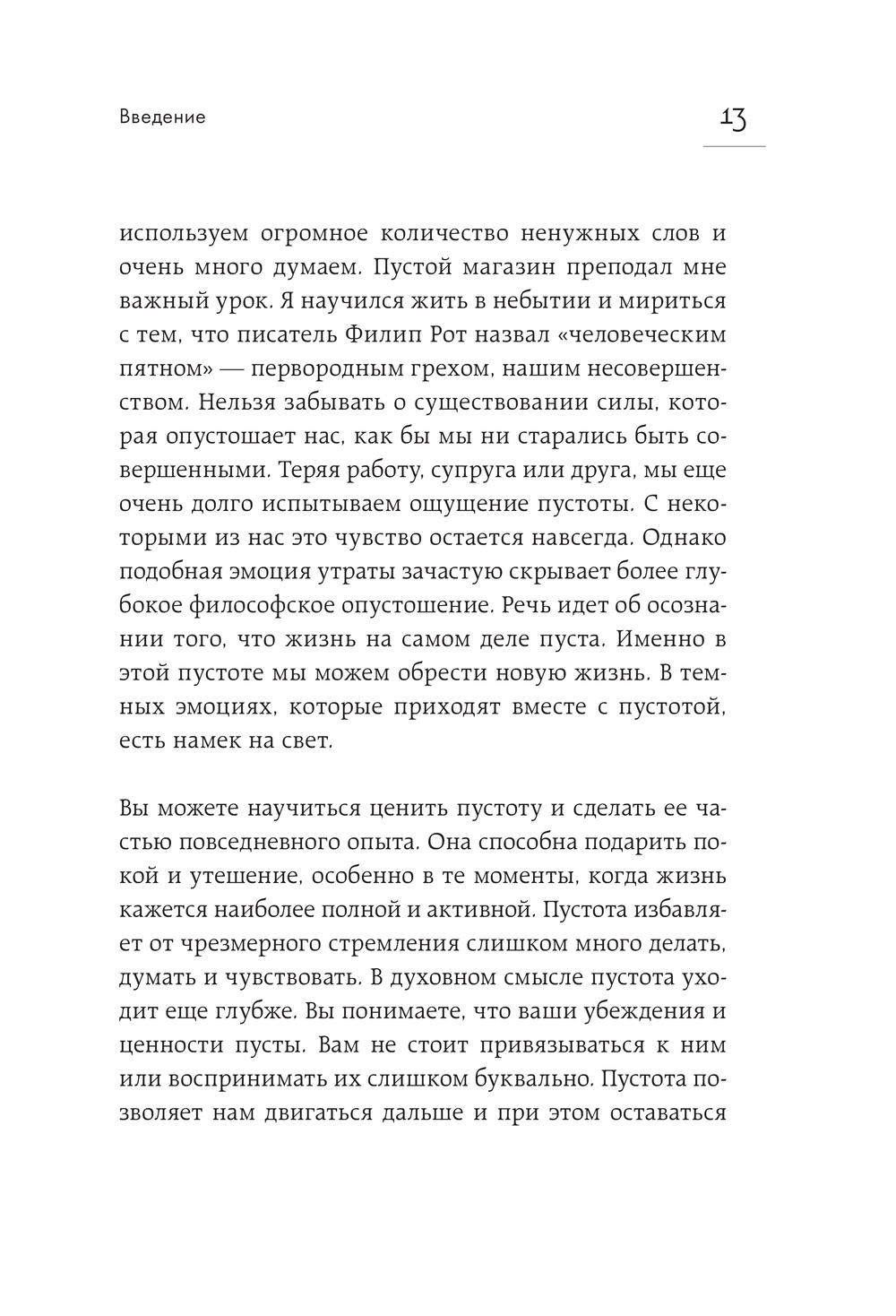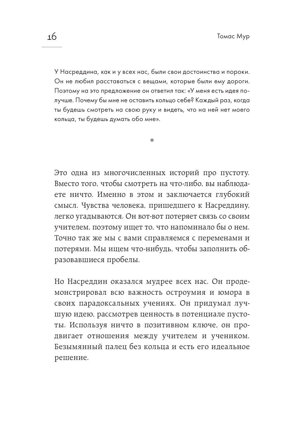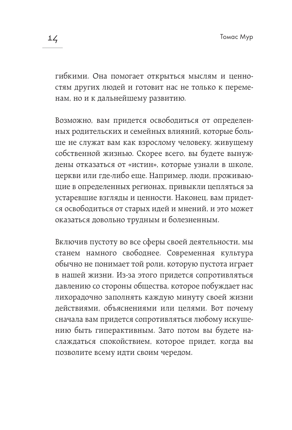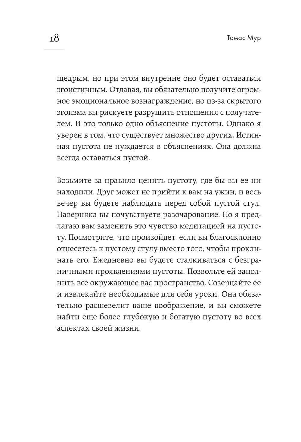 Мировой бестселлер от Томаса Мура – знаменитого психотерапевта, бывшего монаха, автора книг по духовному развитию. В своей новой работе он показывает уникальную природу пустоты как пространства рождения нового, более глубокого и осмысленного пути жизни, раскрытия в ней энергии и вдохновения, Эта книга находится на стыке разных знаний – от дзенского понимания феномена пустоты до глубинной психологии. Книга написана увлекательно, как рассказы. Она, по сути, – сборник духовных притч. Будет интересна широкому кругу читателей – и тем, кто интересуется разными глубинными практиками, и тем, кто любит психологию.