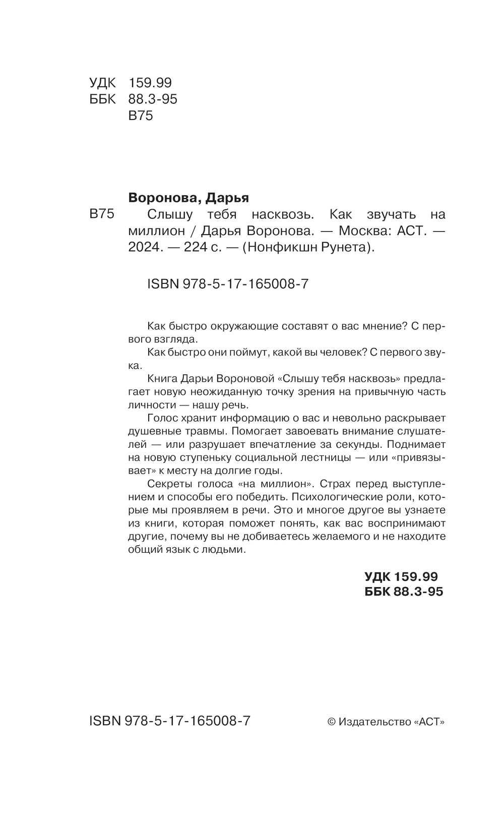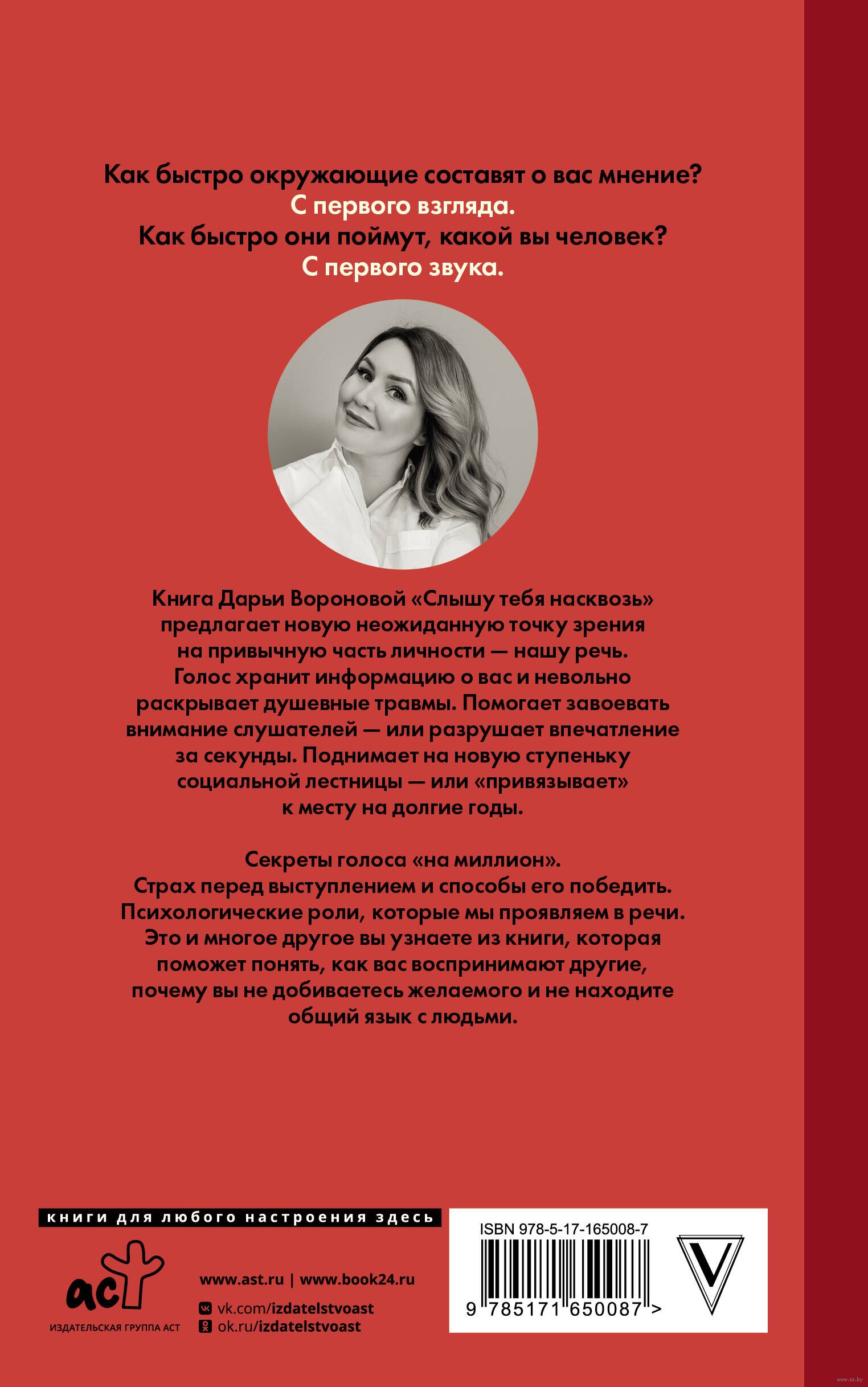 Как быстро окружающие составят о вас мнение? С первого взгляда. Как быстро они поймут, какой вы человек? С первого звука. Книга Дарьи Вороновой "Слышу тебя насквозь" предлагает новую неожиданную точку зрения на привычную часть личности – нашу речь.