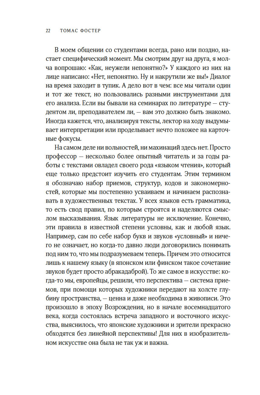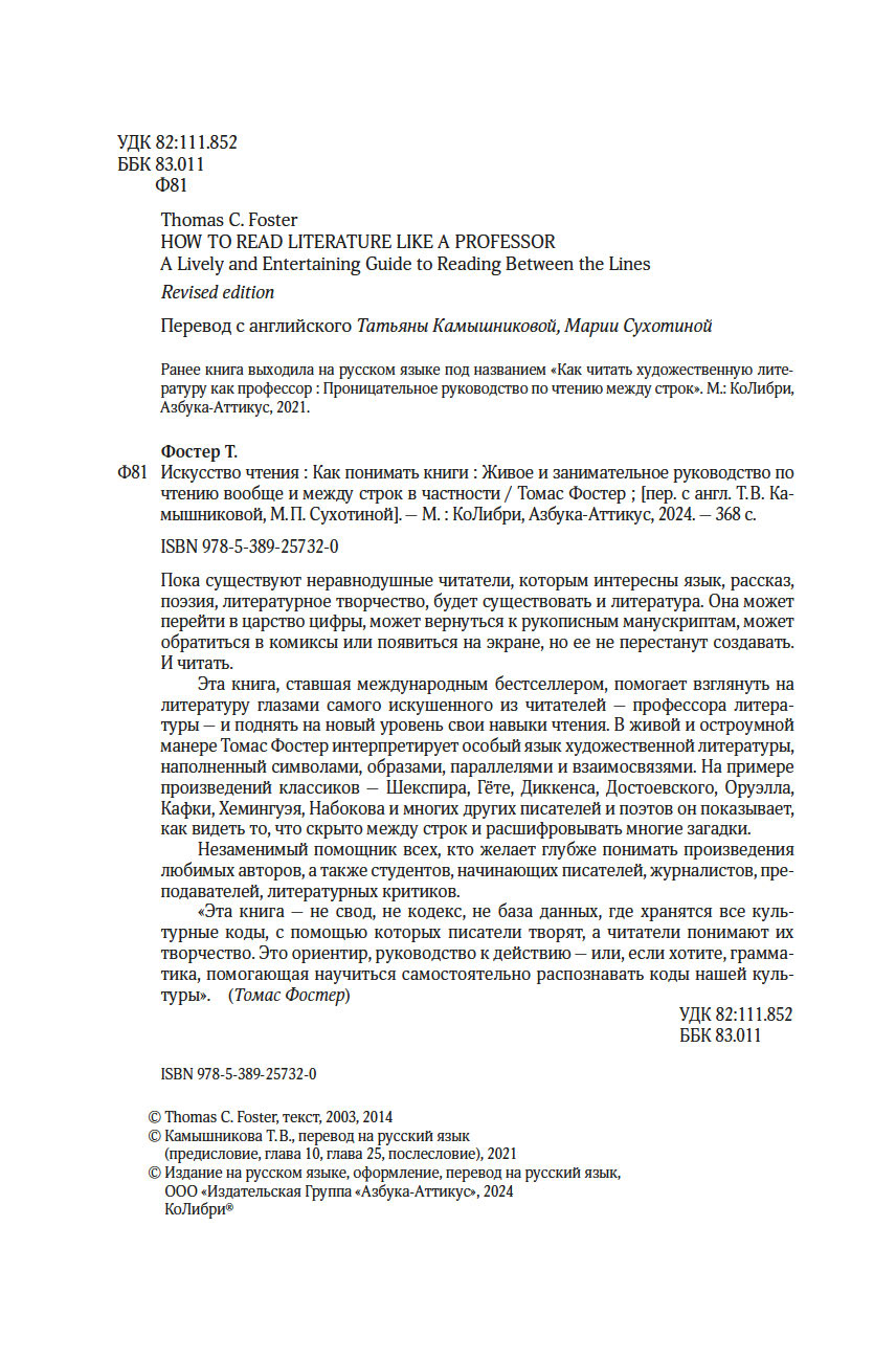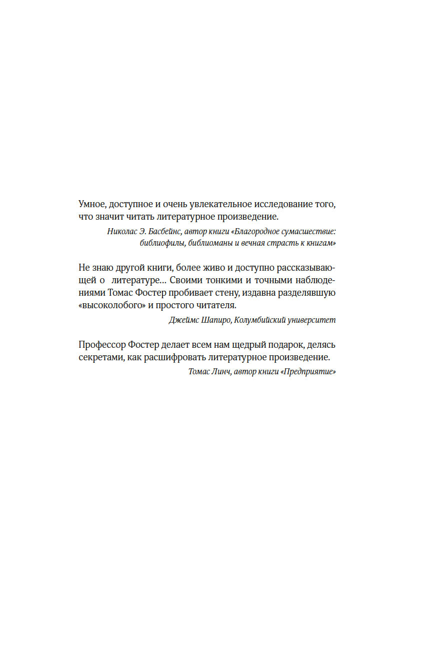 Эта книга, ставшая международным бестселлером, помогает взглянуть на литературу глазами самого искушенного из читателей: профессора литературы, и поднять на новый уровень свои навыки чтения. В живой и остроумной манере Томас Фостер интерпретирует особый язык художественной литературы, напол- ненный символами, образами, параллелями и взаимосвязями. На примере произведений классиков – Шекспира, Гёте, Диккенса, Достоевского, Оруэлла, Кафки, Хемингуэя, Набокова и многих других писателей и поэтов он показывает, как видеть то, что скрыто между строк и расшифровывать многие загадки.