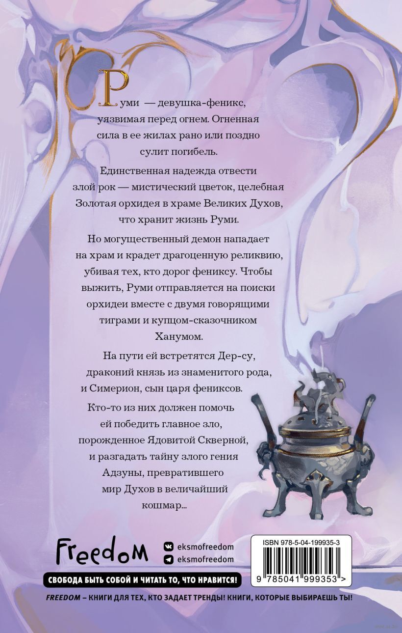Руми – девушка-феникс, уязвимая перед огнем. Огненная сила в ее жилах рано или поздно сулит погибель. Единственная надежда отвести злой рок – мистический цветок, целебная Золотая орхидея в храме Великих Духов, что хранит жизнь Руми. Но могущественный демон нападает на храм и крадет драгоценную реликвию, убивая тех, кто дорог фениксу. Чтобы выжить, Руми отправляется на поиски орхидеи вместе с двумя говорящими тиграми и купцом-сказочником Ханумом. На пути ей встретятся Дер-Су, драконий князь из знаменитого рода, и Симерион, сын царя фениксов. Кто-то из них должен помочь ей победить главное зло, порожденное Ядовитой Скверной и разгадать тайну злого гения Адзуны, превратившего мир Духов в величайший кошмар...