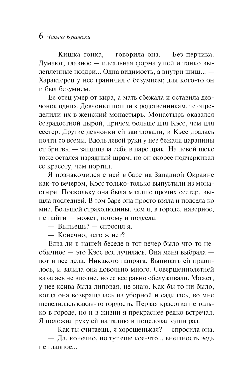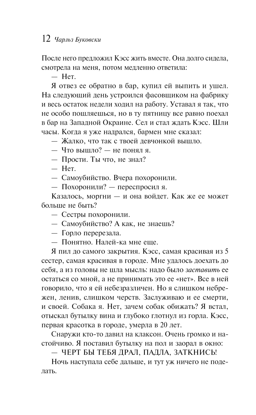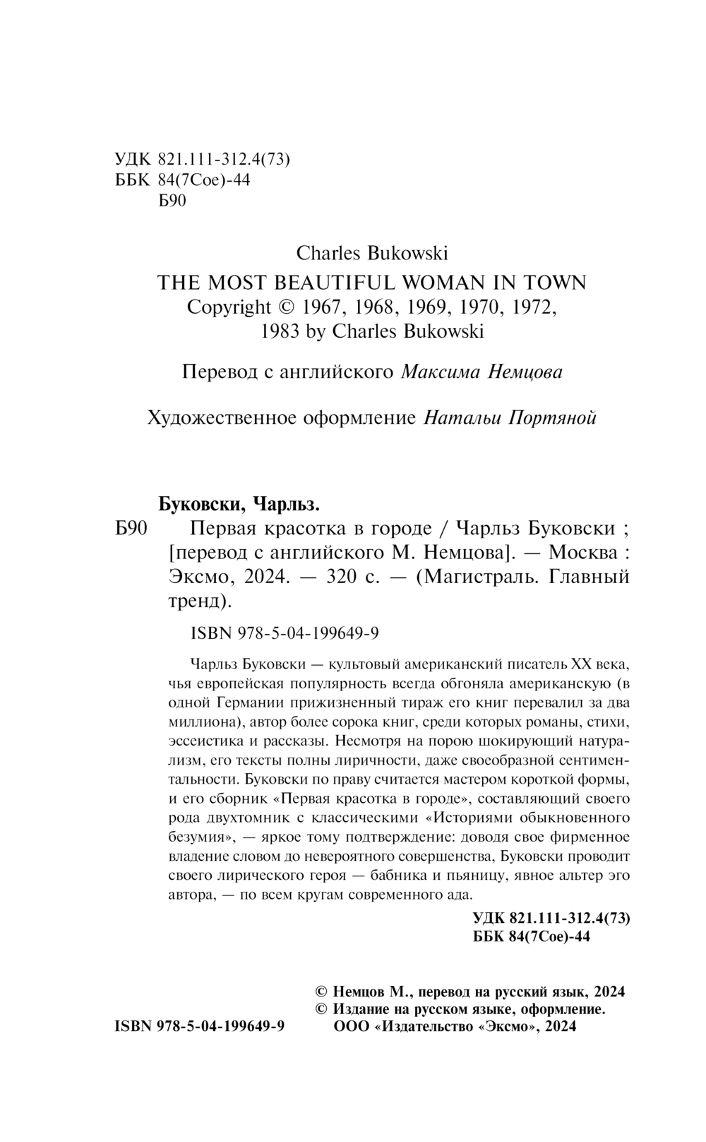 Чарльз Буковски – культовый американский писатель XX века, чья европейская популярность всегда обгоняла американскую (в одной Германии прижизненный тираж его книг перевалил за два миллиона), автор более сорока книг, среди которых романы, стихи, эссеистика и рассказы. Несмотря на порою шокирующий натурализм, его тексты полны лиричности, даже своеобразной сентиментальности. Буковски по праву считается мастером короткой формы, и его сборник "Первая красотка в городе", составляющий своего рода двухтомник с классическими "Историями обыкновенного безумия", – яркое тому подтверждение: доводя свое фирменное владение словом до невероятного совершенства, Буковски проводит своего лирического героя – бабника и пьяницу, явное альтер эго автора, – по всем кругам современного ада.