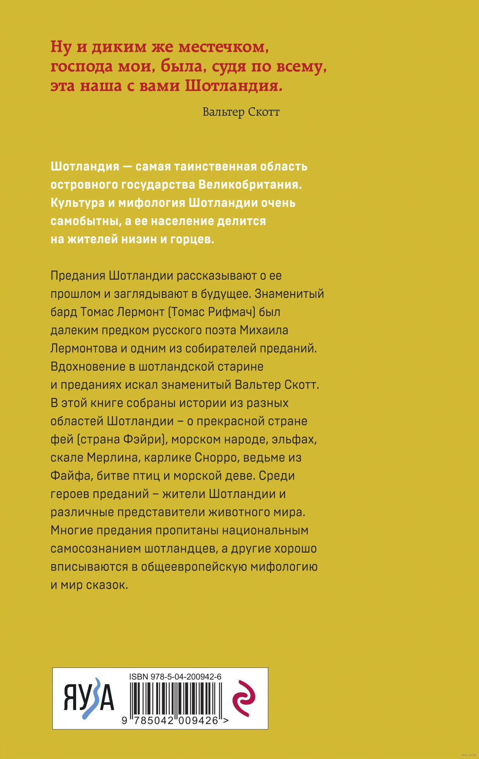 В этой книге собраны истории из разных областей Шотландии о прекрасной стране фей (страна Фэйри), морском народе, эльфах, скале Мерлина, карлике Снорро, ведьме из Файфа, битве птиц и морской деве. Среди героев преданий жители Шотландии и различные представители животного мира острова. Многие предания пропитаны национальным самосознанием шотландцев, а другие хорошо вписываются в общеевропейскую мифологию и мир сказок.