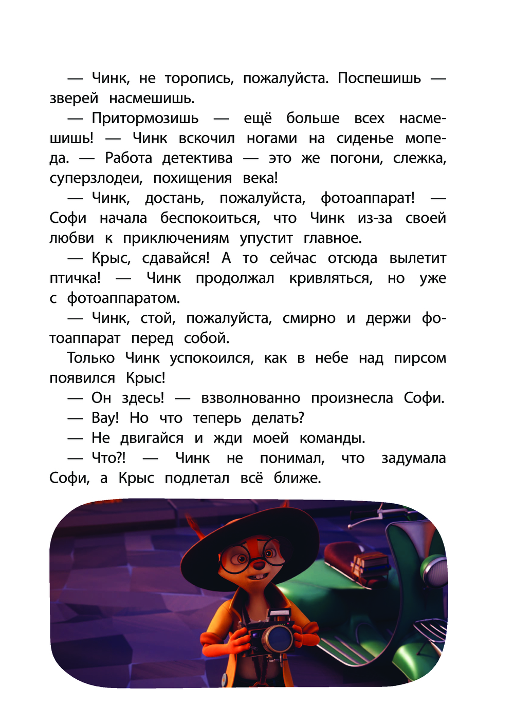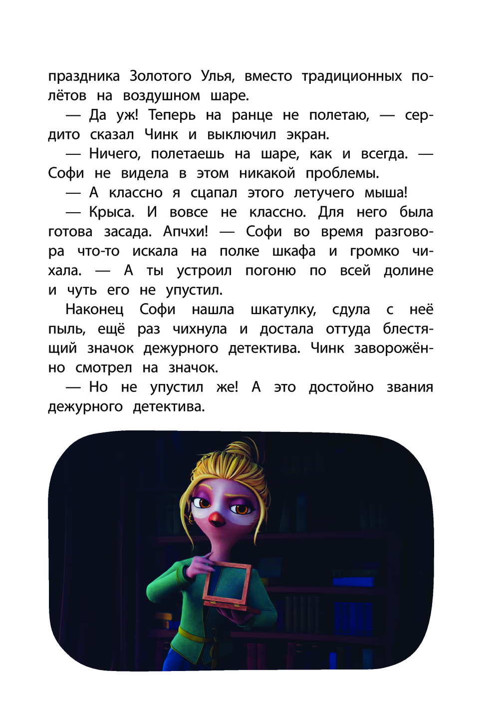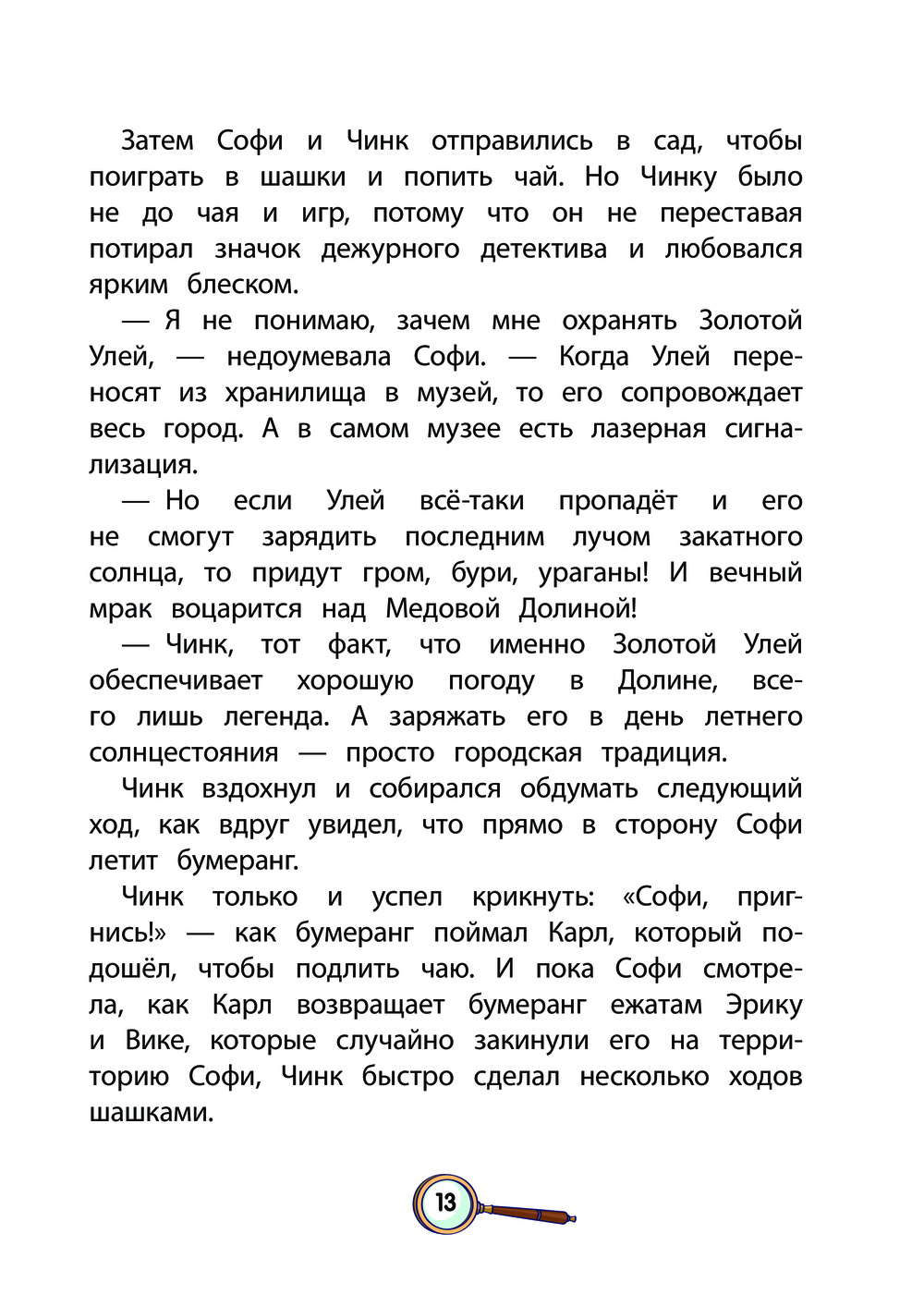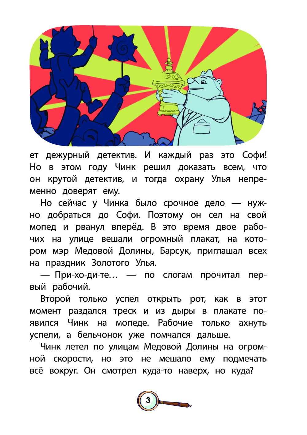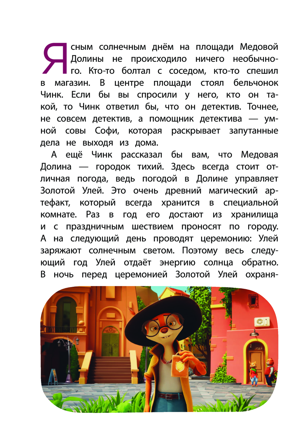 Вся Медовая Долина готовится к главному празднику: Дню Города. Только в этот день можно увидеть уникальный артефакт Золотой Улей. По легенде, если зарядить Улей солнечным светом, то в городе весь год будет спокойствие и хорошая погода. Но накануне праздника Улей похищают и подозреваемым становится... бельчонок Чинк! Он намерен провести расследование, чтобы найти настоящего преступника и вернуть Улей. Все ли у него получилось? Читайте в нашей книге!