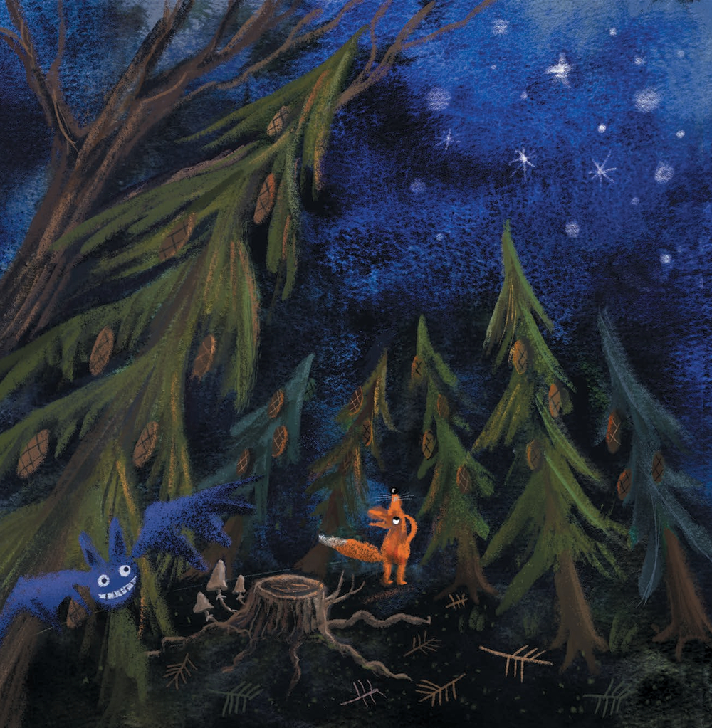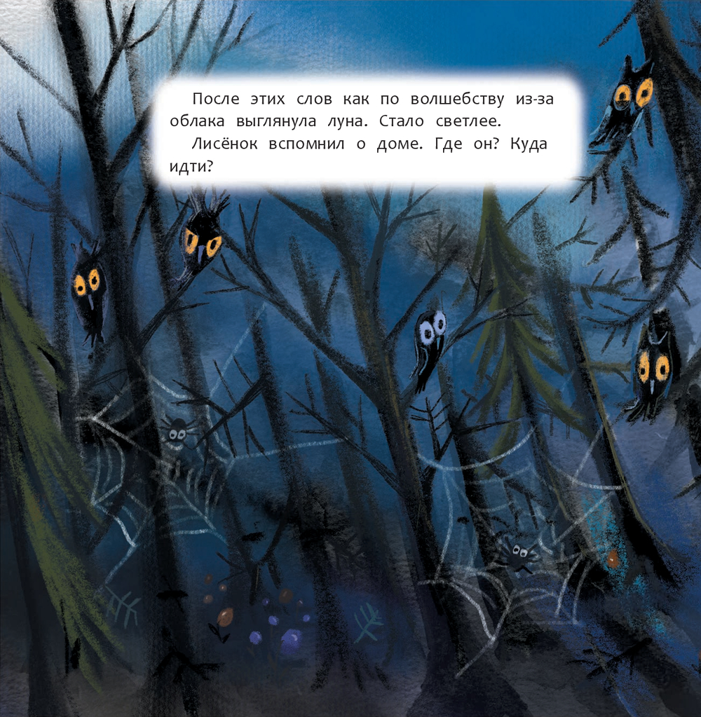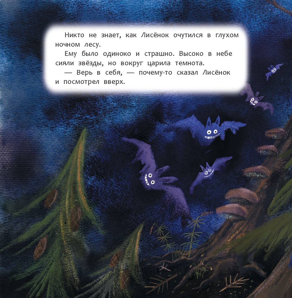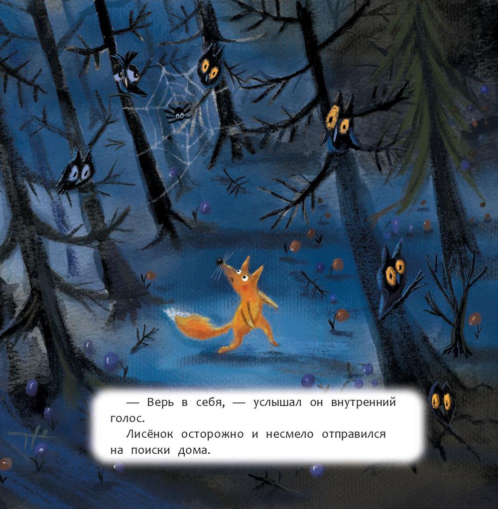 "Верь в себя!" – фраза, которую Лисёнок говорит самому себе, но кажется, будто её слышит весь мир. И не просто слышит, но и откликается, привнося всё больше света в путешествие главного героя: от лунного сияния, блеска росы и огоньков светлячков до искрящихся добротой глаз неожиданного друга, тёплых солнечных лучей и родного голоса.