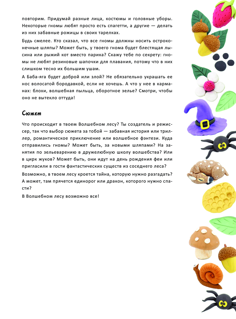 "Лес чудес" – это интерактивная книга, которая научит малыша создавать собственные сюжеты. Дайте волю фантазии – можно придумать забавные имена своим гномам, смастерить указатели на неведомые дорожки, и даже научиться лепить любимые угощения для сказочных героев.