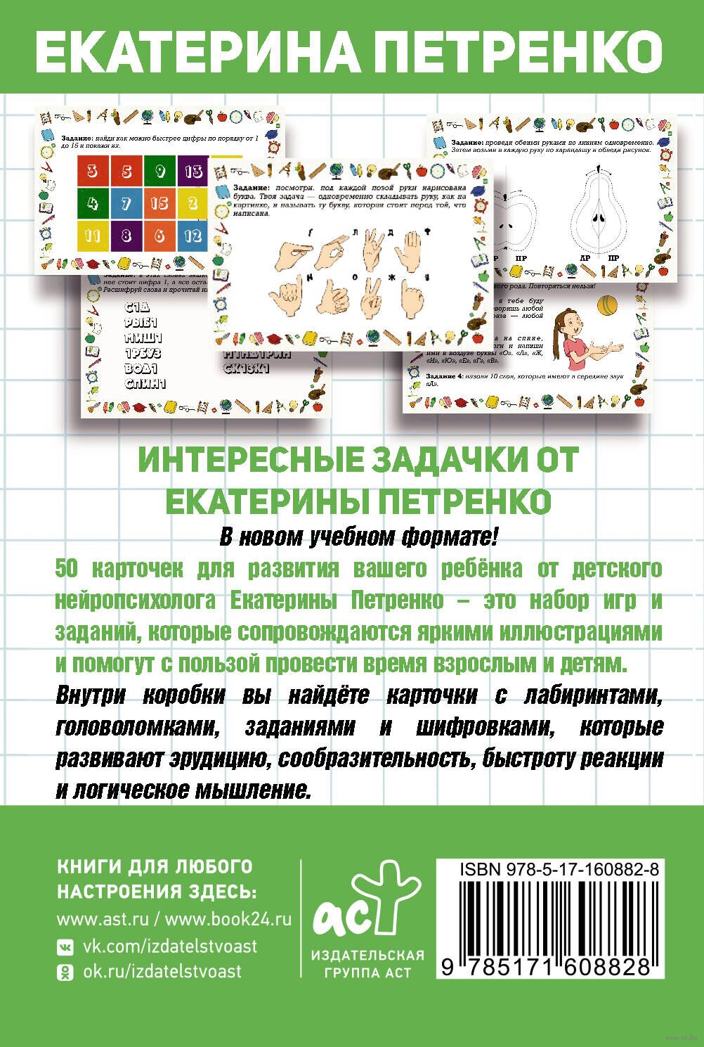 50 карточек для развития вашего ребенка от детского нейропсихолога Екатерины Петренко – это набор игр и заданий, которые сопровождаются яркими иллюстрациями и помогут с пользой провести время взрослым и детям.