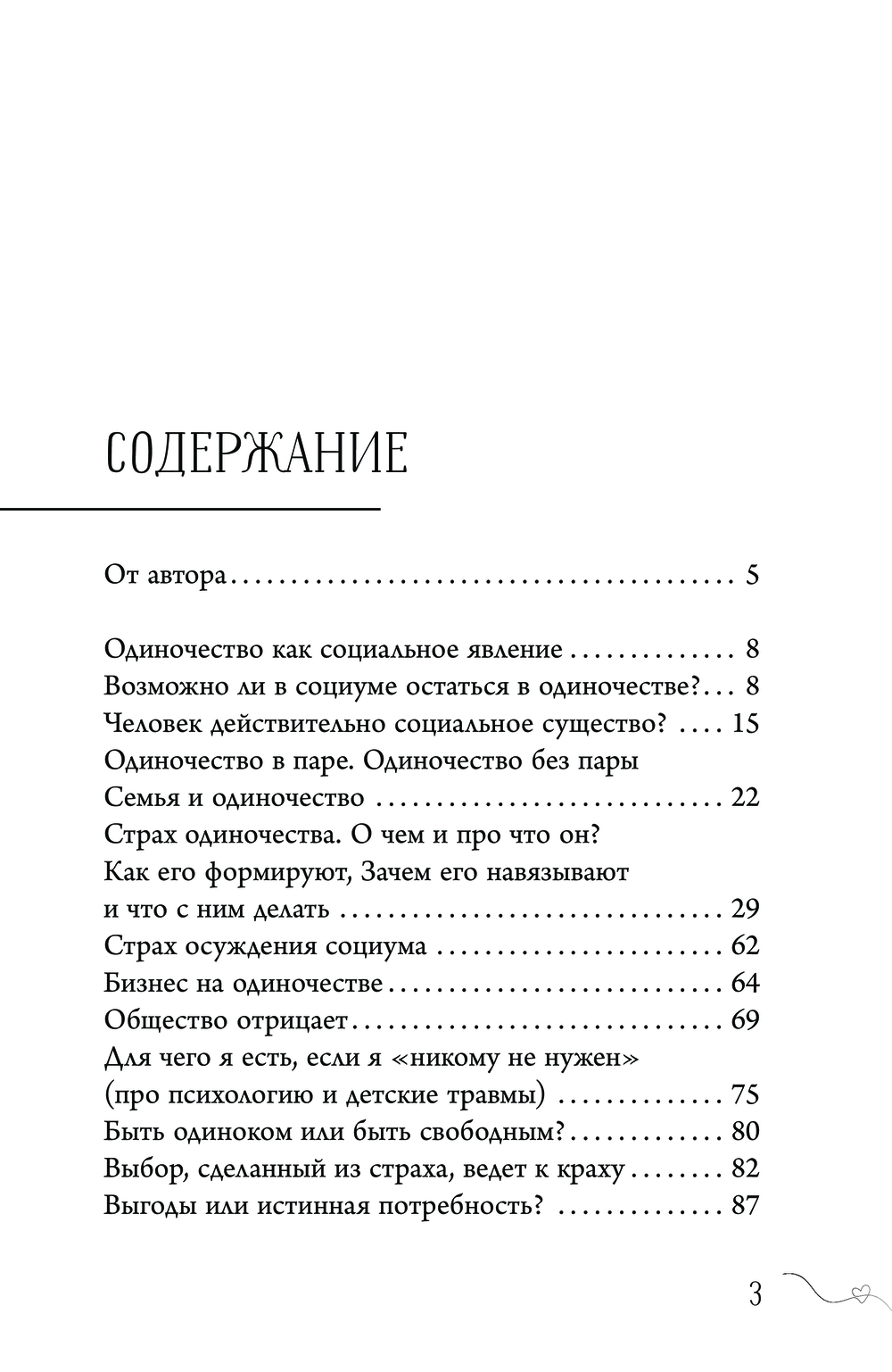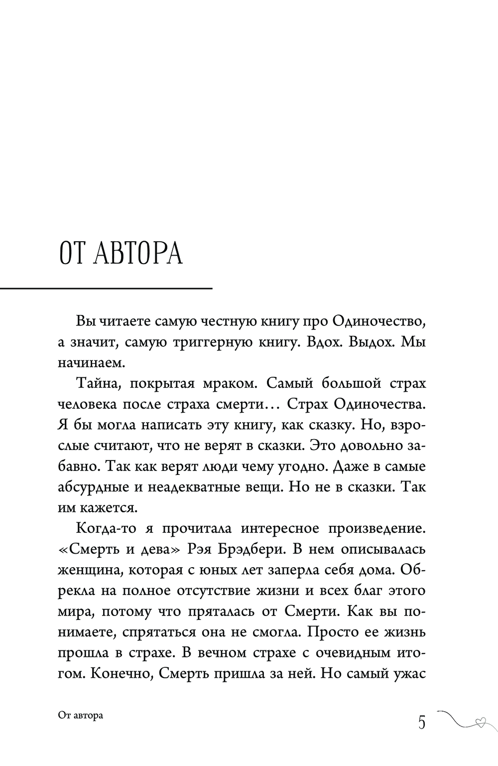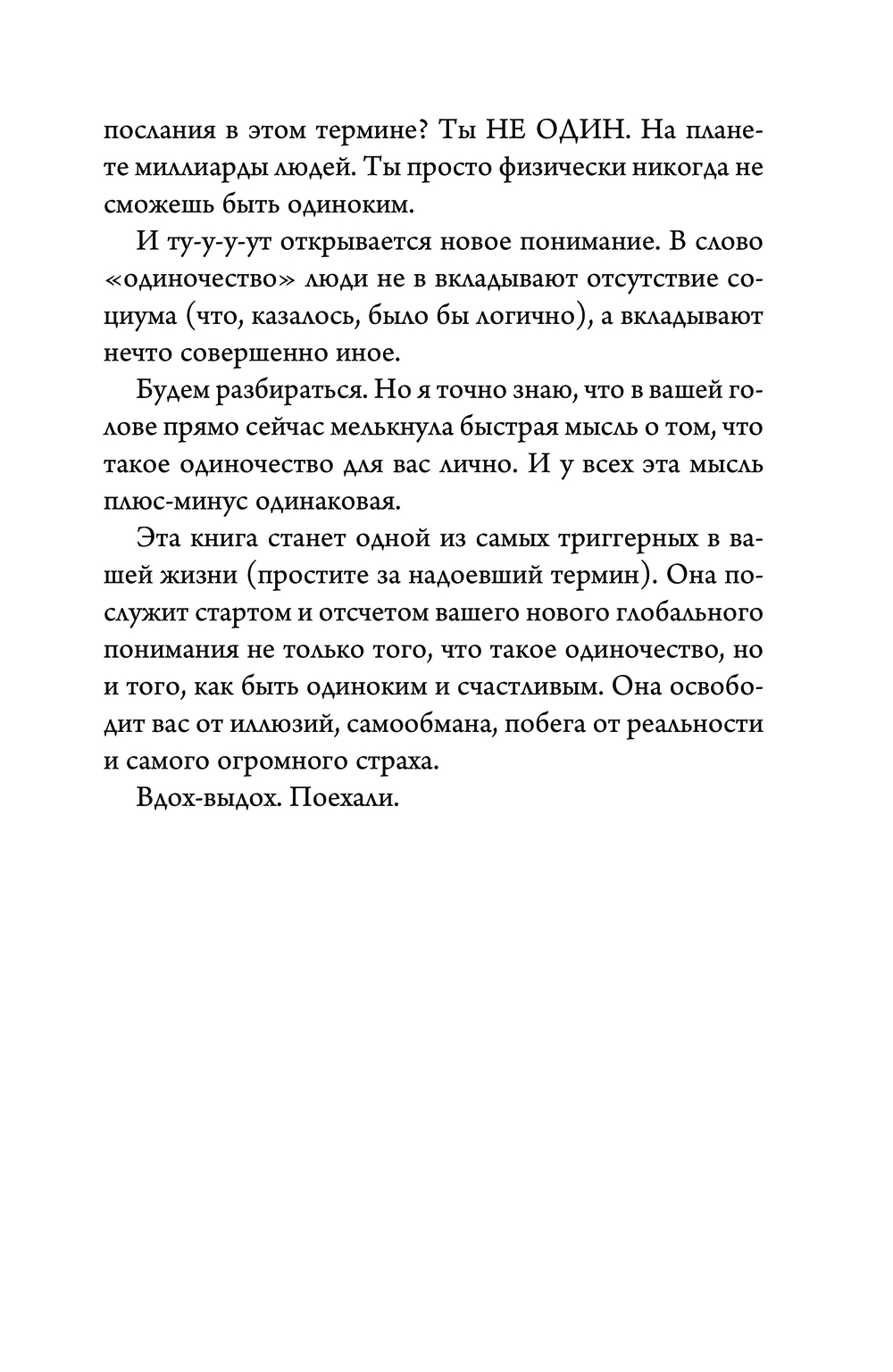 Вы начинаете увлекательное путешествие, которое освободит вас от иллюзий, самообмана, побега от реальности и самого огромного страха. Вы поймете, что одиночество может быть осознанным выбором, а жизнь одной – в кайф.