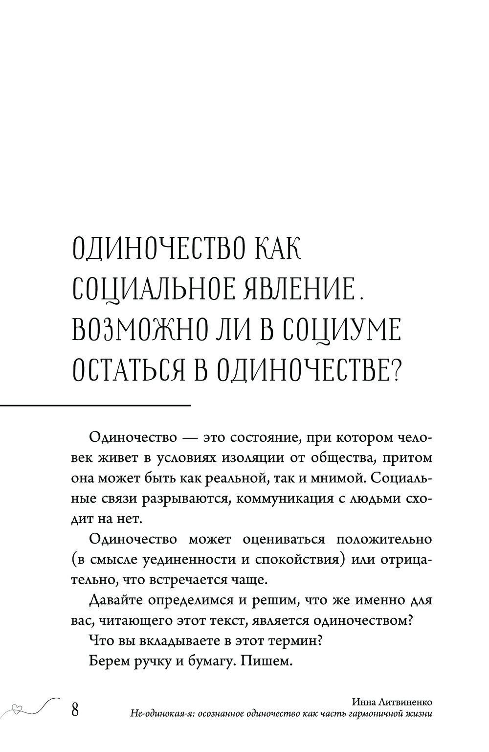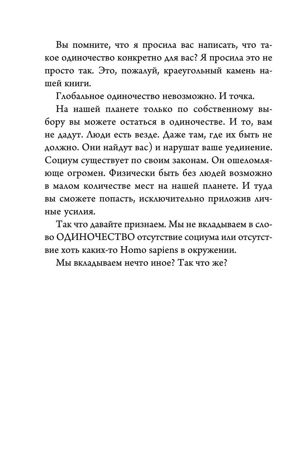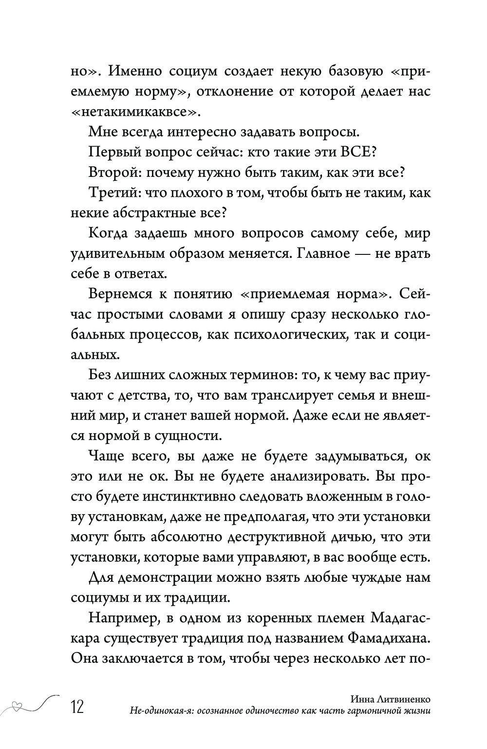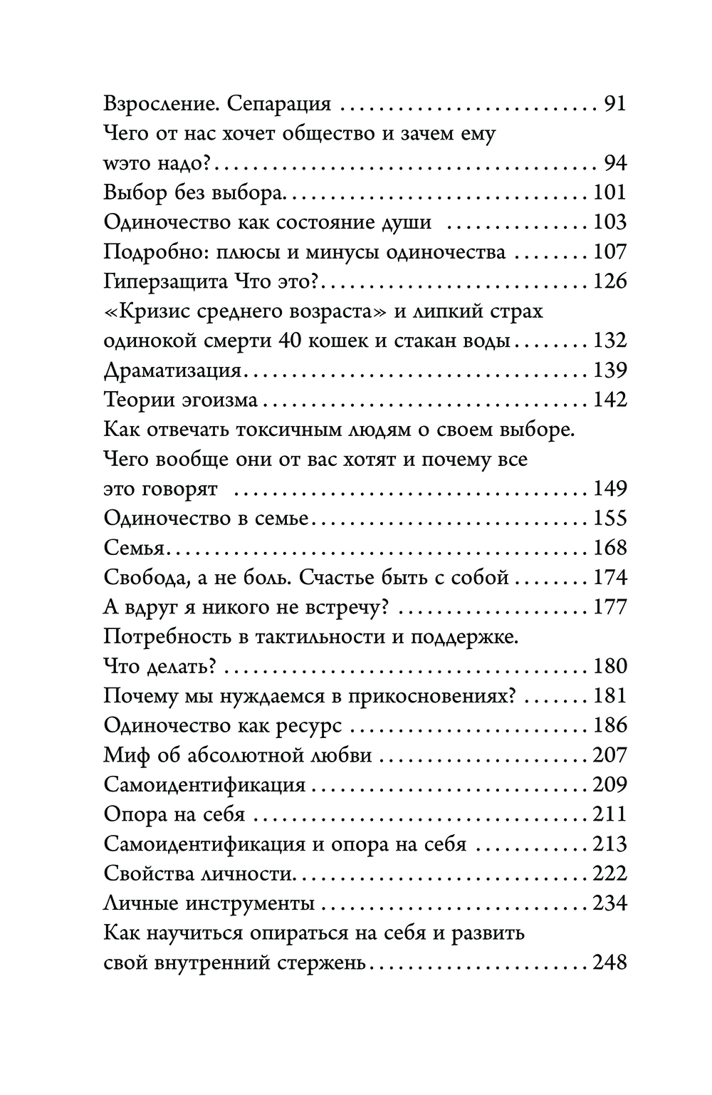 Вы начинаете увлекательное путешествие, которое освободит вас от иллюзий, самообмана, побега от реальности и самого огромного страха. Вы поймете, что одиночество может быть осознанным выбором, а жизнь одной – в кайф.