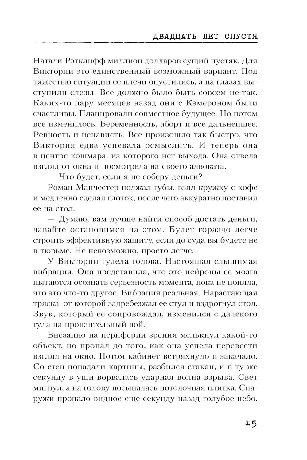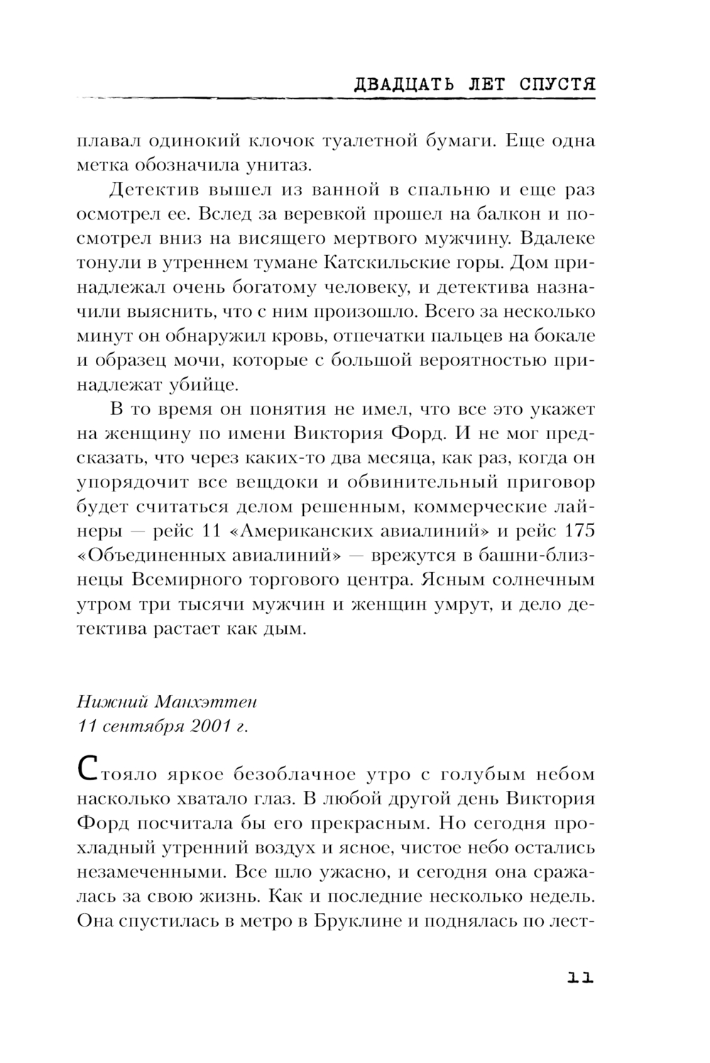 Расследовать дело двадцатилетней давности – почему бы и нет. Новая технология позволила судмедэкспертизе Нью-Йорка впервые за многие годы успешно идентифицировать жертву теракта 11 сентября. Неожиданное обстоятельство: жертву, Викторию Форд, обвинили в изощренном убийстве ее женатого любовника. Во время леденящего душу последнего телефонного звонка из рушащейся башни Виктория умоляла свою сестру доказать ее невиновность. Двадцать лет назад ее никто не услышал. Сегодня ее рассказ услышите вы.