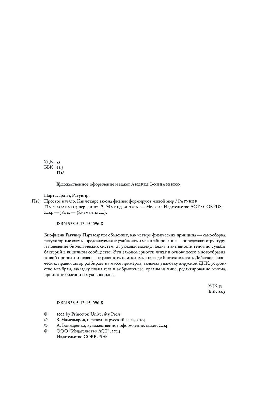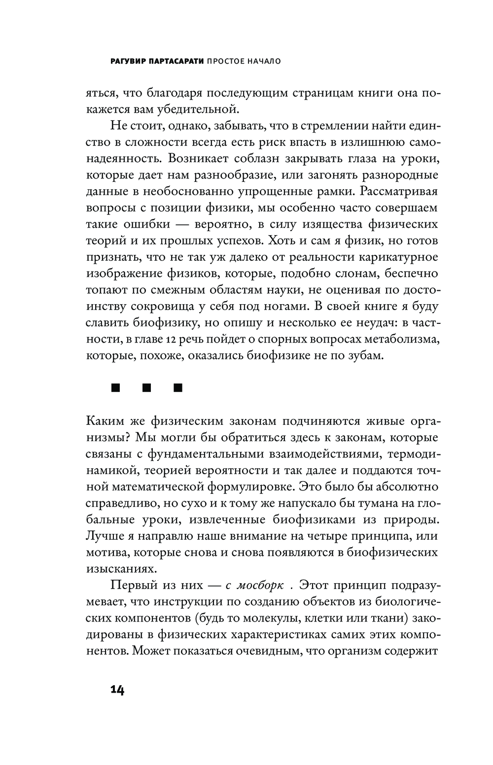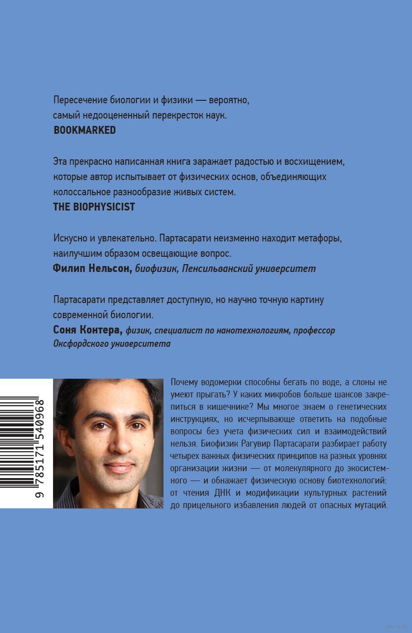 Биофизик Рагувир Партасарати объясняет, как четыре физических принципа – самосборка, регуляторные схемы, предсказуемая случайность и масштабирование – определяют структуру и поведение биологических систем, от укладки молекул белка и активности генов до судьбы бактерий в кишечном сообществе. Эти закономерности лежат в основе всего многообразия живой природы и позволяют развивать немыслимые прежде биотехнологии. Действие физических правил автор разбирает на массе примеров, включая упаковку вирусной ДНК, устройство мембран, закладку плана тела в эмбриогенезе, органы на чипе, редактирование генома, прионные болезни и муковисцидоз.