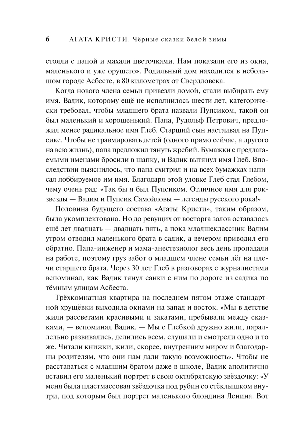 "Агата Кристи" – одна из самых знаменитых и значимых российских рок-групп, однако путь к вершинам рок-славы был нелегким. Коллективу пришлось пережить взлёты и падения, пристрастие к алкоголю и наркотикам, потери друзей и распады семей. О нелёгкой жизни группы правдиво, с массой неизвестных ранее подробностей рассказывает известный историограф уральского рока Дмитрий Карасюк.