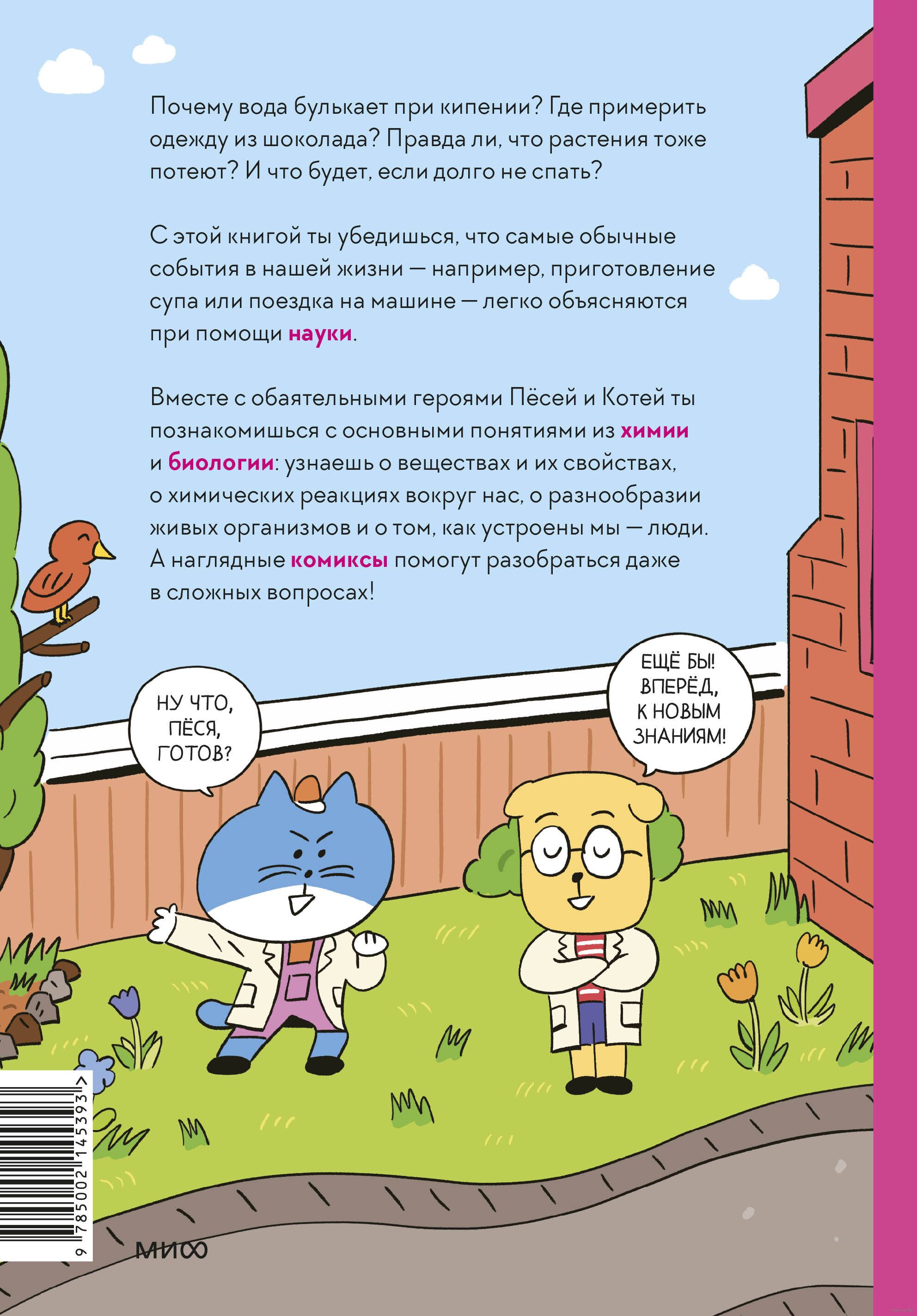 Вместе с обаятельными героями Пёсей и Котей читатели познакомятся с основами химии и биологии: узнают, что такое агрегатные состояния вещества, кислоты и щелочи, чем отличаются животные, растения и грибы, из чего состоит экосистема и как работает наше тело.