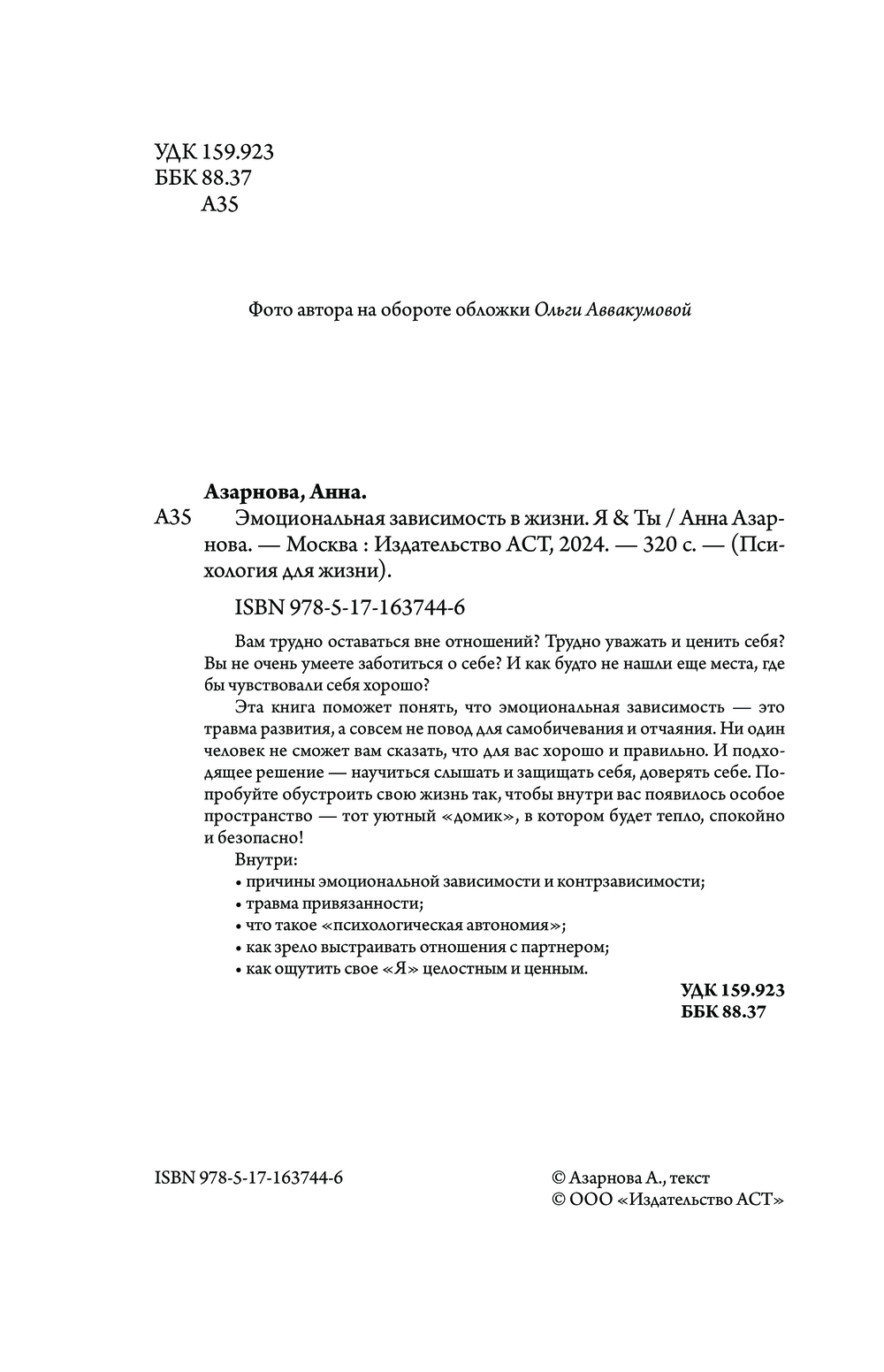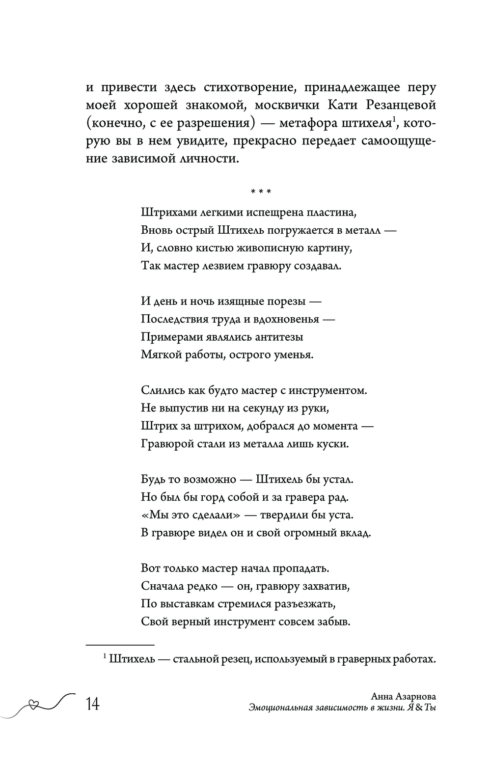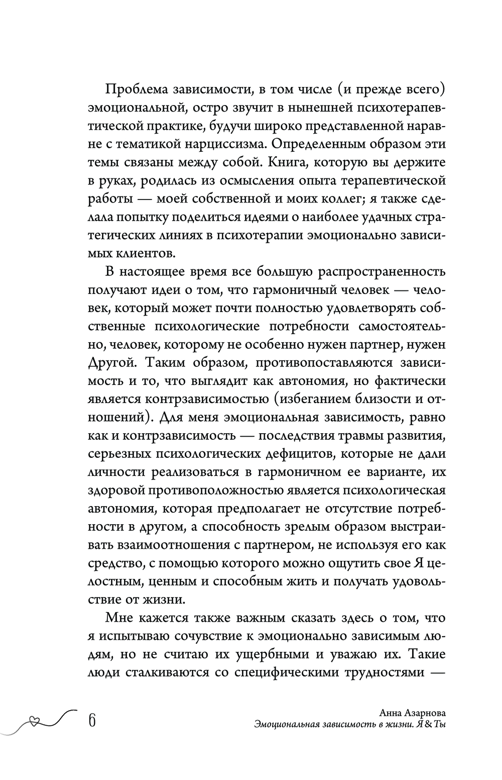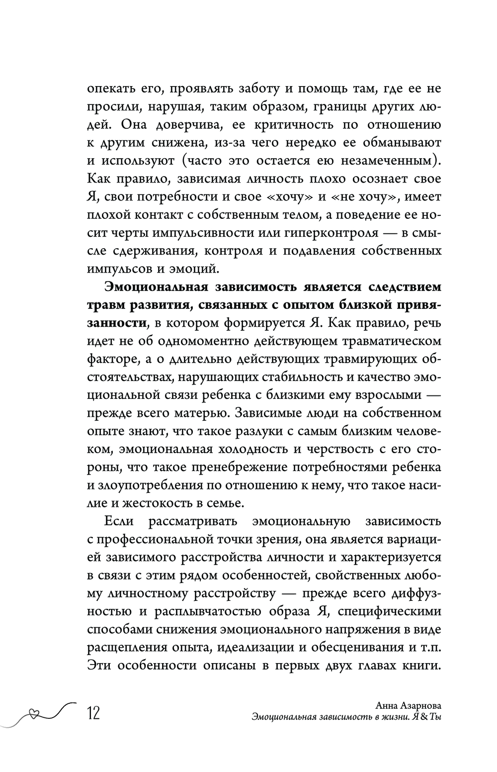 Эта книга поможет понять, что эмоциональная зависимость – это травма развития, а совсем не повод для самобичевания и отчаяния. Ни один человек не сможет вам сказать, что для вас хорошо и правильно. И подходящее решение – научиться слышать и защищать себя, доверять себе. Попробуйте обустроить cвою жизнь так, чтобы внутри вас появилось особое пространство – тот уютный "домик", в котором будет тепло, спокойно и безопасно!