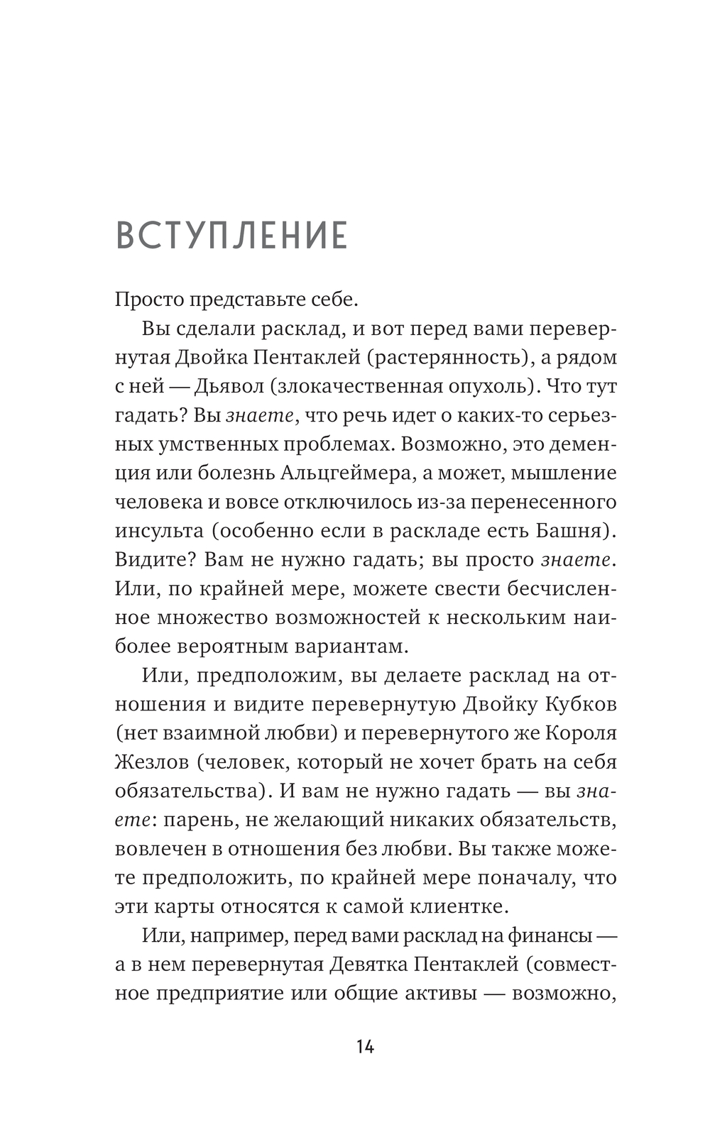 В процессе многолетней практики Джинни Рид разработала собственную систему чтения карт, основанную на устойчивых сочетаниях: работая со своими клиентами, она обнаружила, что появление одних и тех же карт и комбинаций указывают на одни и те же ситуации и проблемы в жизни самых разных людей! В своей книге она приводит множество таких комбинаций, связанных с самыми разными темами: любовь и отношения, деньги, здоровье – и делится многочисленными примерами из собственной практики.