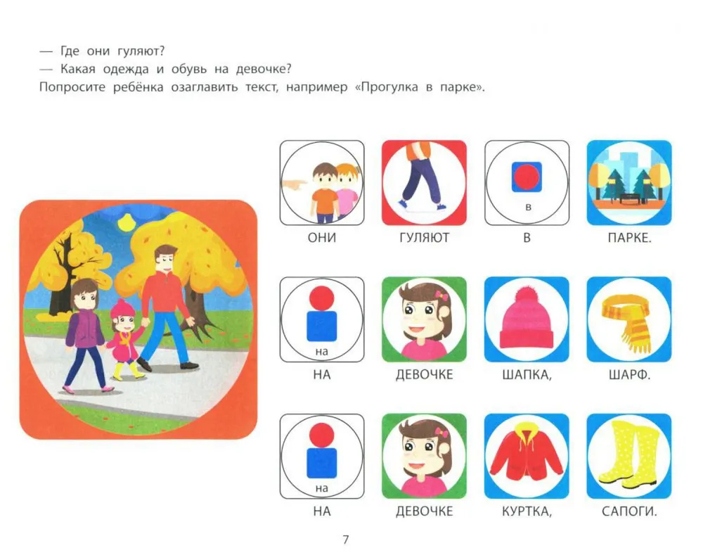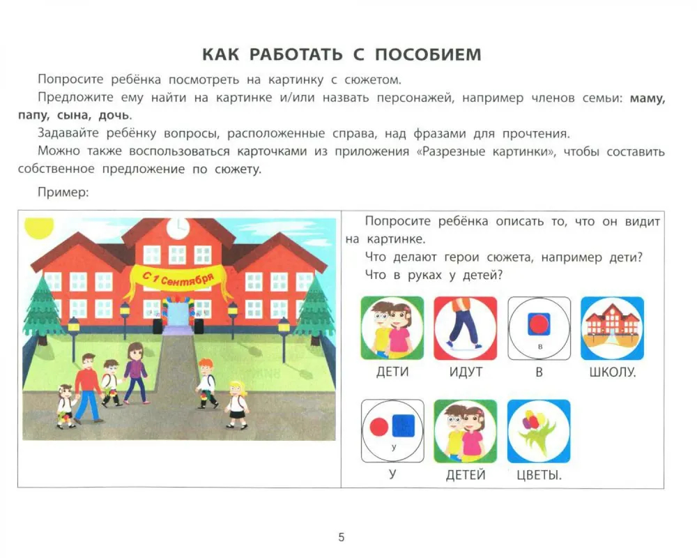 К каждому сюжету прилагаются фразы для чтения. Ребёнок с помощью наглядного моделирования предложения автоматизирует навык построения фраз, обогащая словарный запас и постигая азы чтения.