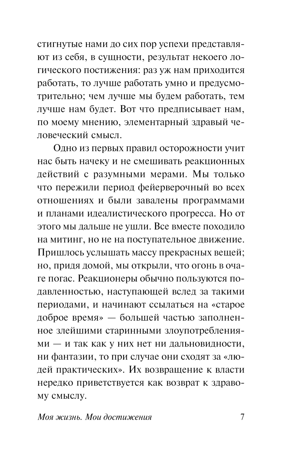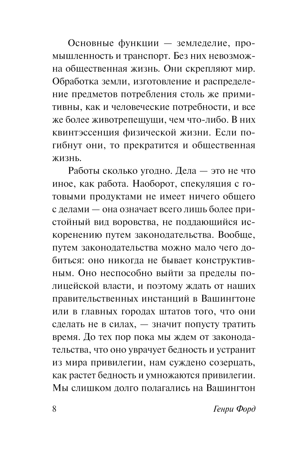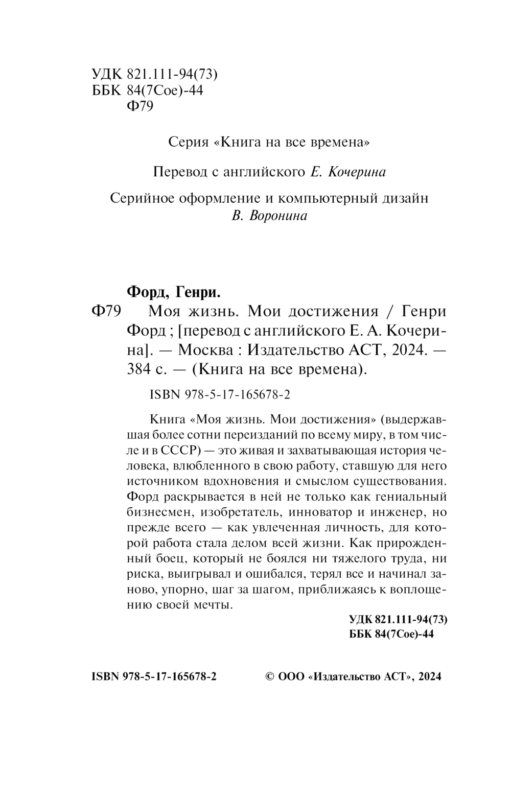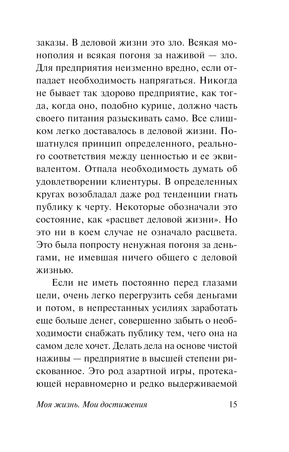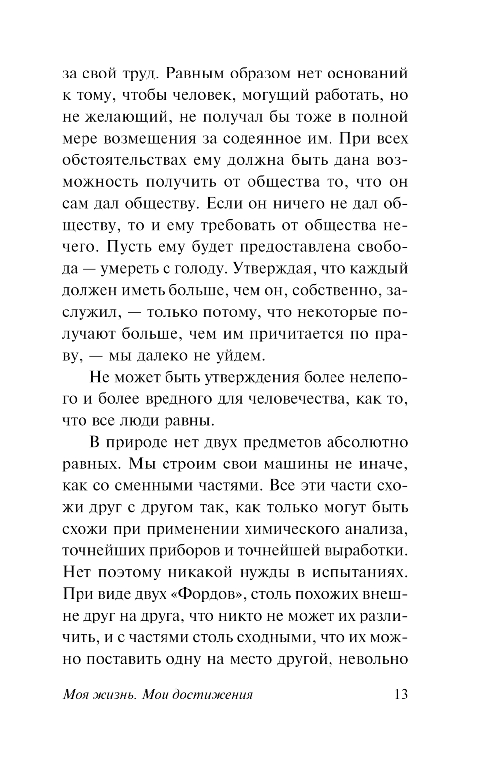 Книга "Моя жизнь. Мои достижения" (выдержавшая более сотни переизданий по всему миру, в том числе и в СССР) – это живая и захватывающая история человека, влюбленного в свою работу, ставшую для него источником вдохновения и смыслом существования. Форд раскрывается в ней не только как гениальный бизнесмен, изобретатель, инноватор и инженер, но прежде всего – как увлеченная личность, для которой работа стала делом всей жизни. Как прирожденный боец, который не боялся ни тяжелого труда, ни риска, выигрывал и ошибался, терял все и начинал заново, упорно, шаг за шагом приближаясь к воплощению своей мечты.