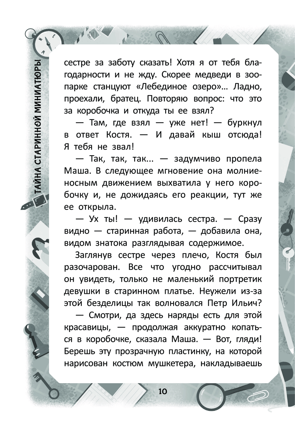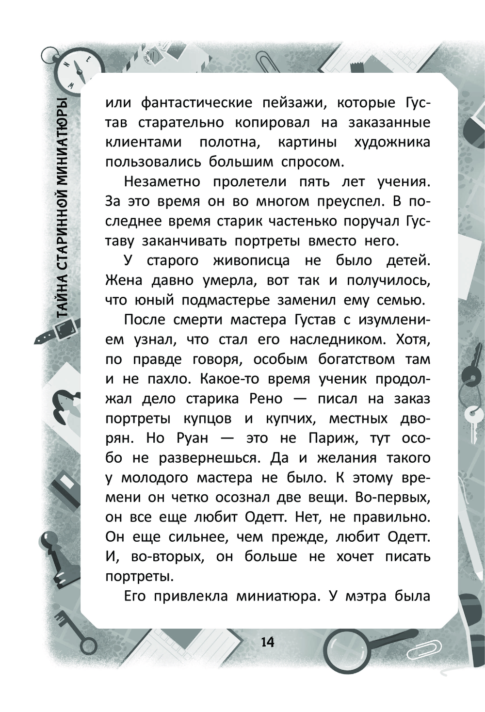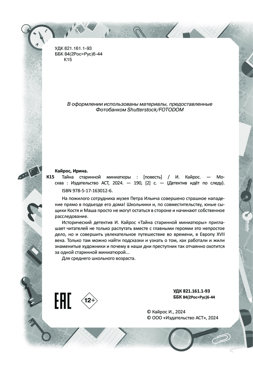 Исторический детектив И. Кайрос "Тайна старинной миниатюры" приглашает читателей не только распутать вместе с главными героями это непростое дело, но и совершить увлекательное путешествие во времени, в Европу 17 века. Только там можно найти подсказки и узнать о том, как работали и жили знаменитые художники и почему в наши дни преступник так отчаянно охотится за одной старинной миниатюрой...