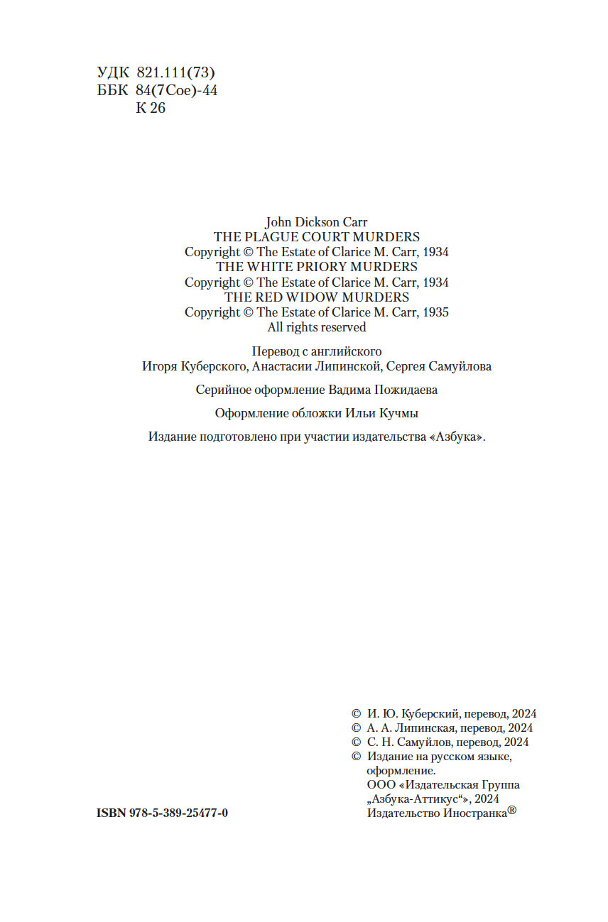 | Название в оригинале | The Plague Court Murders. The White Priory Murders. The Red Widow Murders |