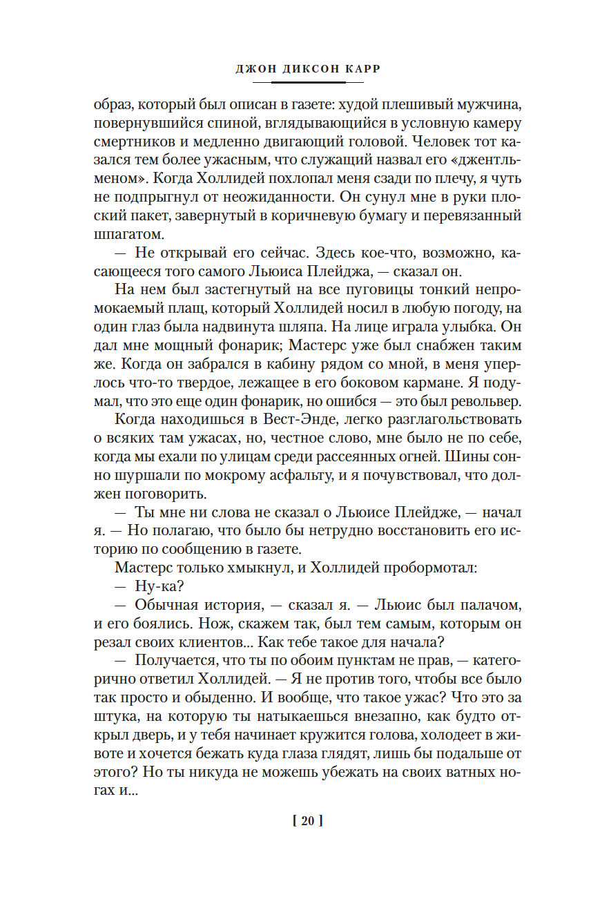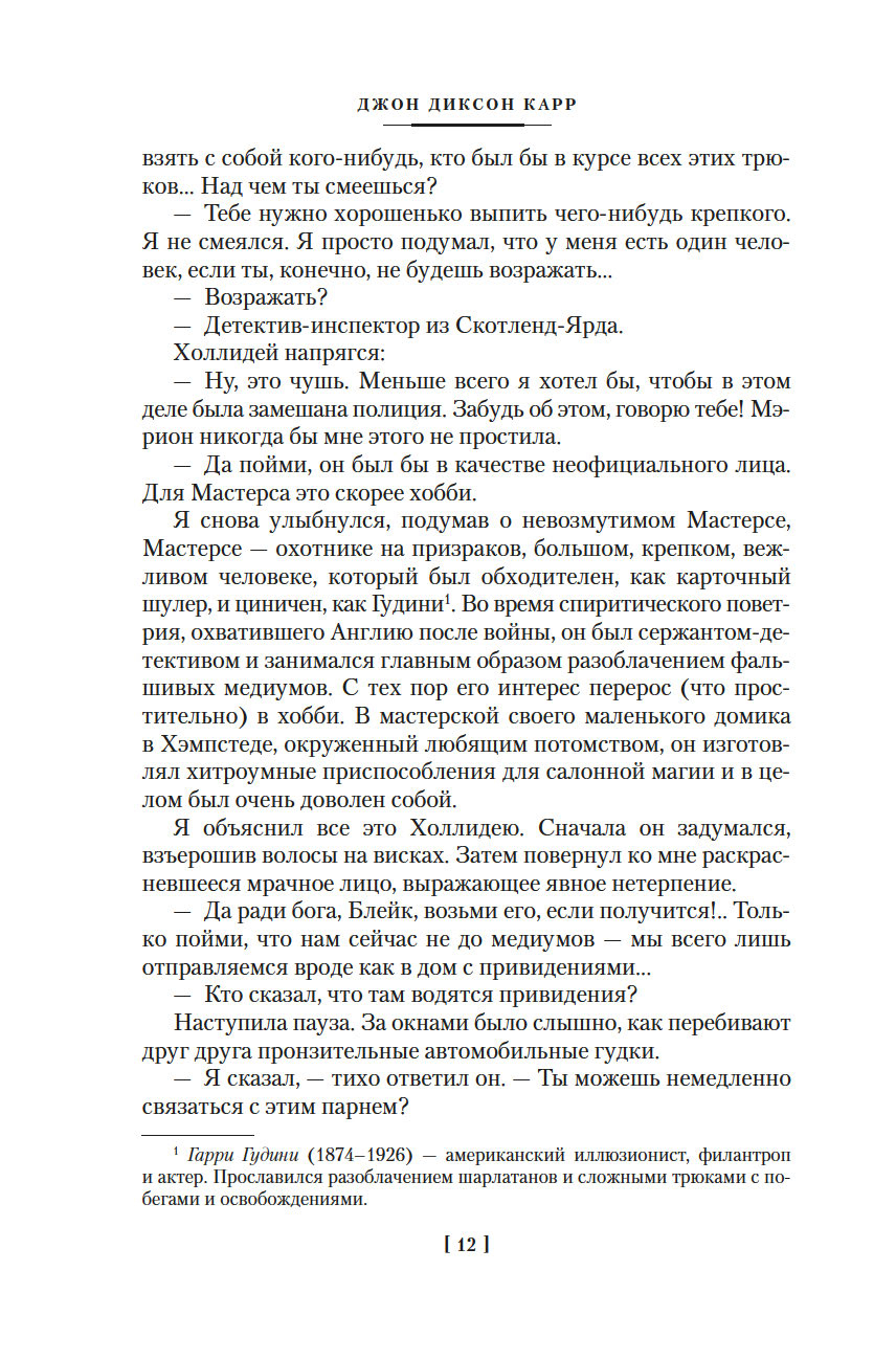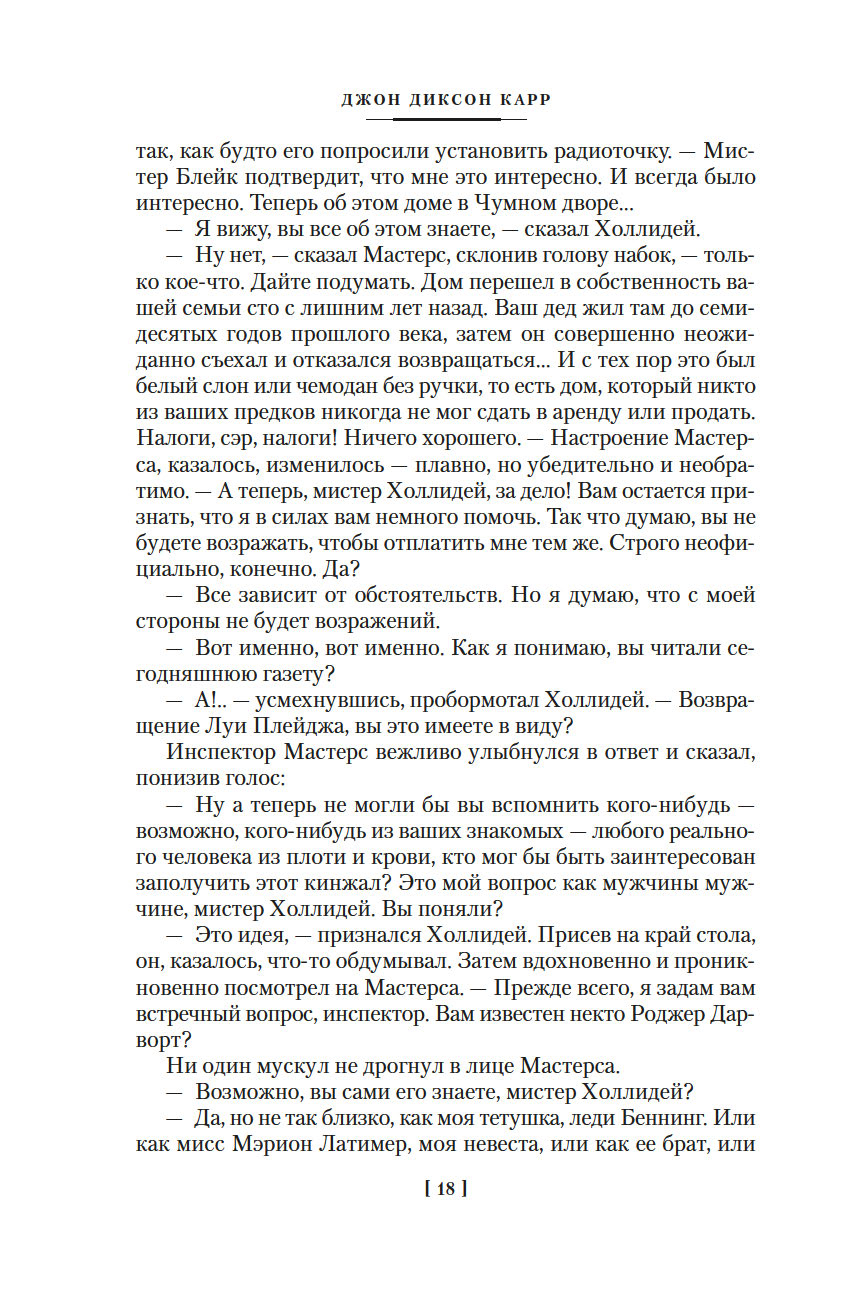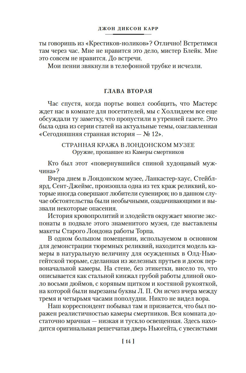 Золотой век детектива оставил немало звездных имен – А. Кристи, Г. К. Честертон, Г. Митчелл и др. В этой яркой плеяде Джон Диксон Карр (1906-1977) занимает самое почетное место. "Убийство в запертой комнате", где нет места бешеным погоням и перестрелкам, а круг подозреваемых максимально ограничен, – излюбленный сюжет автора. Карр вовлекает читателя в искусную игру, заманивая в сети ловко расставленных ловушек, ложных подсказок, обманных ходов и тонких намеков, и предлагает принять участие в решении хитроумной головоломки.