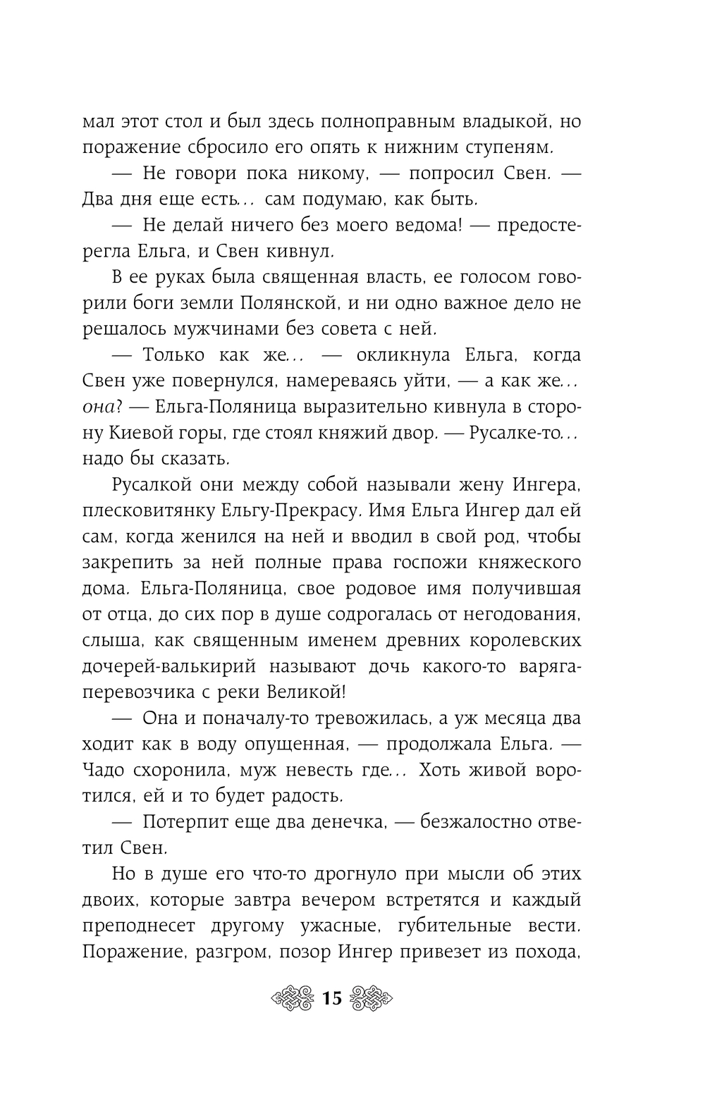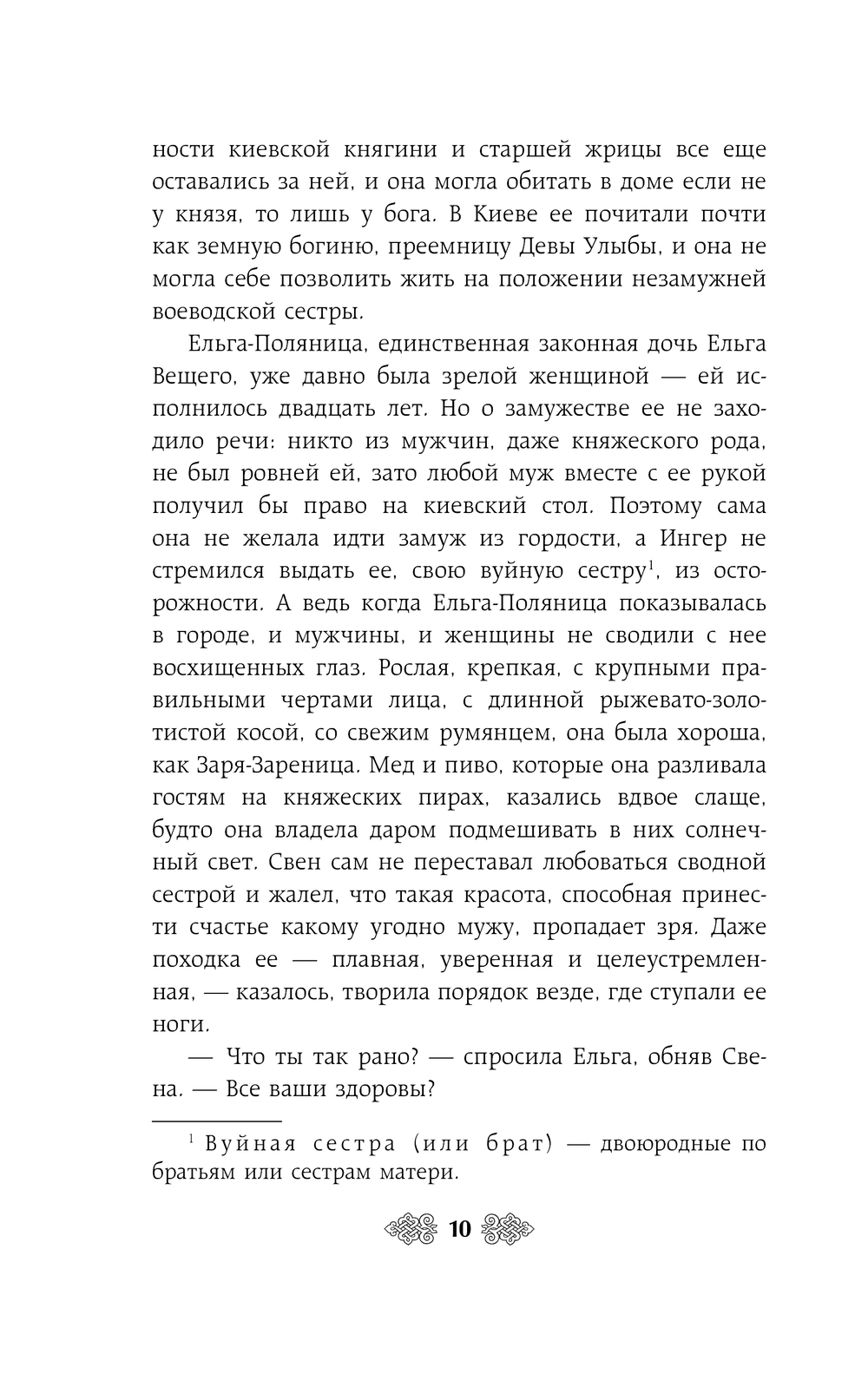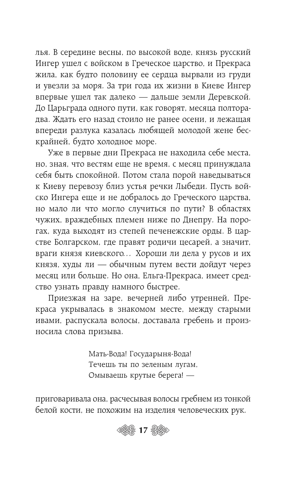 За престол киевской княгини соперничают две женщины: Ельга-Поляница, родная дочь покойного Ельга Вещего, и Ельга-Прекраса, жена его наследника. Низкородную Прекрасу в Киеве недолюбливают, но вот наконец ее долгожданный сын-наследник достигает трехлетнего возраста. Путь к этому был непрост – духи воды наделяют Прекрасу колдовской силой, но и дорого берут за свою помощь. Ельга-Поляница передает Прекрасе священную чашу, а с ней права хозяйки княжьего дома. Теперь Прекраса стремится выдать замуж сестру князя. На руку знатной красавицы претендуют несколько знатных женихов, но сама она долго не может решить, кто же ей по сердцу. Которая же из них со временем войдет в предания под именем мудрой княгини Ольги?
