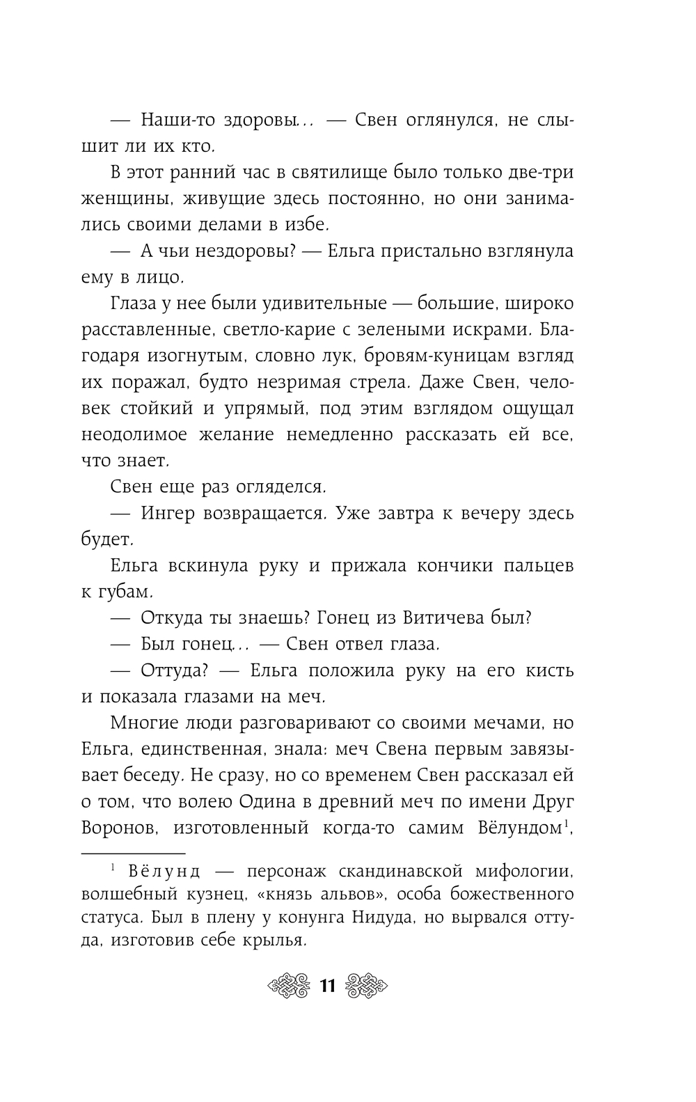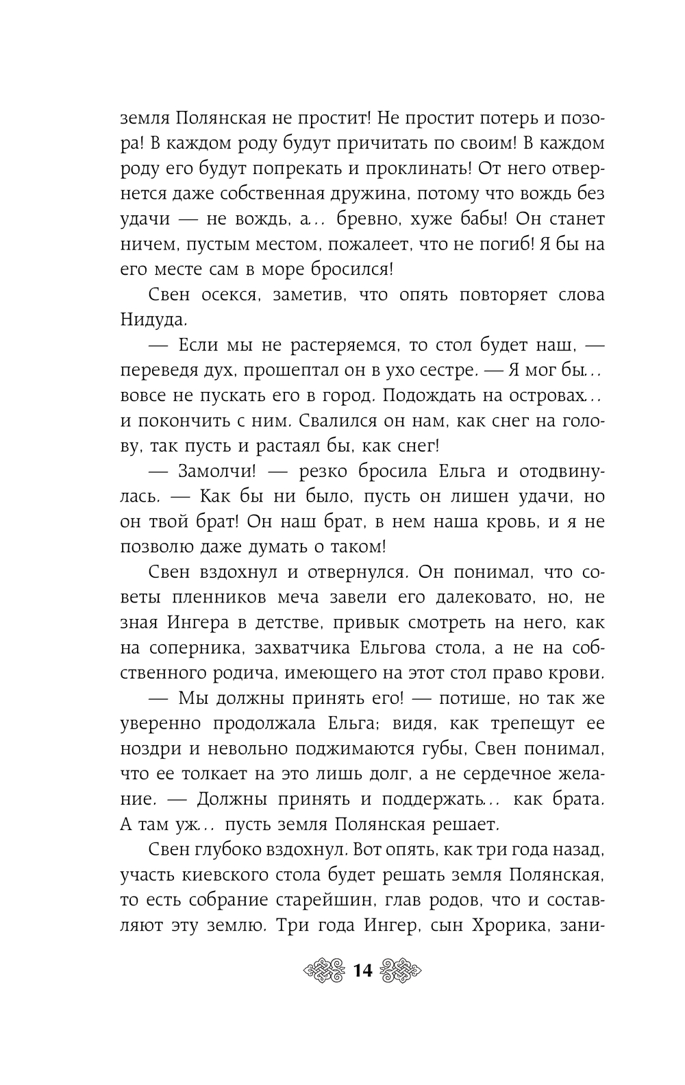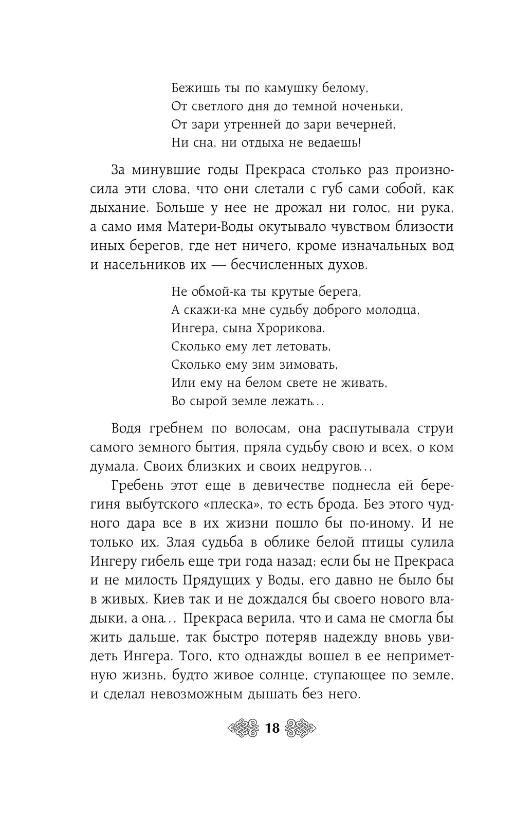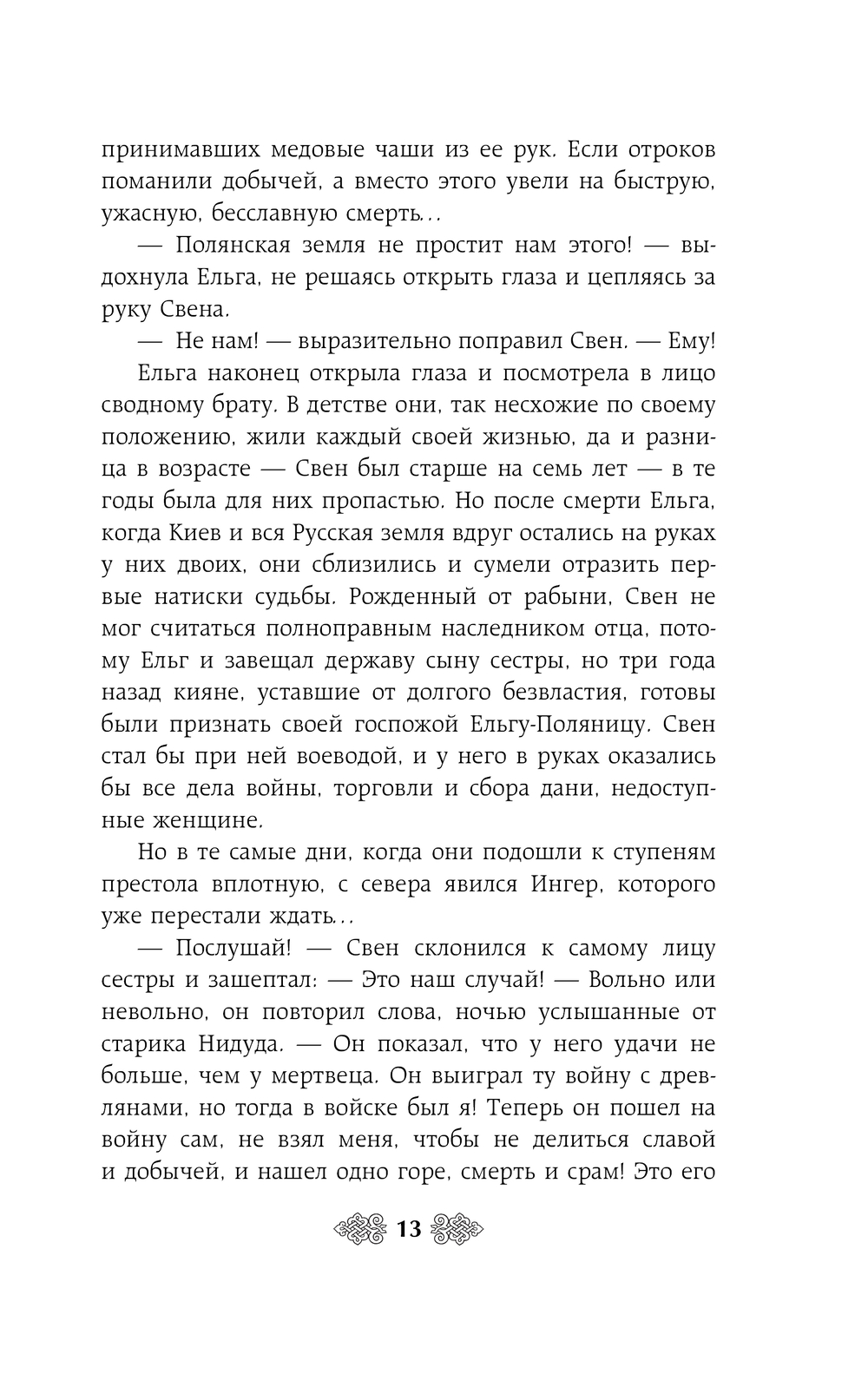 За престол киевской княгини соперничают две женщины: Ельга-Поляница, родная дочь покойного Ельга Вещего, и Ельга-Прекраса, жена его наследника. Низкородную Прекрасу в Киеве недолюбливают, но вот наконец ее долгожданный сын-наследник достигает трехлетнего возраста. Путь к этому был непрост – духи воды наделяют Прекрасу колдовской силой, но и дорого берут за свою помощь. Ельга-Поляница передает Прекрасе священную чашу, а с ней права хозяйки княжьего дома. Теперь Прекраса стремится выдать замуж сестру князя. На руку знатной красавицы претендуют несколько знатных женихов, но сама она долго не может решить, кто же ей по сердцу. Которая же из них со временем войдет в предания под именем мудрой княгини Ольги?