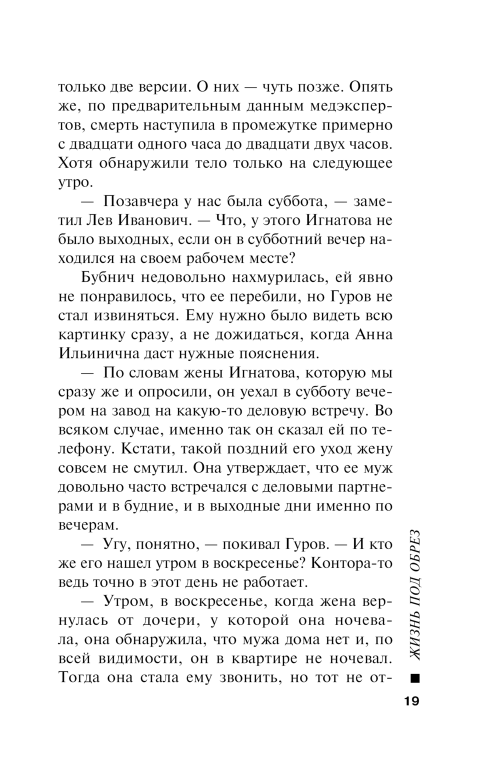 В своем рабочем кабинете из обреза охотничьего ружья убит директор ликеро-водочного завода Владимир Игнатов. Полковники МВД Гуров и Крячко выдвигают две версии произошедшего. Первая: производственный конфликт – один из уволенных работников угрожал Игнатову расправой. И вторая: месть недовольных подельников директора, участвовавших вместе с ним в расхищении заводской продукции... Кроме того, сыщиков заинтересовала и внезапно исчезнувшая любовница Игнатова, которую тот тщательно скрывал. Но версии отпали сами собой, когда за городом был обнаружен муж этой особы, застреленный... из того же обреза, что и Игнатов.