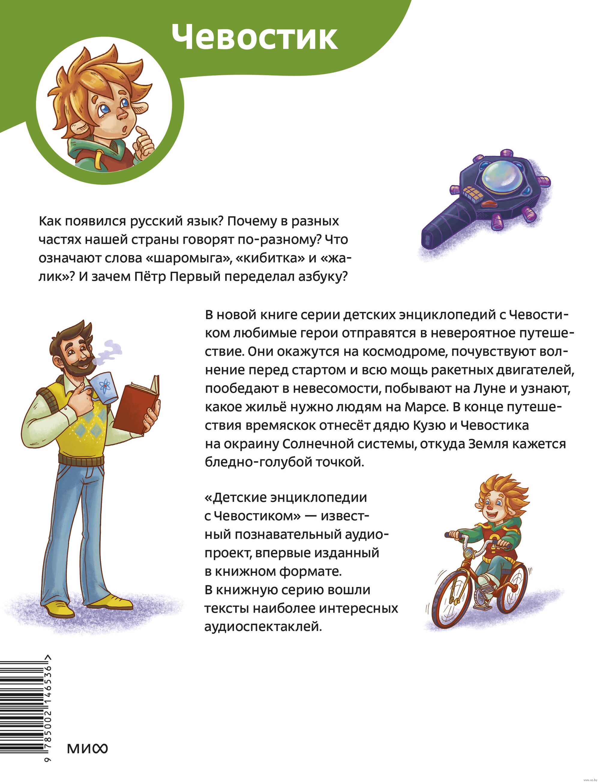 В новой книге серии детских энциклопедий с Чевостиком любимые герои познакомятся с историей русского языка. Они узнают, какие у него были "предки" и "родственники"; услышат, как говорили люди 900 лет назад; разберутся, что такое заимствованные и устаревшие слова и какие бывают литературные стили.