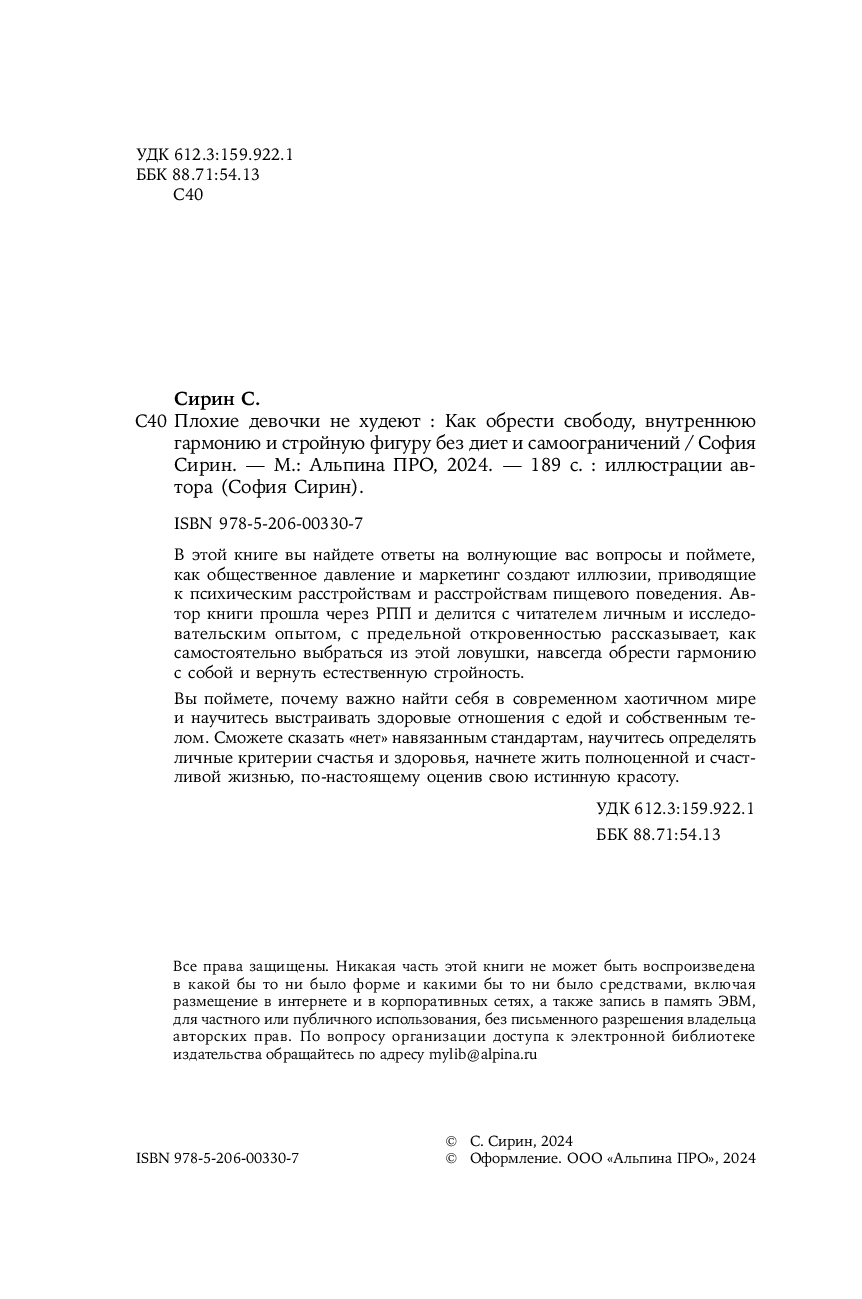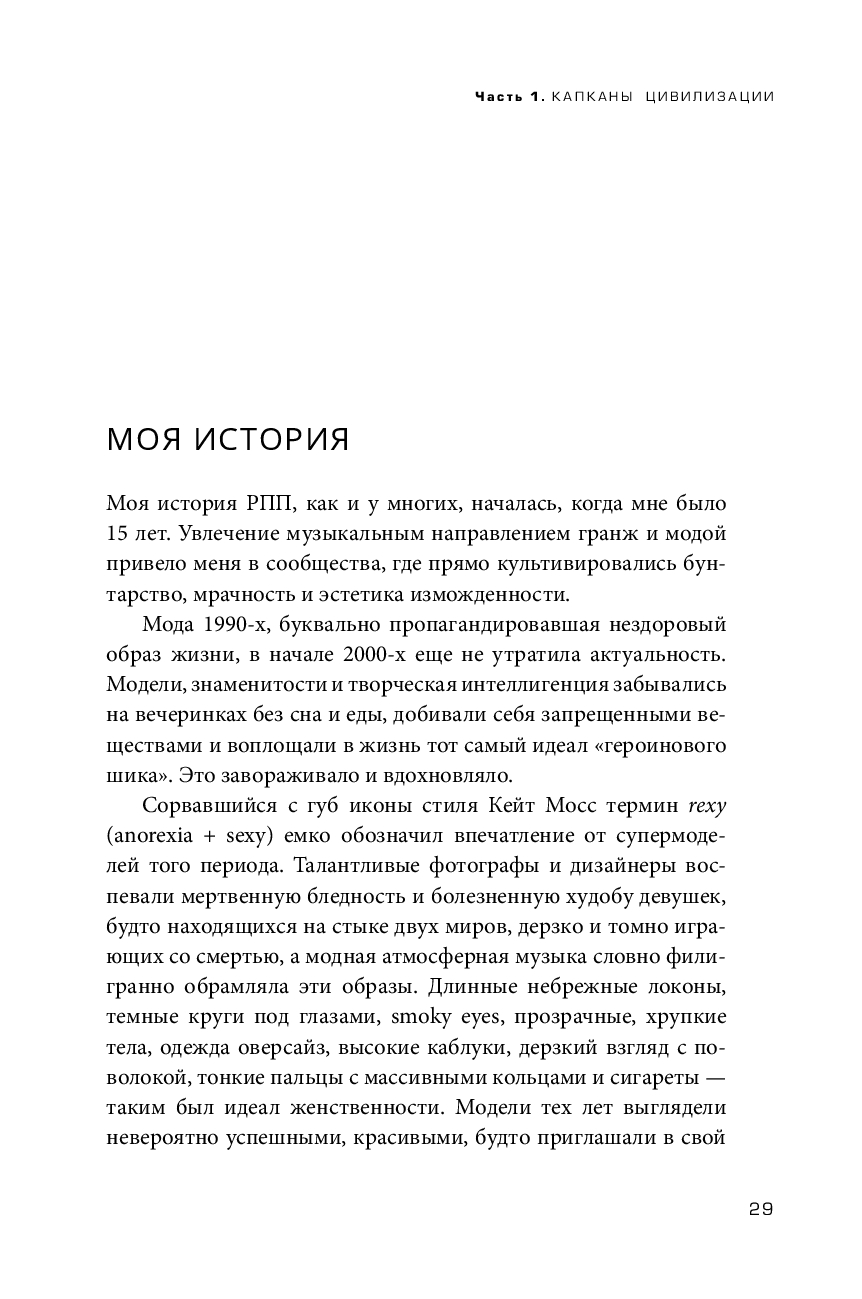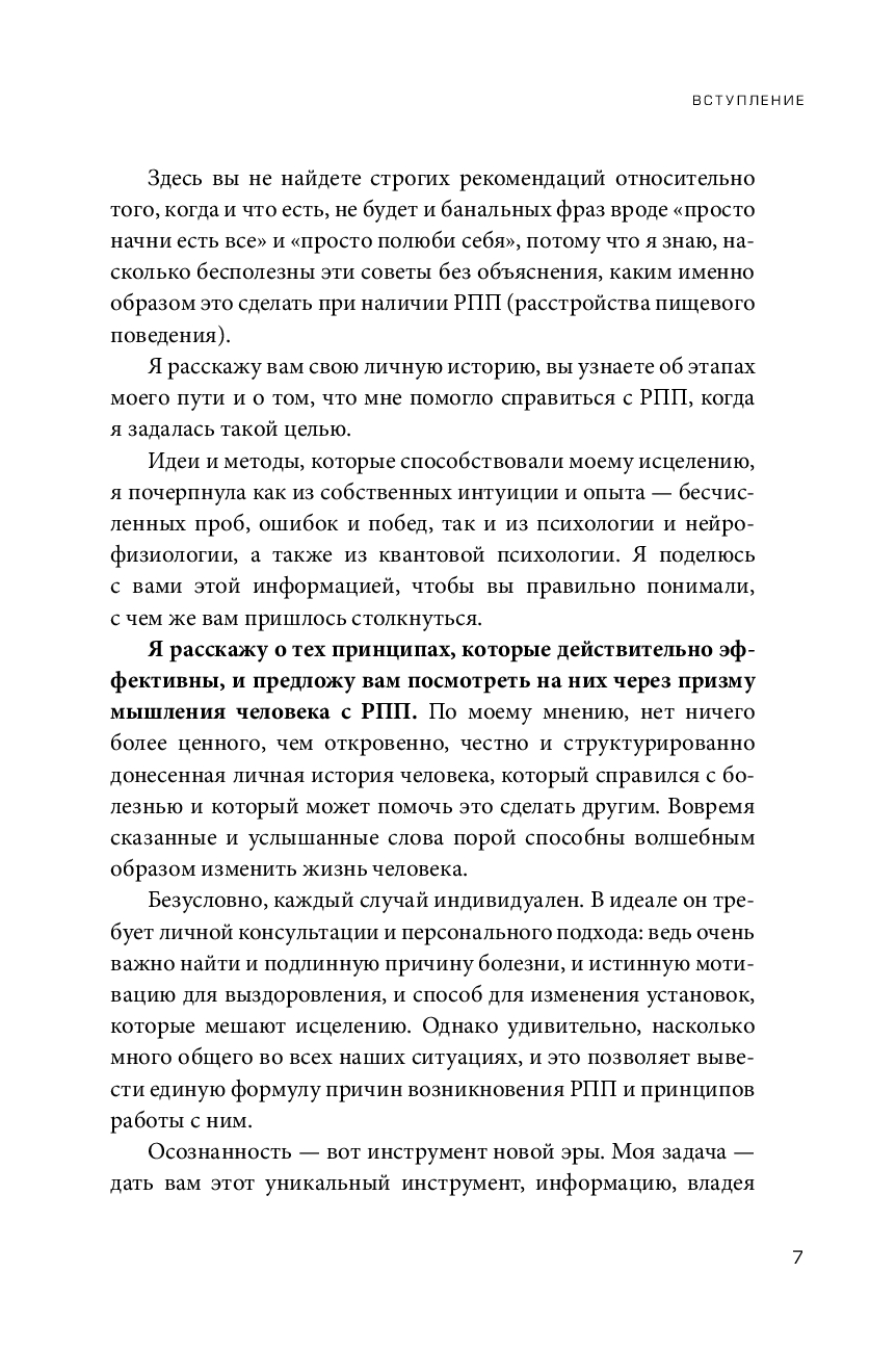 София Сирин подробно объясняет, как ложные идеалы красоты стандарты и бессмысленные программы похудения оказывают давление на наше представление о красоте и питании. Она деликатно, но откровенно рассказывает о расстройствах пищевого поведения и предлагает свои методы исцеления, основанные на личном опыте. Прочитав книгу, вы сможете найти себя в хаосе современности и понять, что стройное тело должно быть естественным результатом образа жизни, а не ее целью.