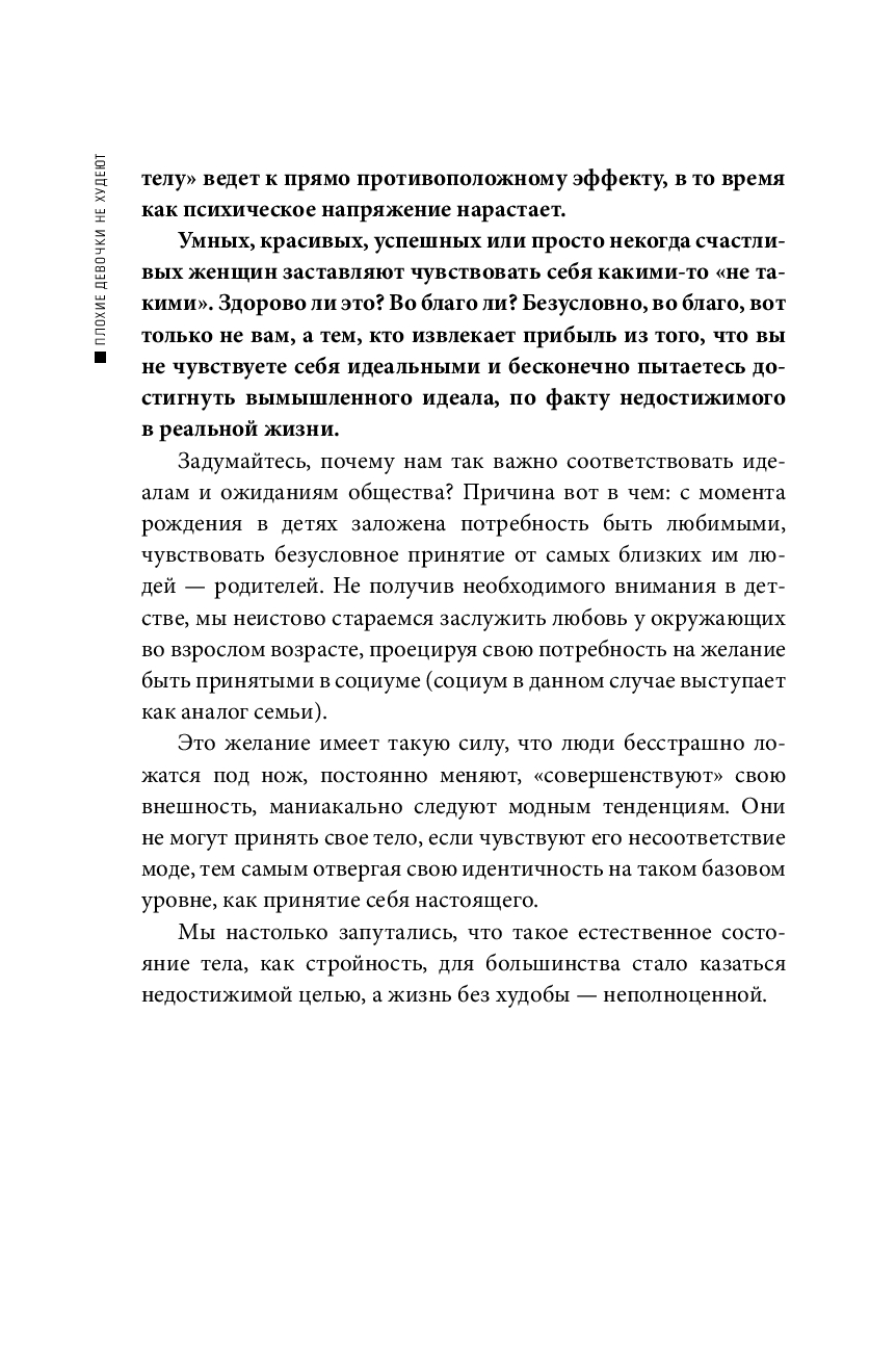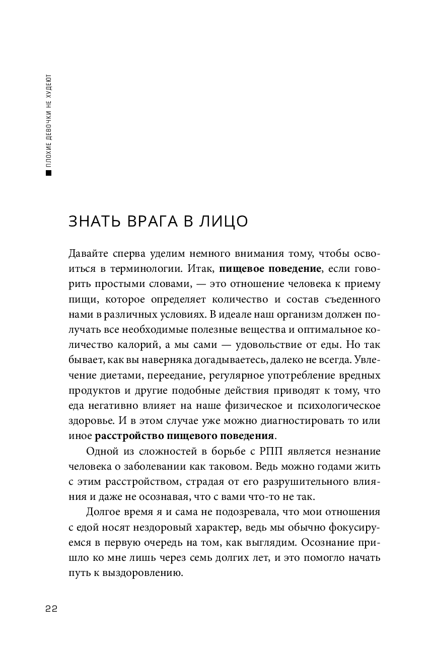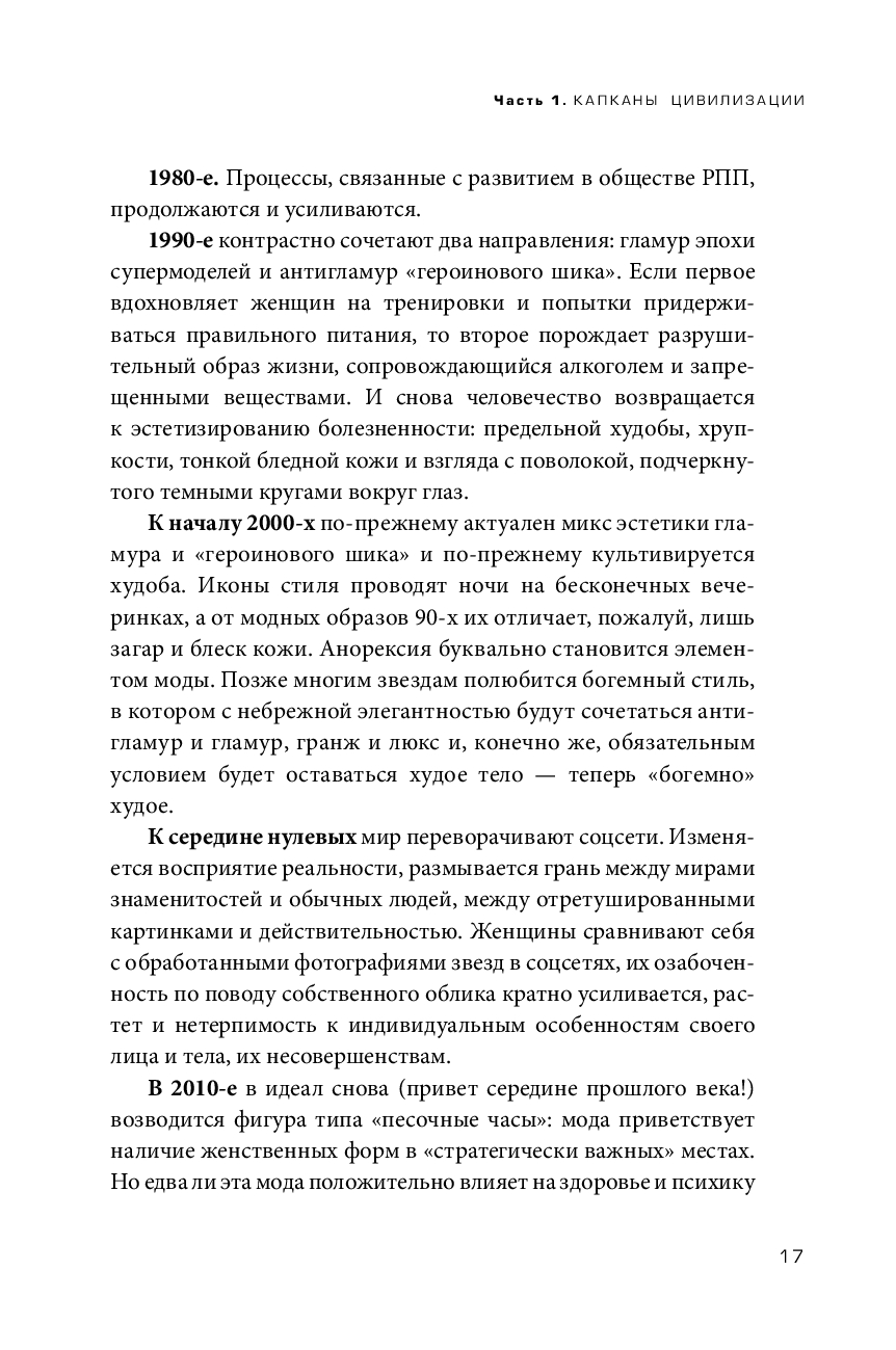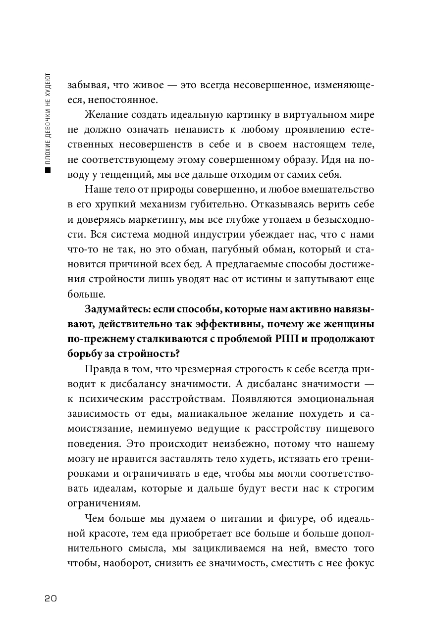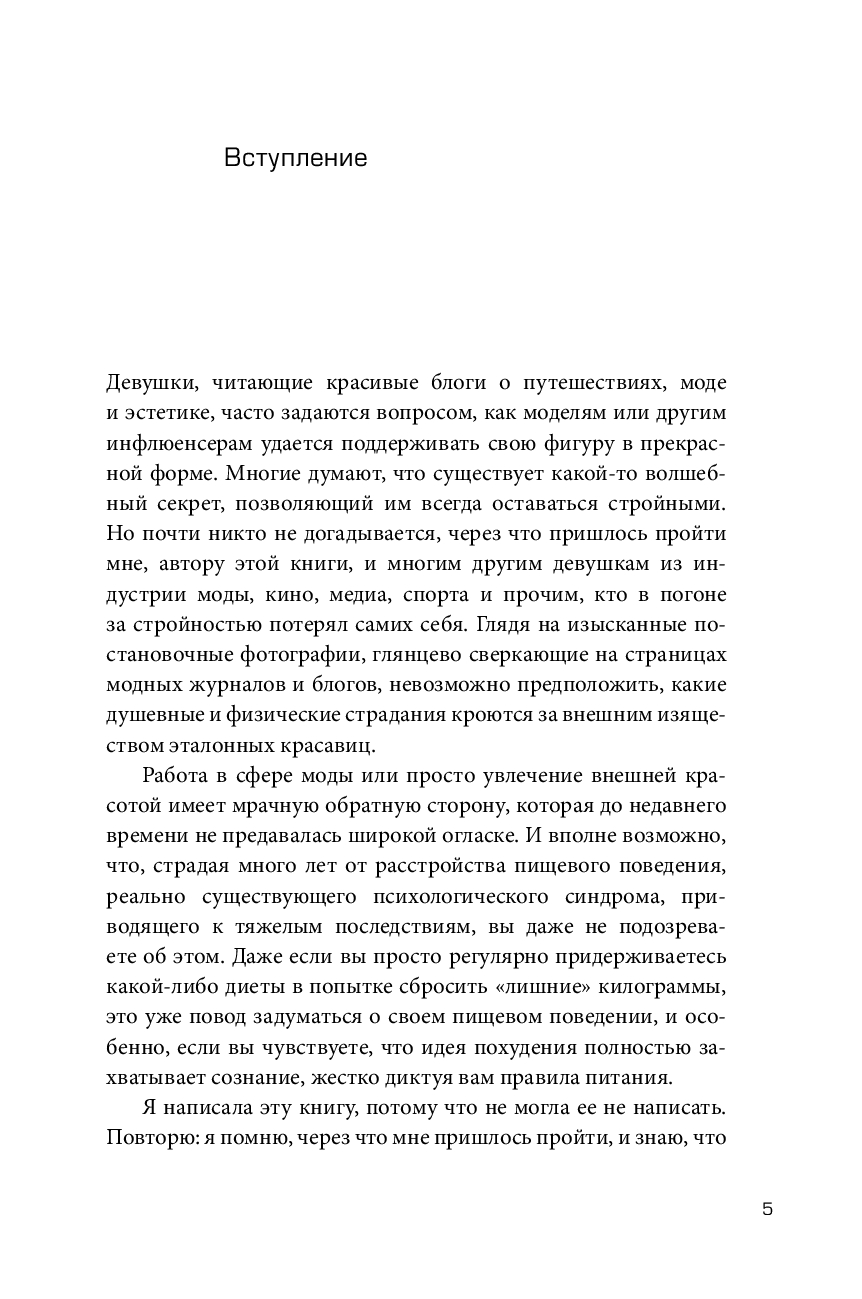 Наше тело от природы совершенно, и вмешательство в его работу может быть губительным. Отказ от веры в себя и подчинение маркетинговым трендам лишь усугубляют чувство безысходности. Почему, несмотря на активно навязываемые идеалы, женщины продолжают бороться за стройность? София отвечает на этот и многие другие вопросы, доказывая, что чрезмерная строгость к себе часто ведет к психическим расстройствам, формируя зависимость от еды и маниакальное желание похудеть.