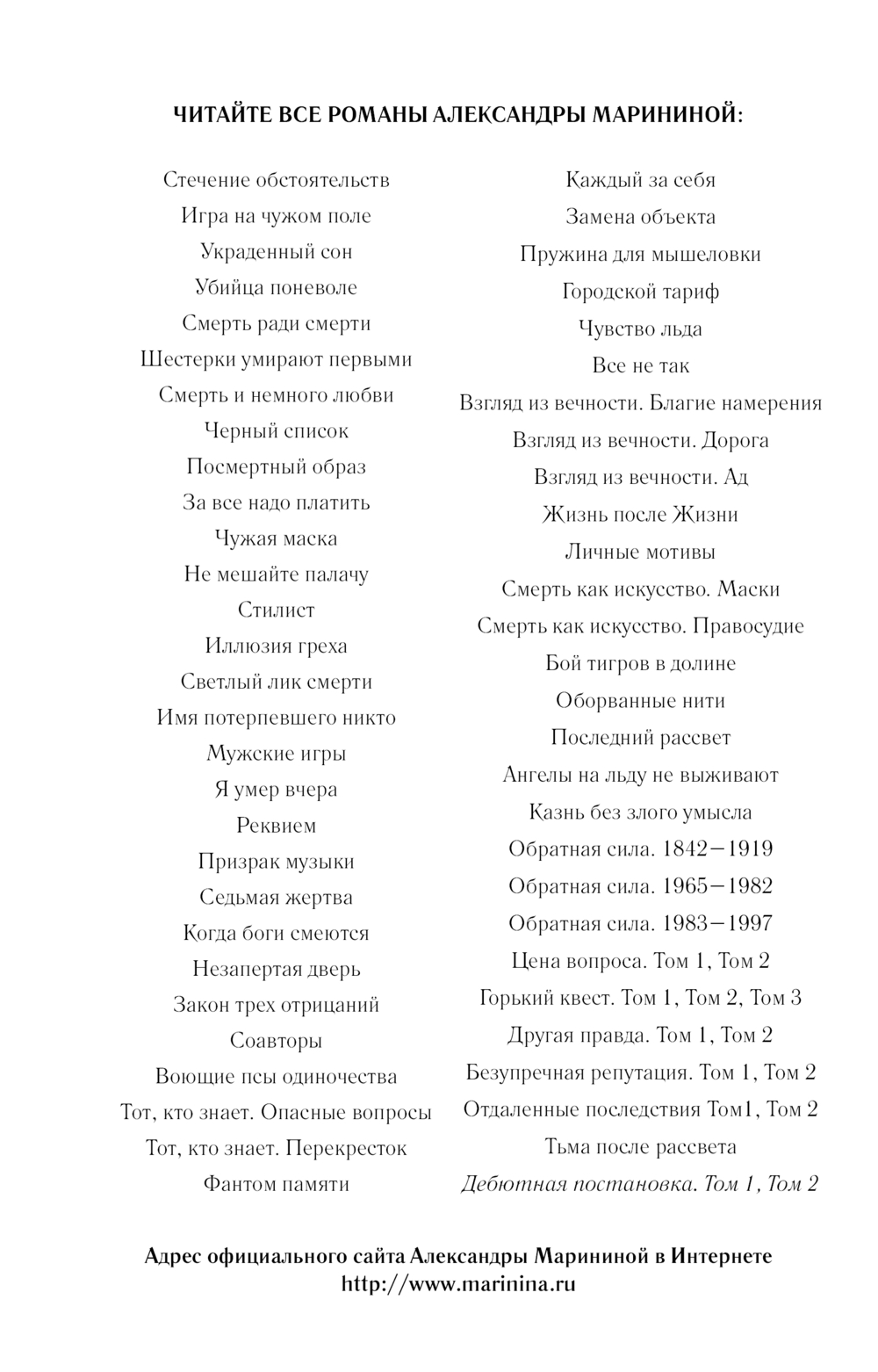 Полвека спустя этим делом увлекся молодой журналист Петр Кравченко. Легендарная Анастасия Каменская, оперативник в отставке, помогает ему установить контакты с людьми, причастными к тем давним событиям и способным раскрыть мрачные секреты прошлого...