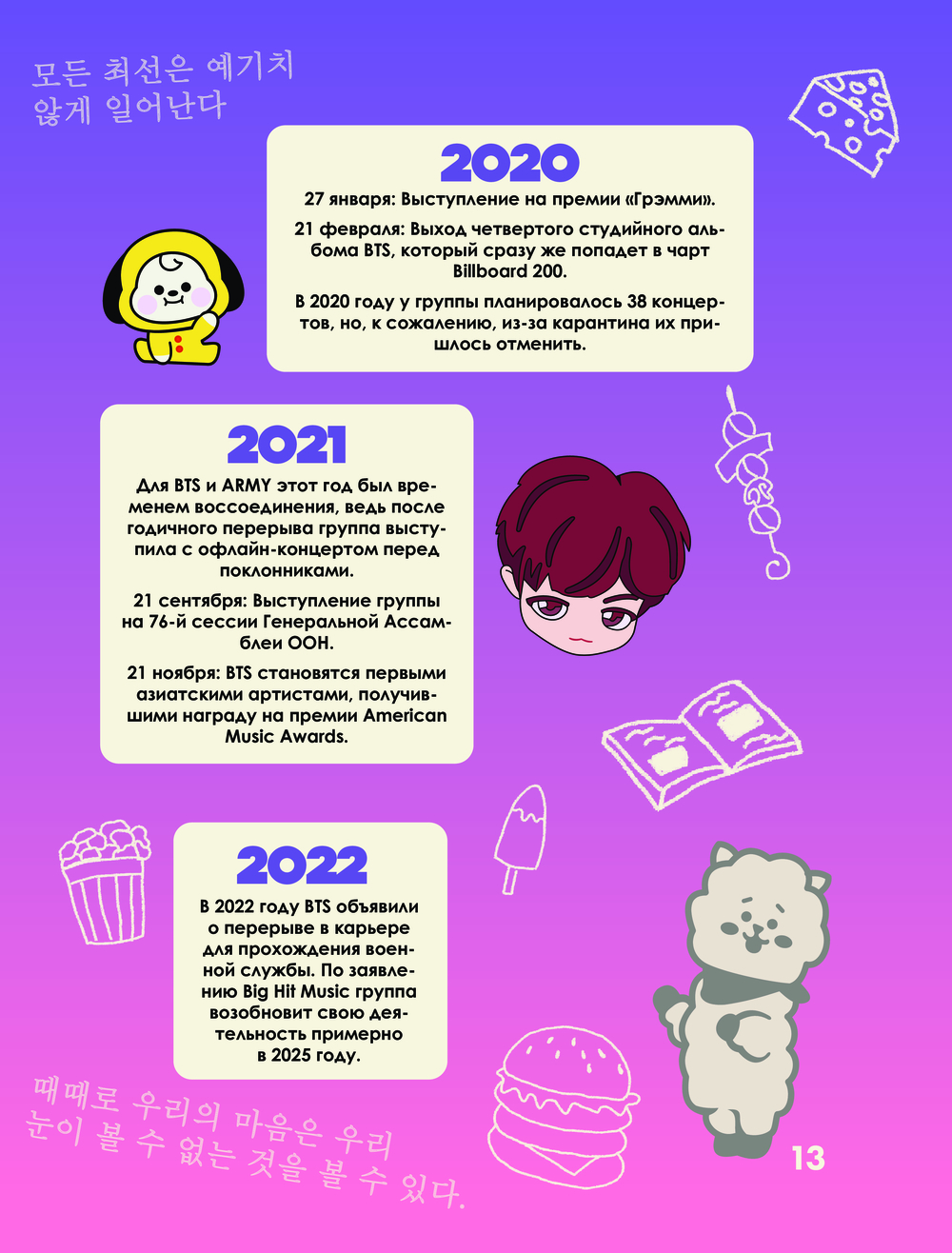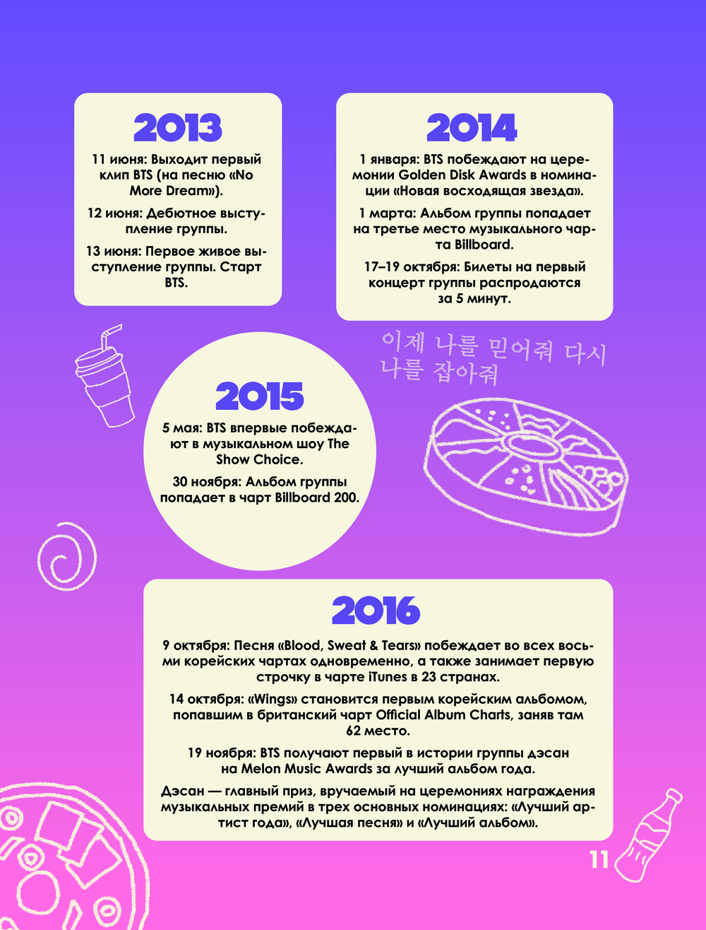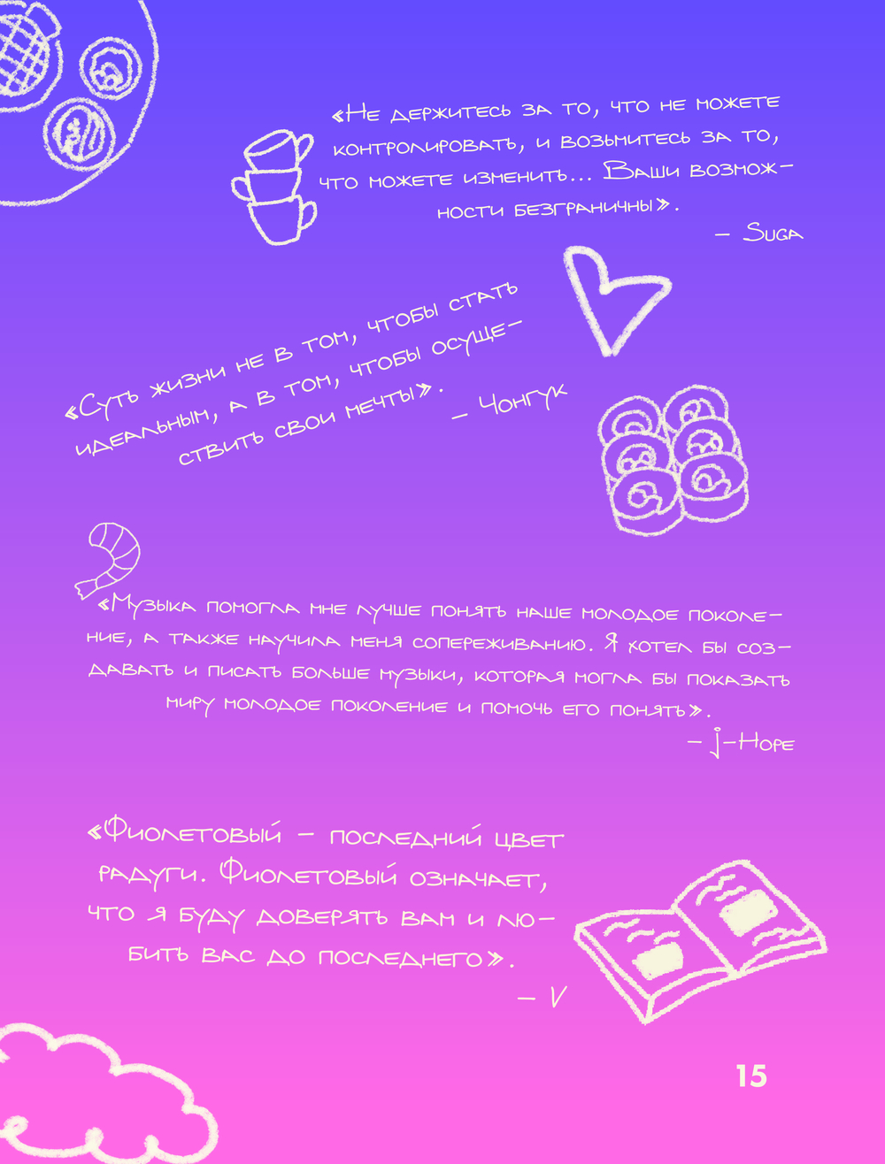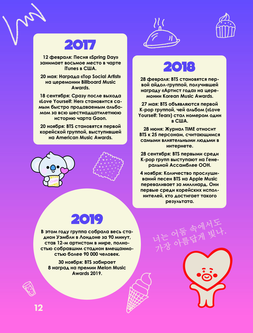 Книга для тех, кто следил за всеми фанколами, Vlive, подписан на BTS во всех соцсетях и помнит, в каком конкретно выпуске Bangtan Bomb Джин вспоминал про суп из ребрышек! В общем, книга для настоящих ARMY, а значит, для вас!